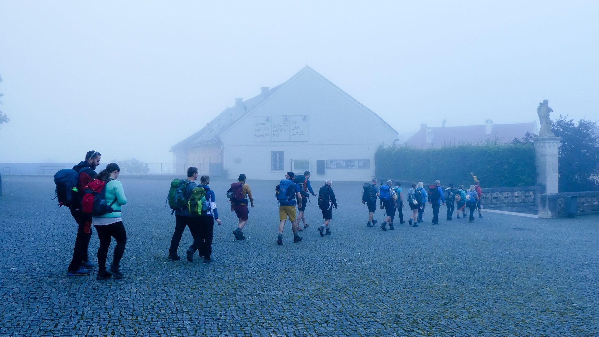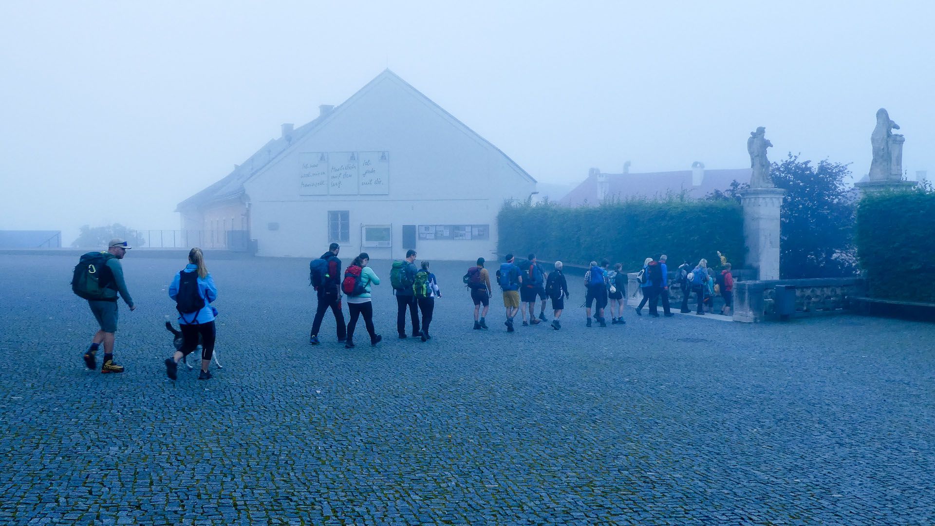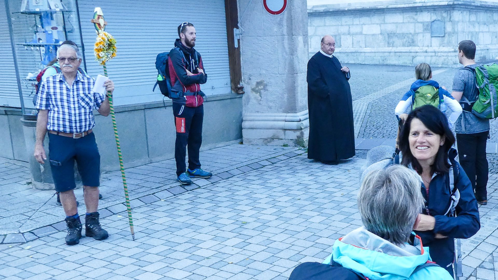 Pünktlich um 6:00 Uhr früh war es auch heuer wieder soweit: Der Mariazeller Stadtpfarrer P. Christoph Pecolt erteilte den diesmal 21 Fußwallfahrern in der Basilika den Reisesegen, ebenso segnete er eine Kopie der Mariazeller Gnadenstatue, die uns auf unserem Weg begleiten sollte.