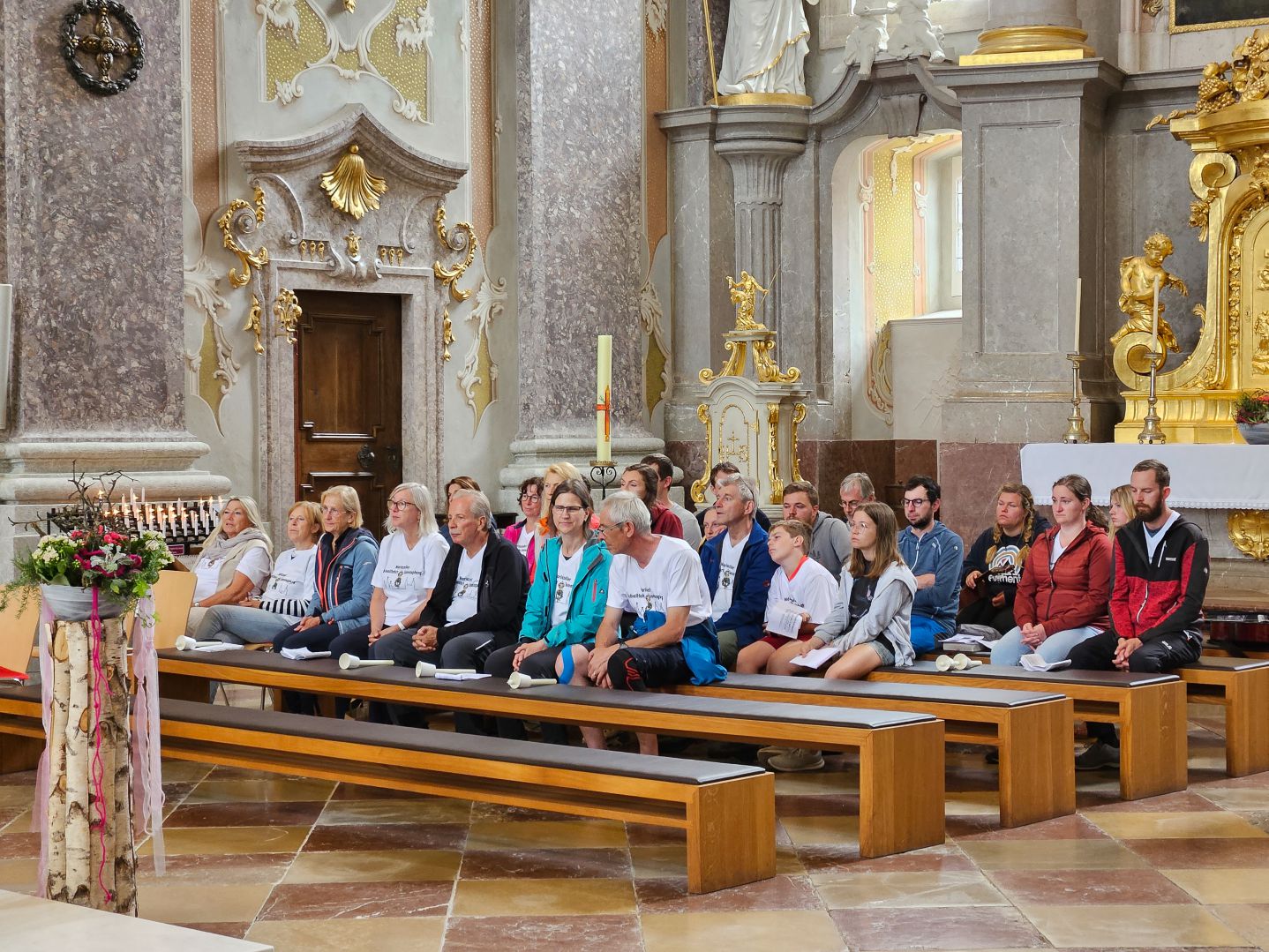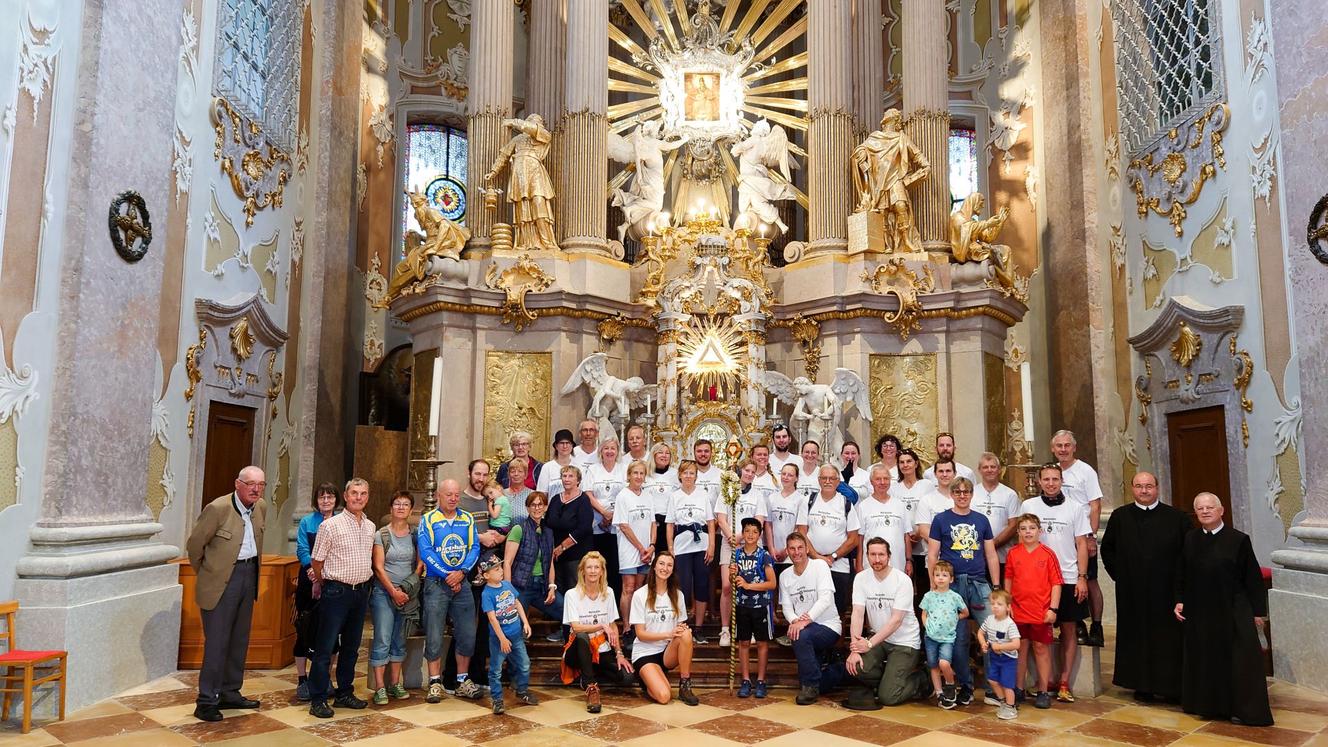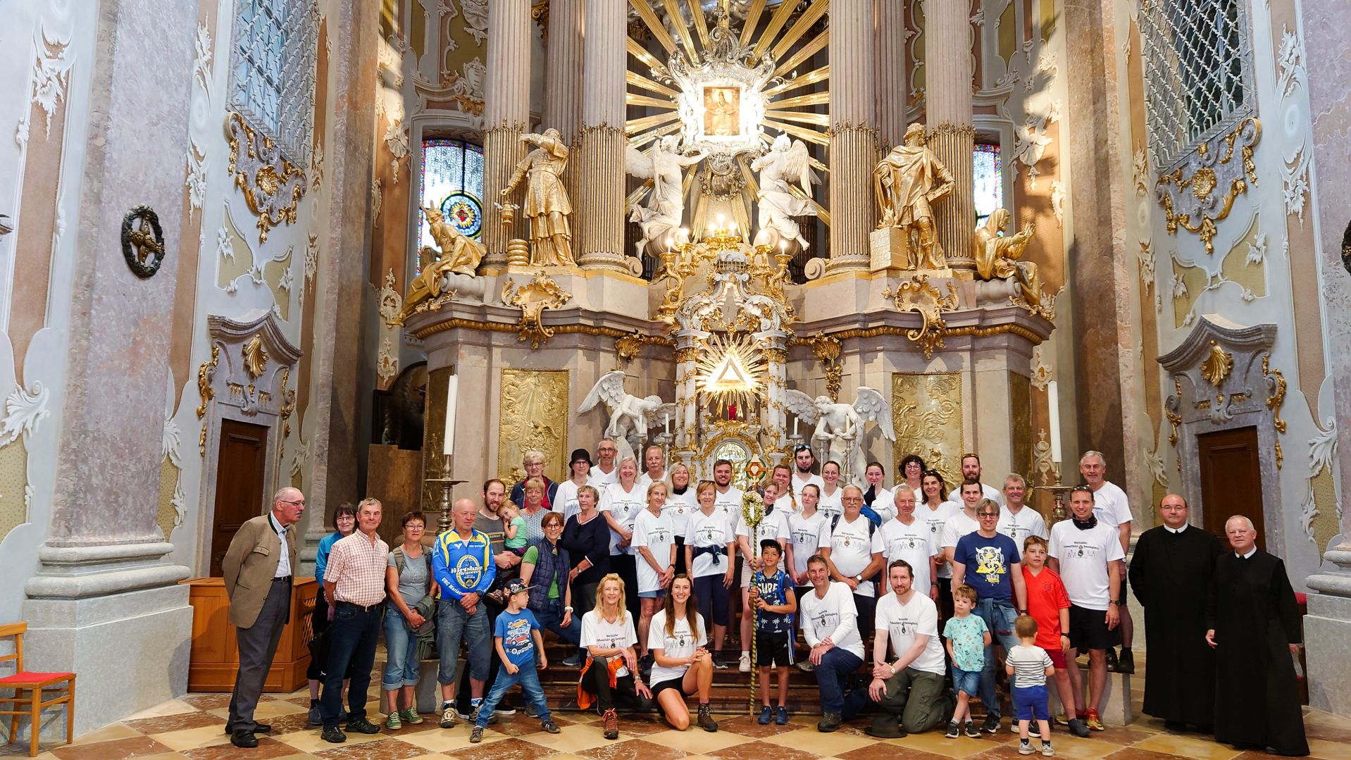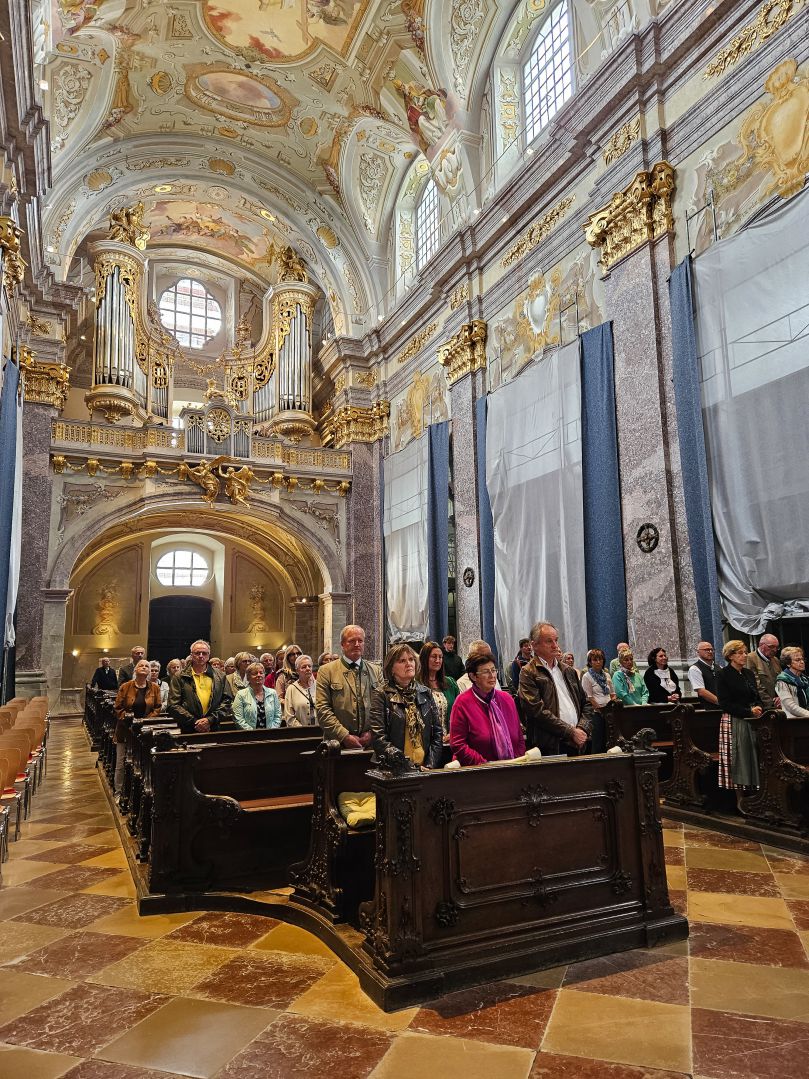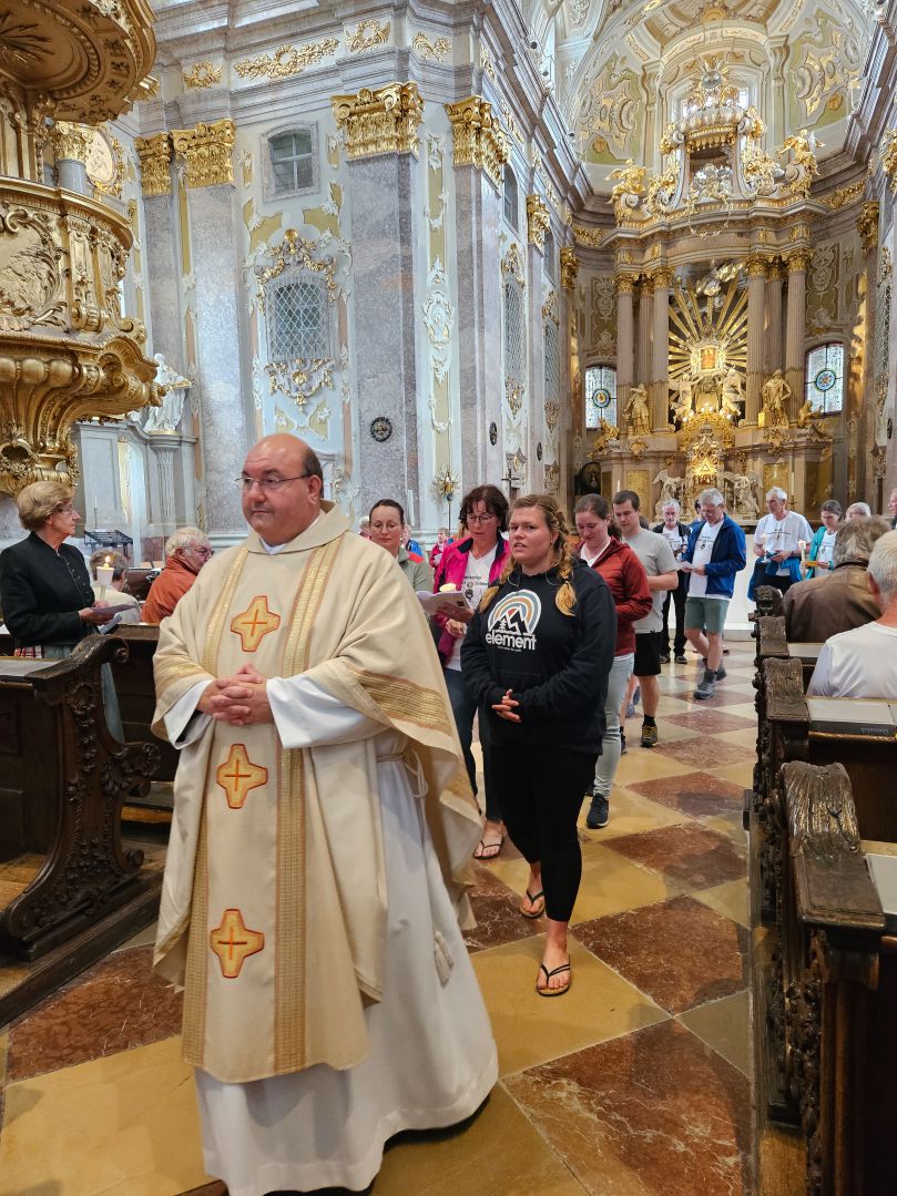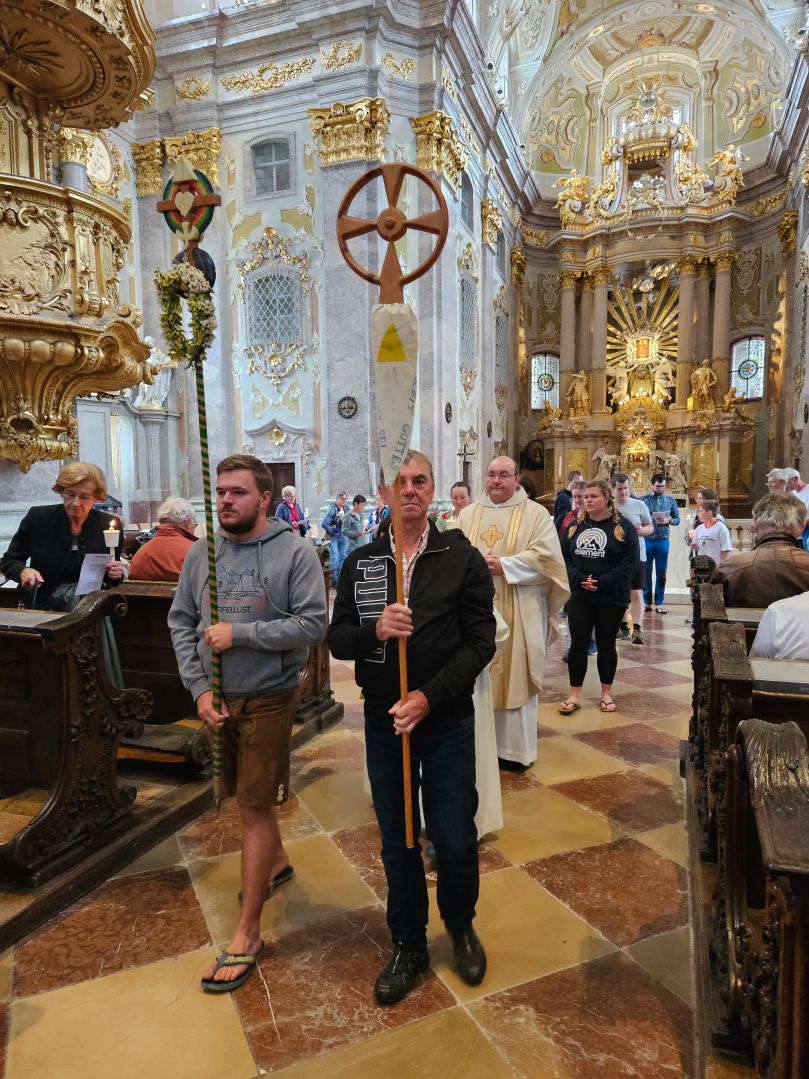 Nach einer herzlichen Begrüßung durch den Superior ging es zum Mittagessen ins Gasthaus Lagler. Gemeinsam mit weiteren Wallfahrern aus Mariazell, die die gesamte Strecke am Montag mit dem Fahrrad oder auch im privaten PKW zurückgelegt hatten, feierten wir nach einem Mittagessen dann um 16:00 Uhr den Gottesdienst, der heuer vom MGV Alpenland musikalisch mitgestaltet wurde, gefolgt von der Lichterprozession rund um die Basilika.