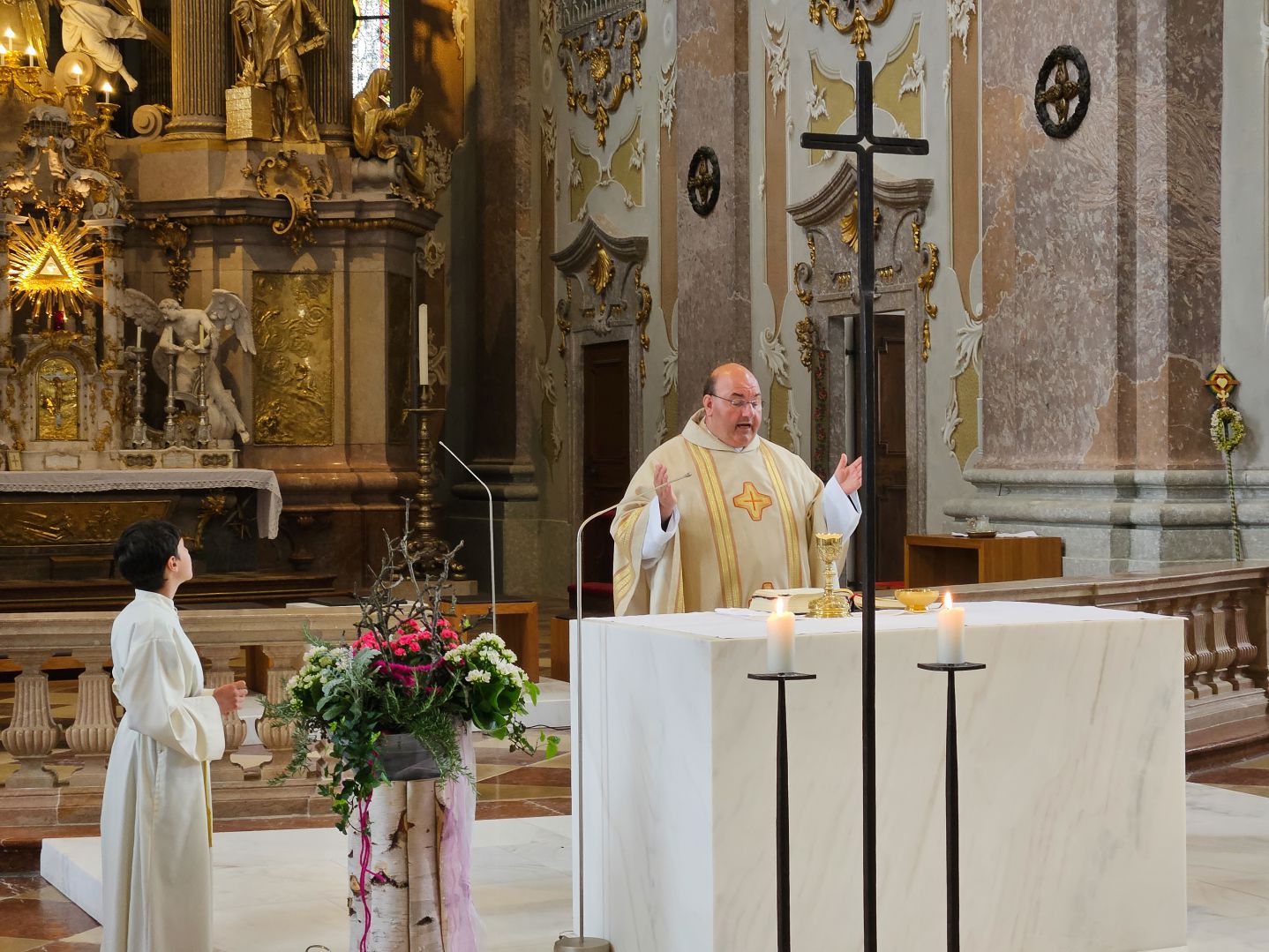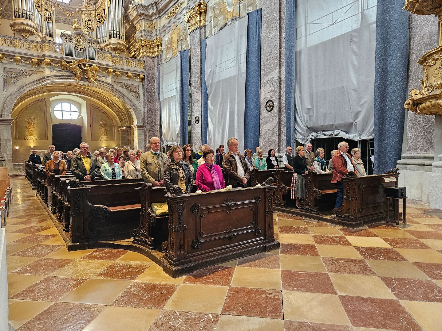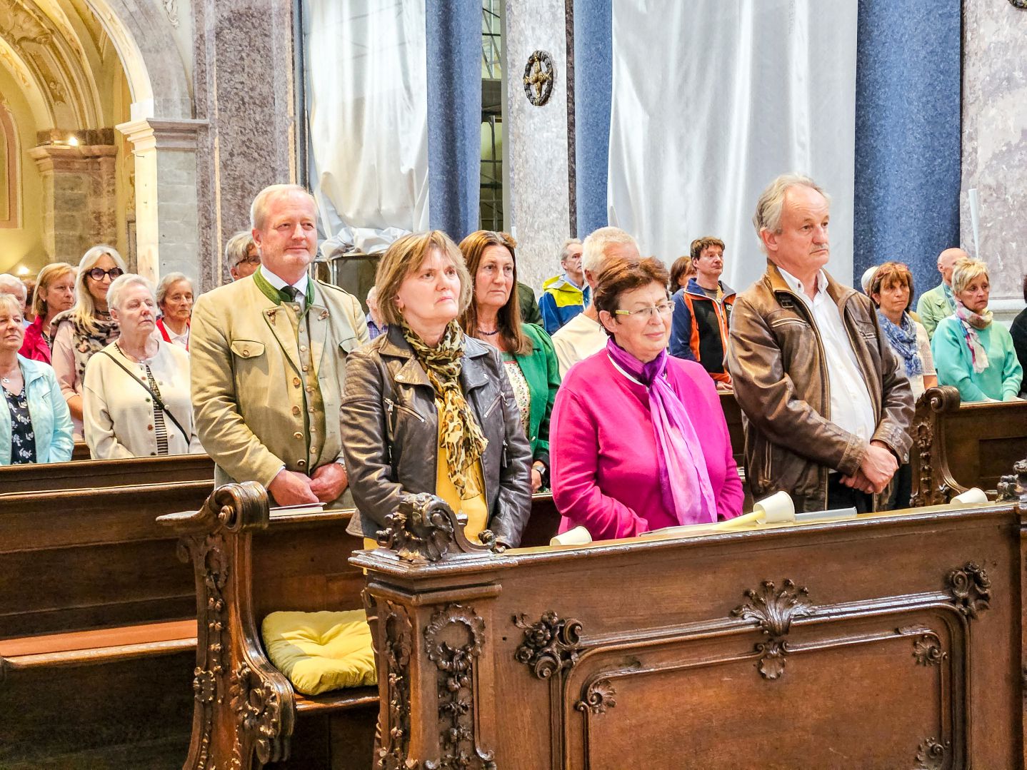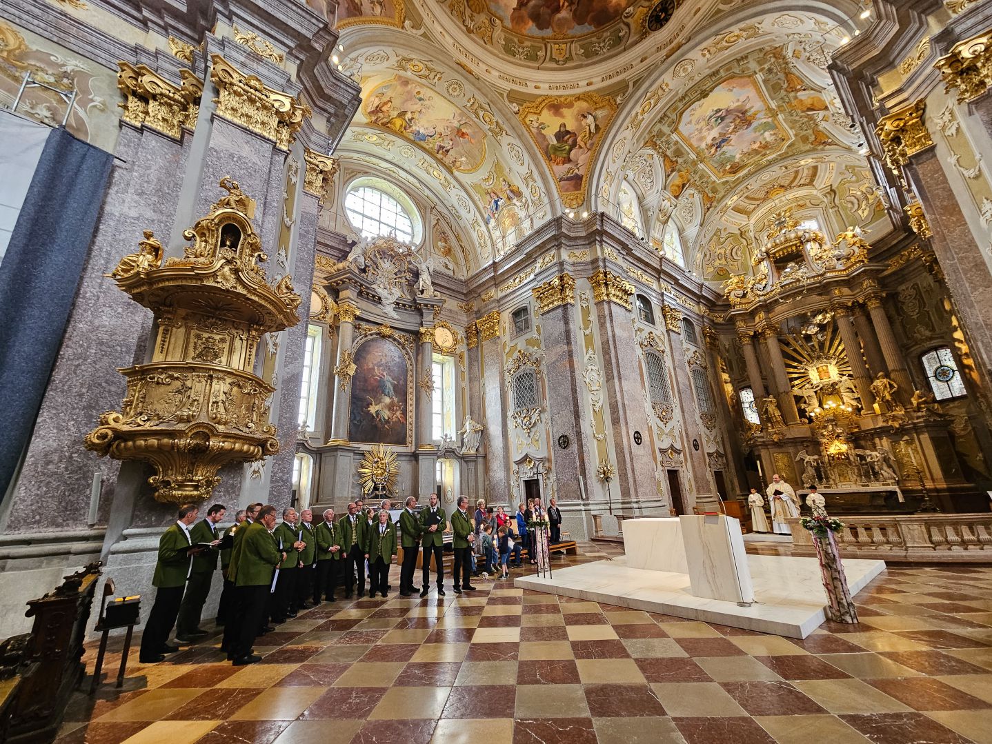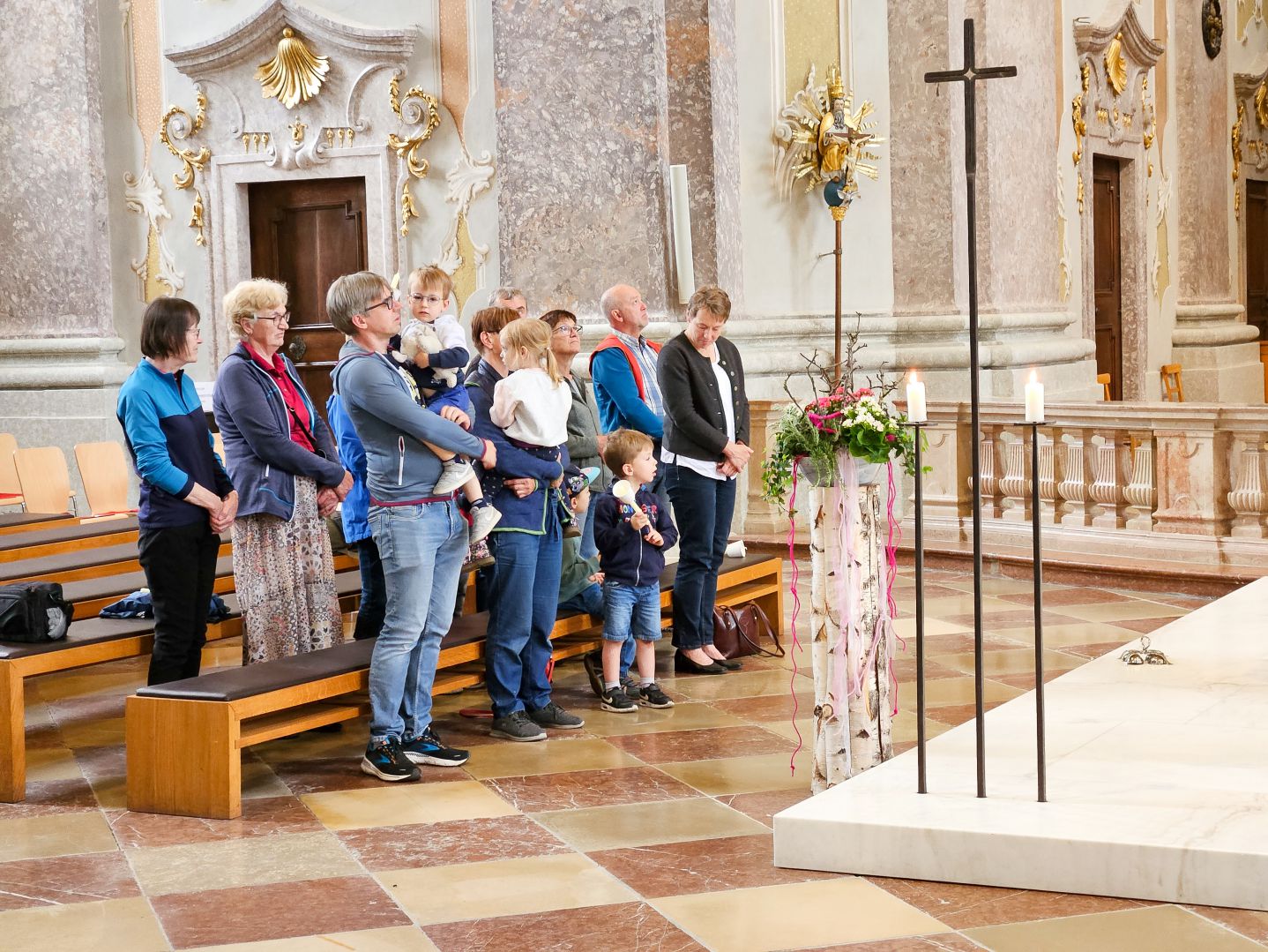 Nach einer herzlichen Begrüßung durch den Superior ging es zum Mittagessen ins Gasthaus Lagler. Gemeinsam mit weiteren Wallfahrern aus Mariazell, die die gesamte Strecke am Montag mit dem Fahrrad oder auch im privaten PKW zurückgelegt hatten, feierten wir nach einem Mittagessen dann um 16:00 Uhr den Gottesdienst, der heuer vom MGV Alpenland musikalisch mitgestaltet wurde, gefolgt von der Lichterprozession rund um die Basilika.