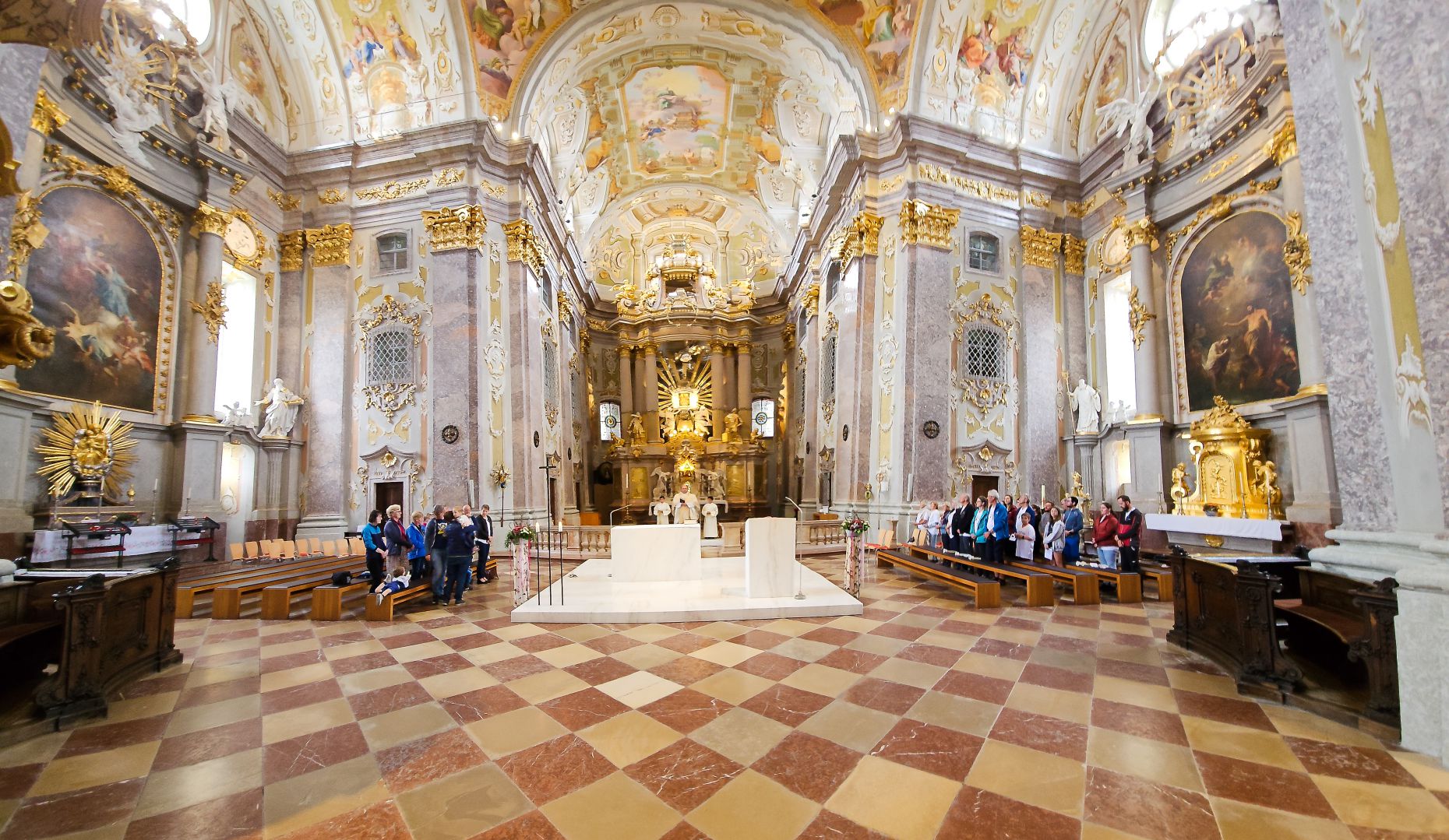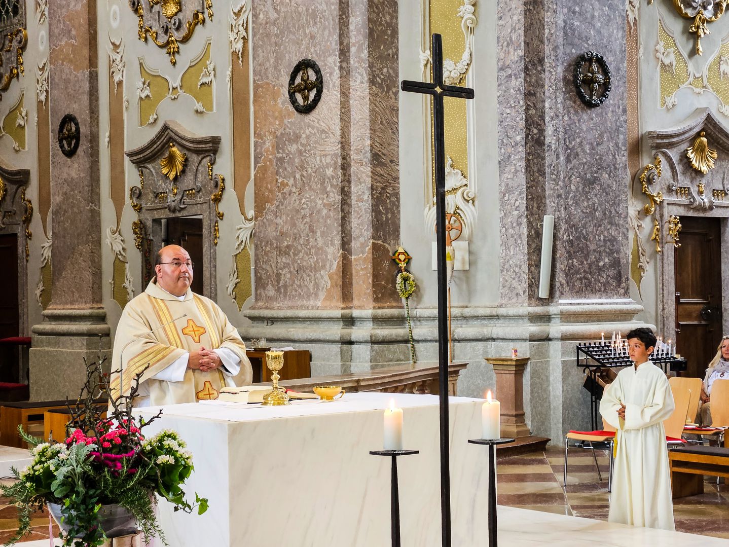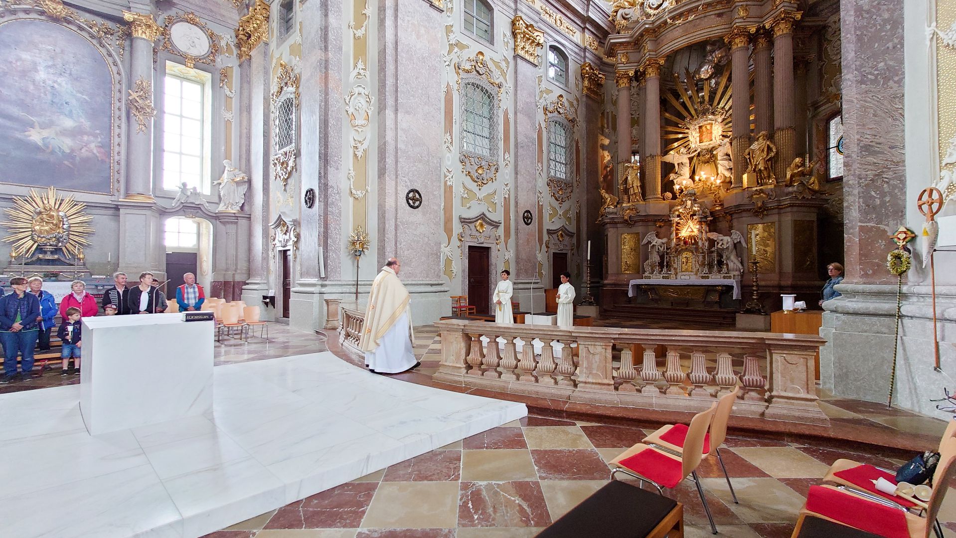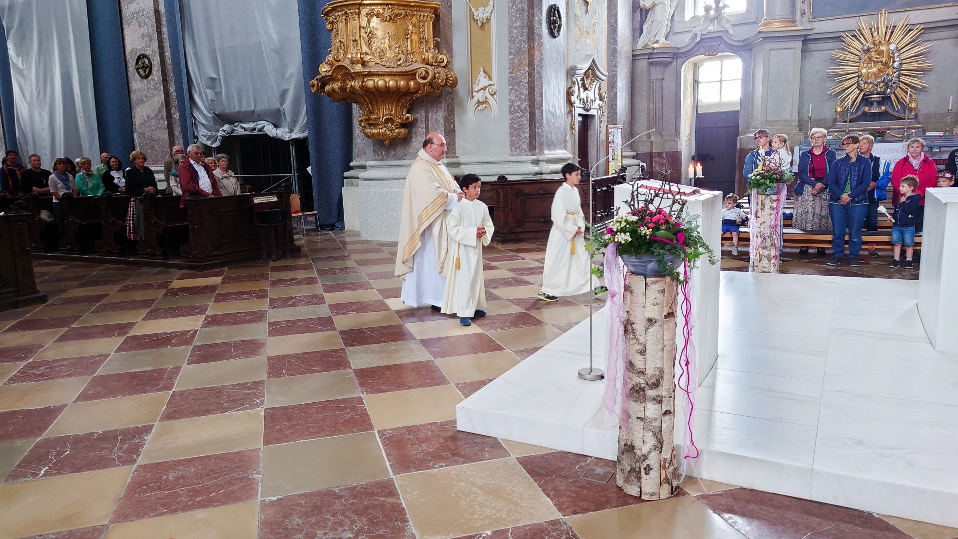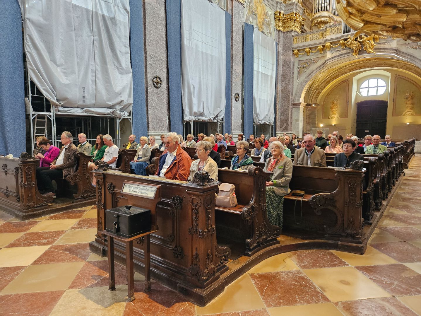 Nach einer herzlichen Begrüßung durch den Superior ging es zum Mittagessen ins Gasthaus Lagler. Gemeinsam mit weiteren Wallfahrern aus Mariazell, die die gesamte Strecke am Montag mit dem Fahrrad oder auch im privaten PKW zurückgelegt hatten, feierten wir nach einem Mittagessen dann um 16:00 Uhr den Gottesdienst, der heuer vom MGV Alpenland musikalisch mitgestaltet wurde, gefolgt von der Lichterprozession rund um die Basilika.