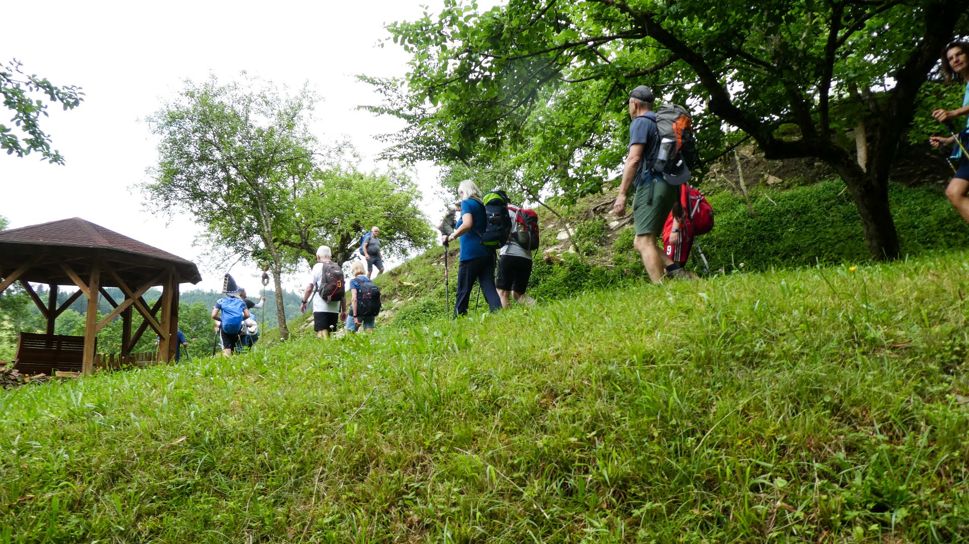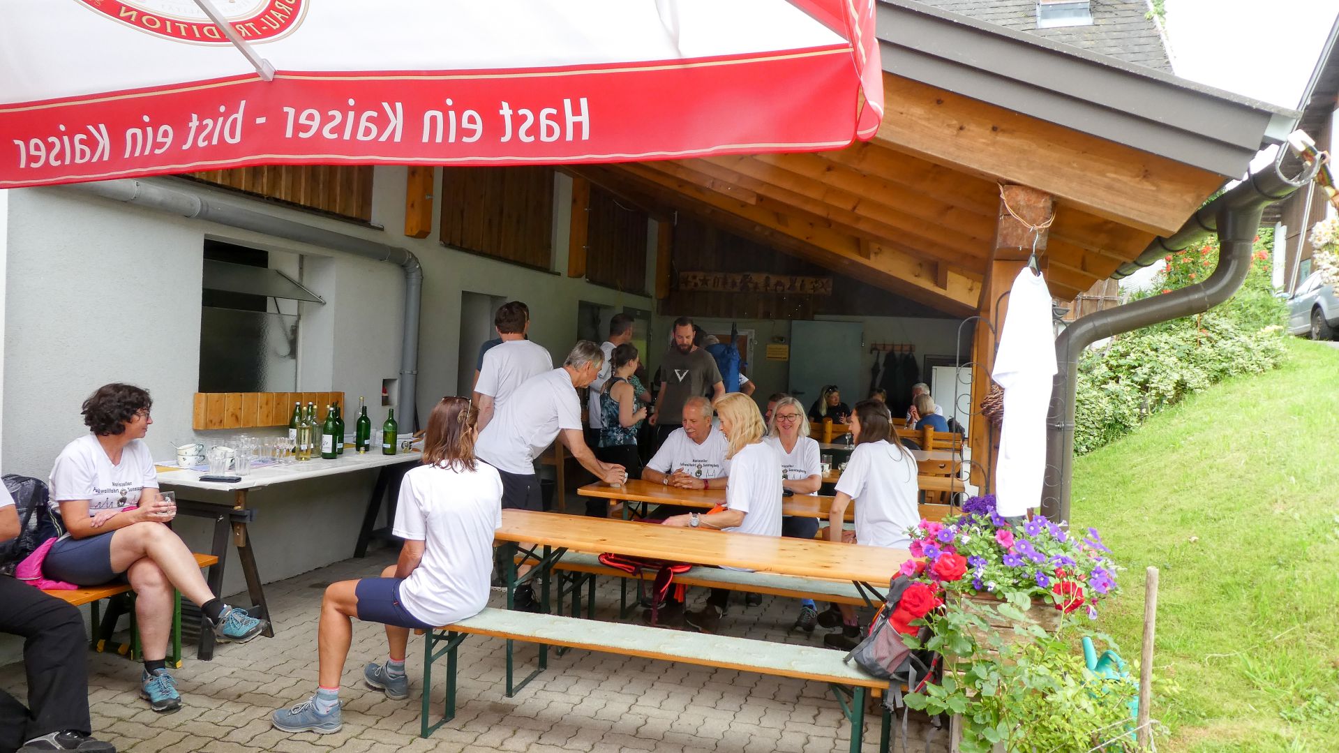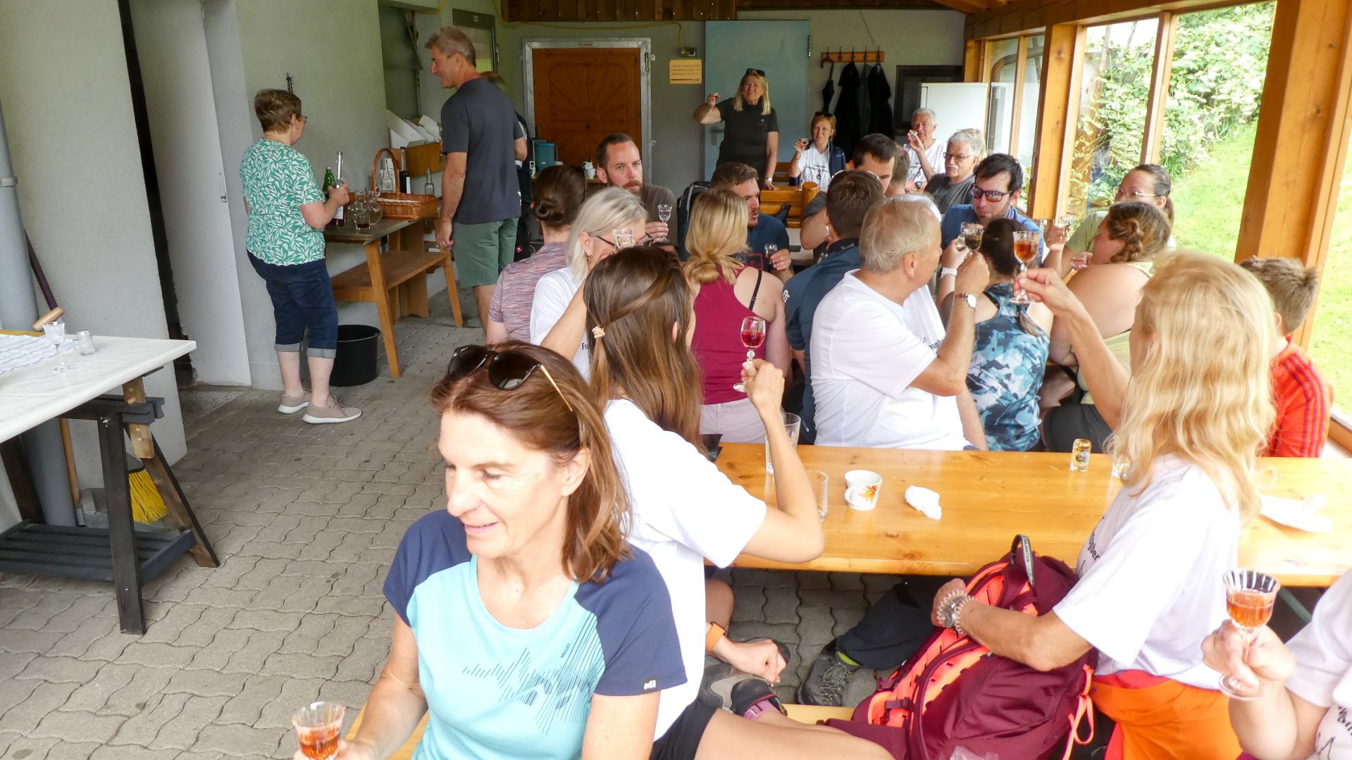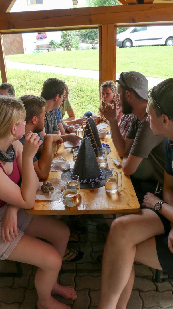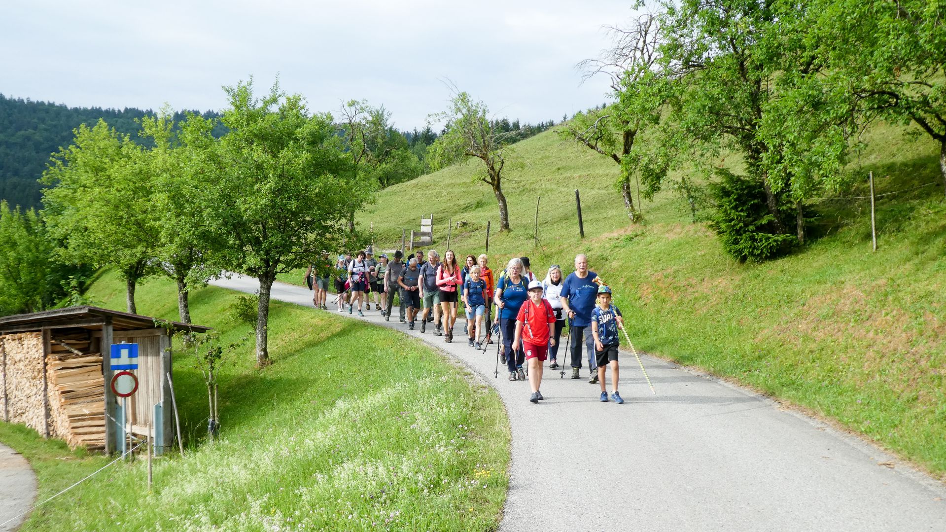 Der nächste Fixpunkt war auch heuer wieder die Rast beim „Mostbauern“. Und schon wie im Vorjahr organisierte Familie Baumgartner süße und knusprige Köstlichkeiten aus der Bäckerei, zum frischen Gebäck wurde Kaffee gekocht und Most und Apfelsaft kredenzt. Da wir etwas Zeitreserve hatten, konnten wir heuer etwas länger sitzen bleiben, bevor wir uns frisch gestärkt wieder auf den Weg machten und oben auf der Kuppe wieder ein Gruppenfoto gemacht wurde.