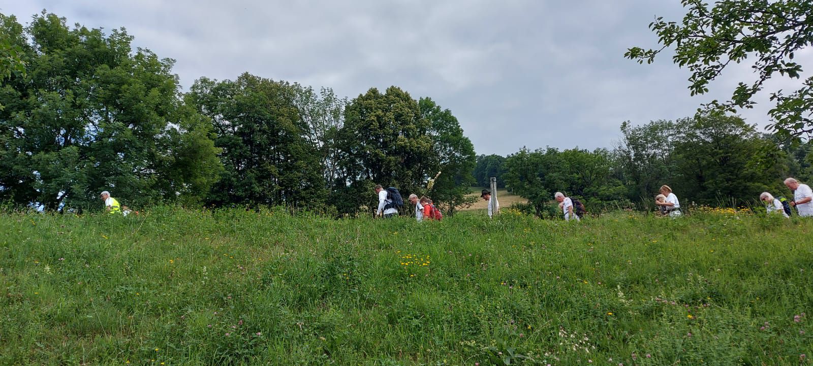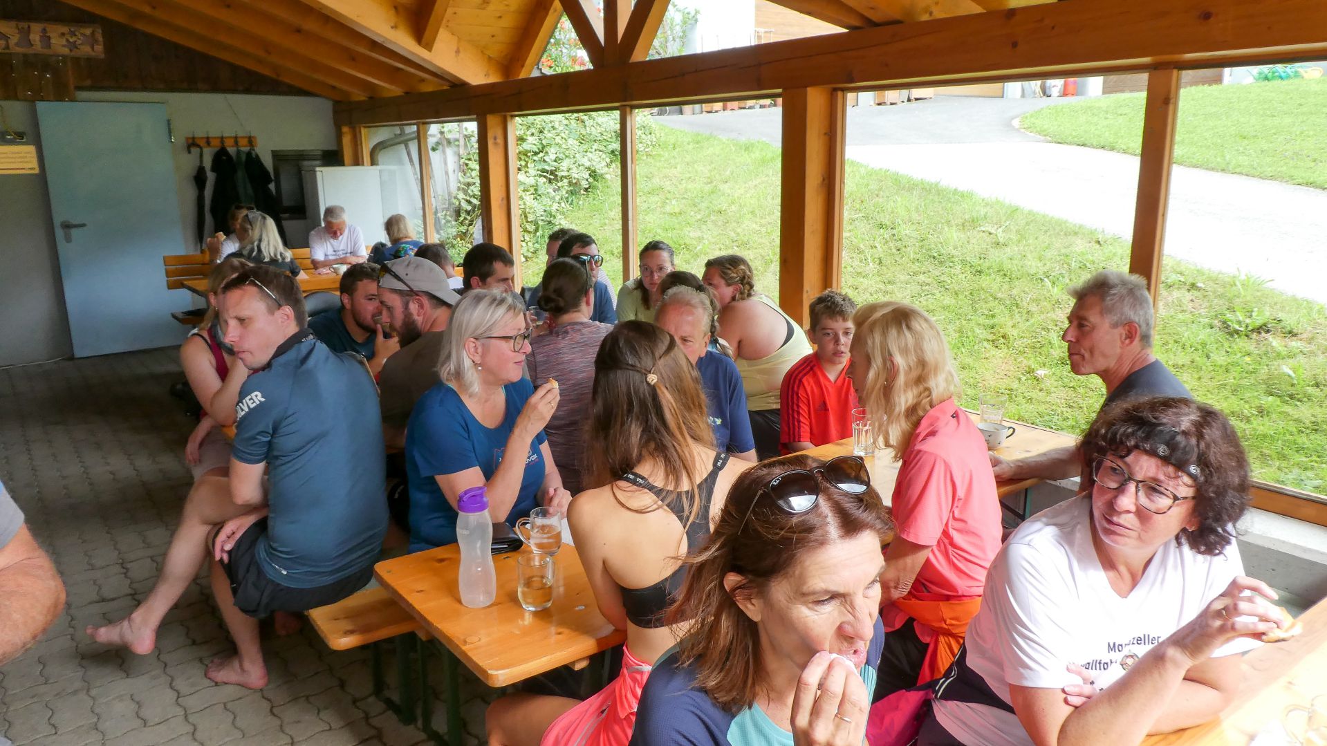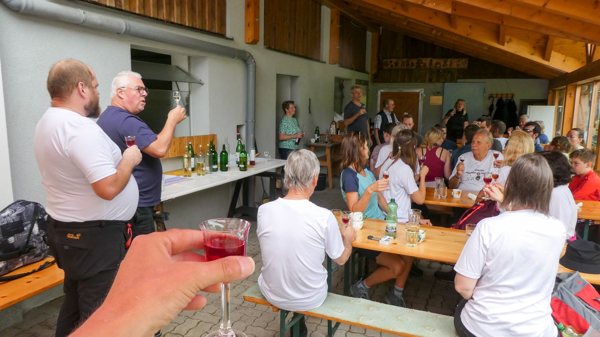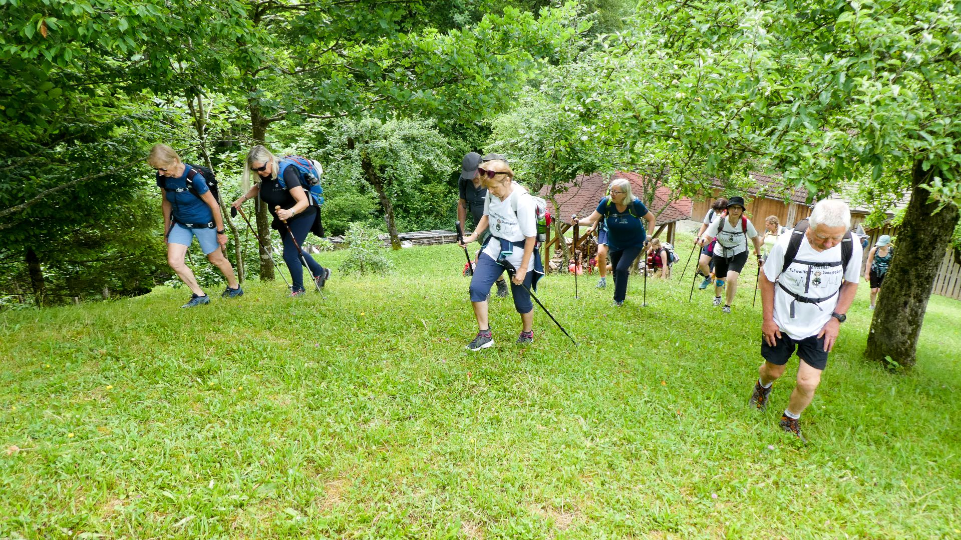 Der nächste Fixpunkt war auch heuer wieder die Rast beim „Mostbauern“. Und schon wie im Vorjahr organisierte Familie Baumgartner süße und knusprige Köstlichkeiten aus der Bäckerei, zum frischen Gebäck wurde Kaffee gekocht und Most und Apfelsaft kredenzt. Da wir etwas Zeitreserve hatten, konnten wir heuer etwas länger sitzen bleiben, bevor wir uns frisch gestärkt wieder auf den Weg machten und oben auf der Kuppe wieder ein Gruppenfoto gemacht wurde.