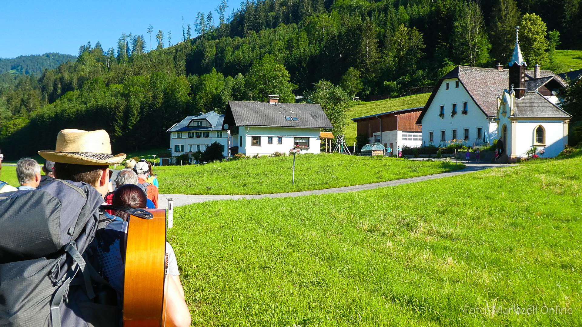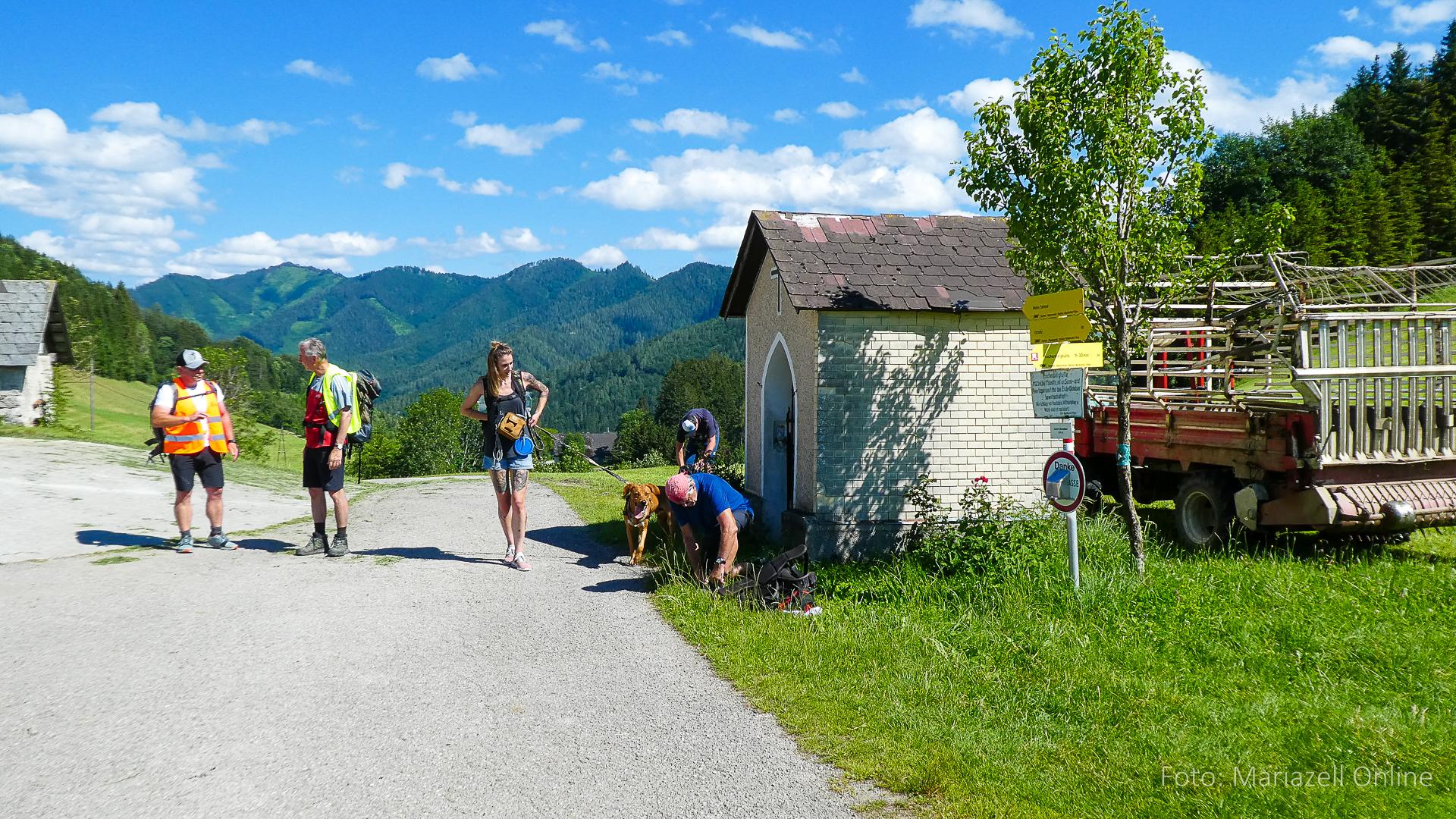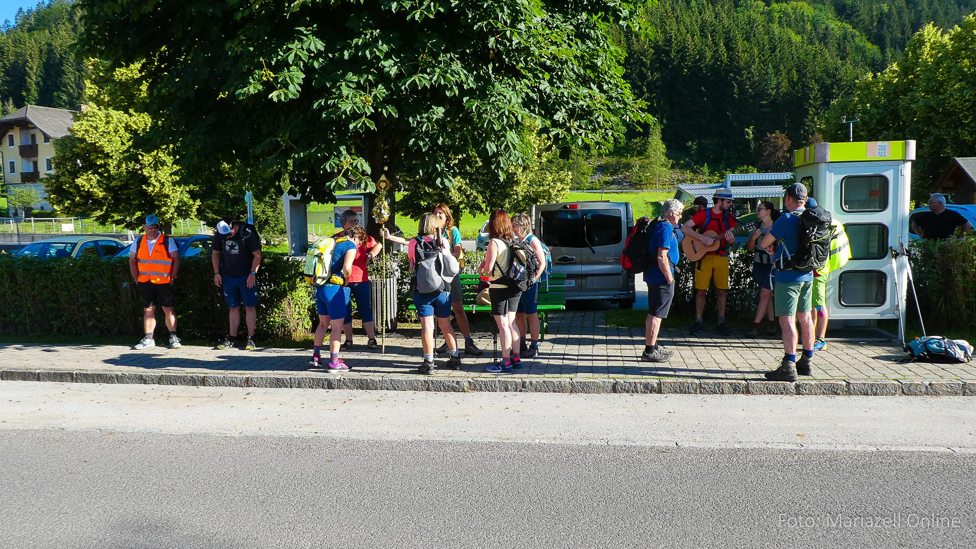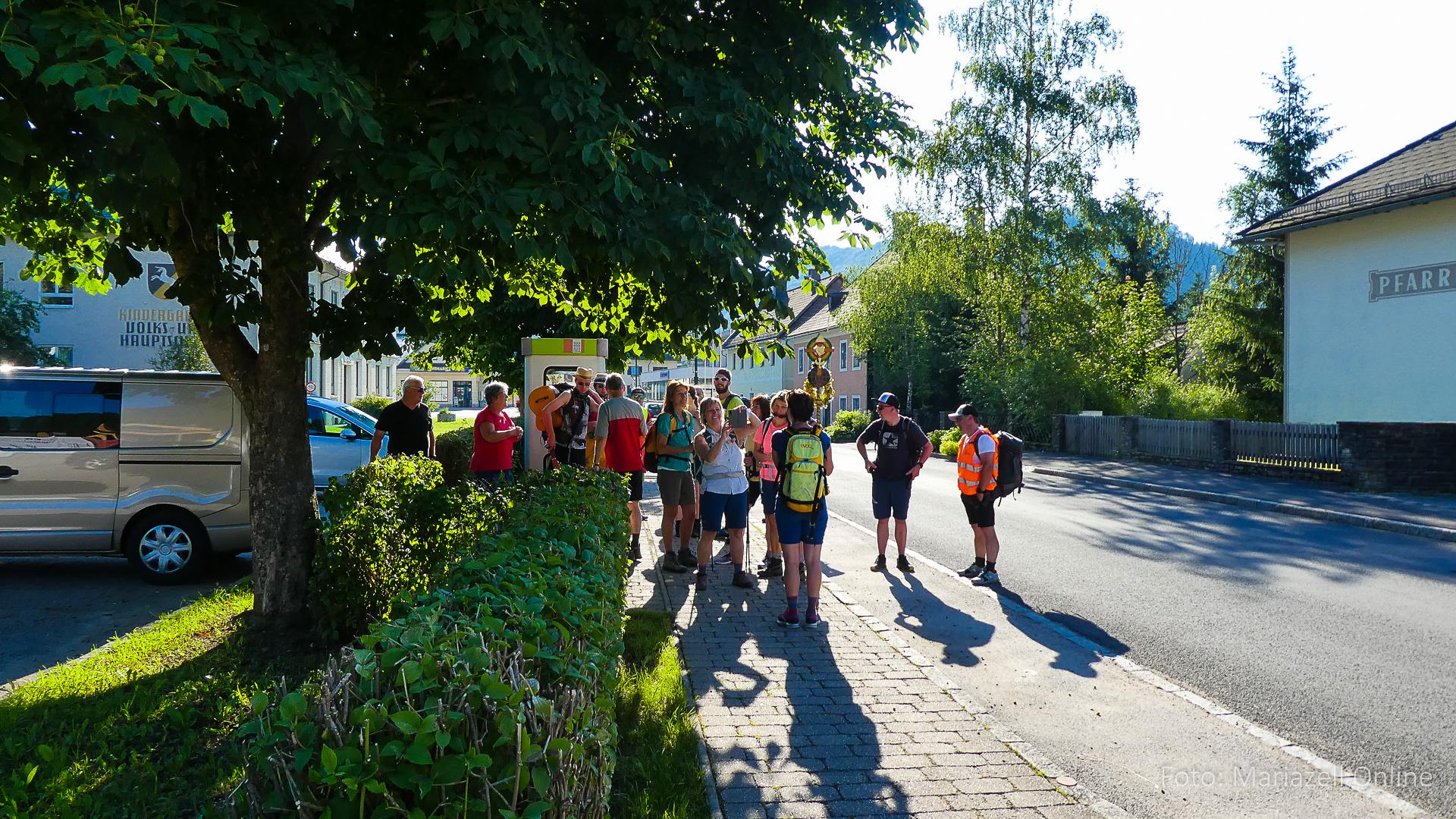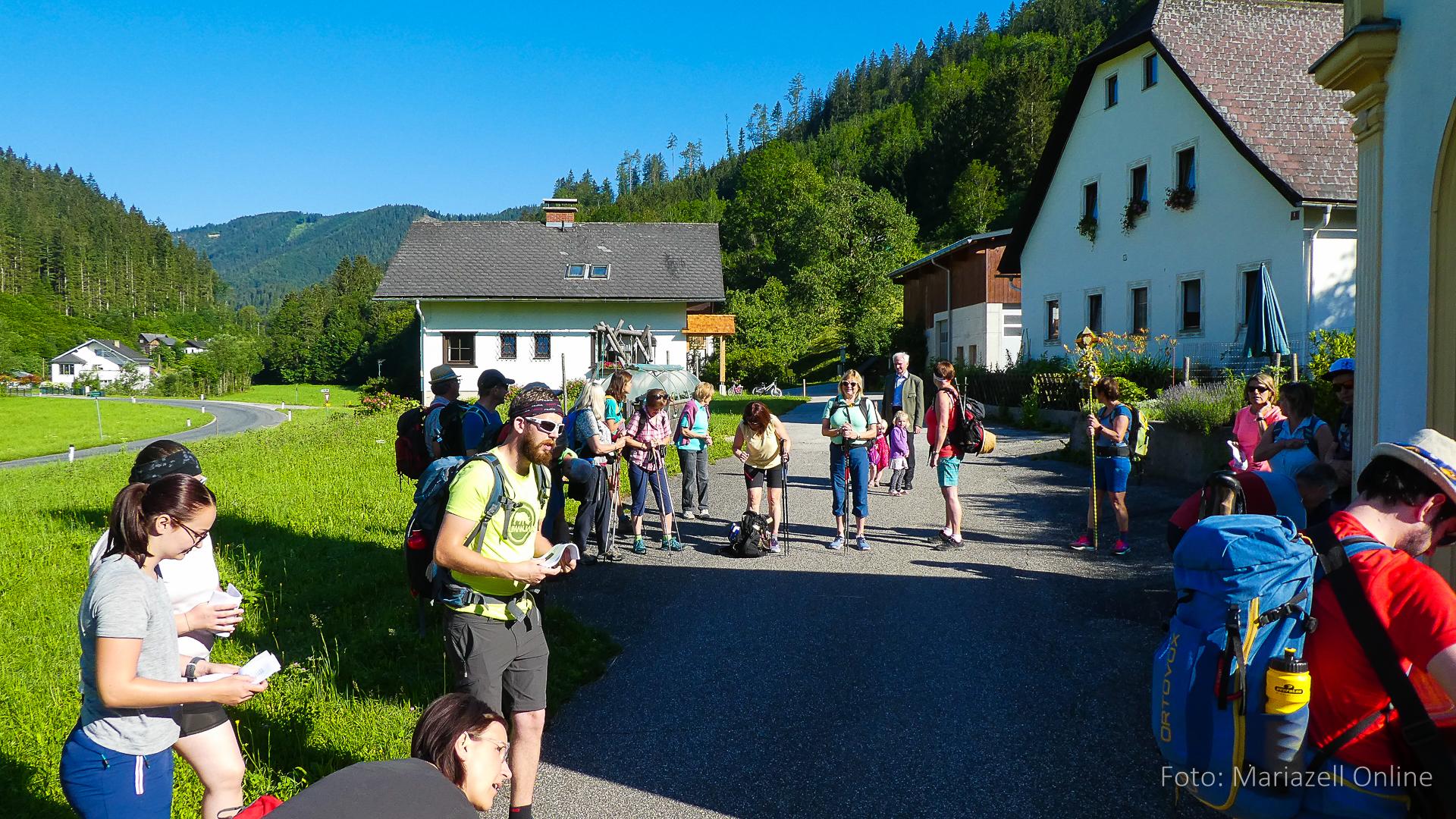 Lunz am See, Pfarrhaus, 7:45 Uhr: Die Gruppe macht sich abmarschbereit, neue Wallfahrer stoßen zur Gruppe, andere setzen einen Tag aus und fahren Im Begleitauto mit, um sich für den dritten Tag zu schonen. Nachdem auch noch die letzten Utensilien aus dem (bereits verschlossenen) Pfarrheim herausgebracht worden waren konnte es logehen. In einer geordneten Zweierreihe ging es – Rosenkranz betend – dem Tal entlang hinauf zum Gasthaus „Zur Paula“, wo auch heuer weitere Wallfahrer genächtigt hatten und bereits auf uns warteten.