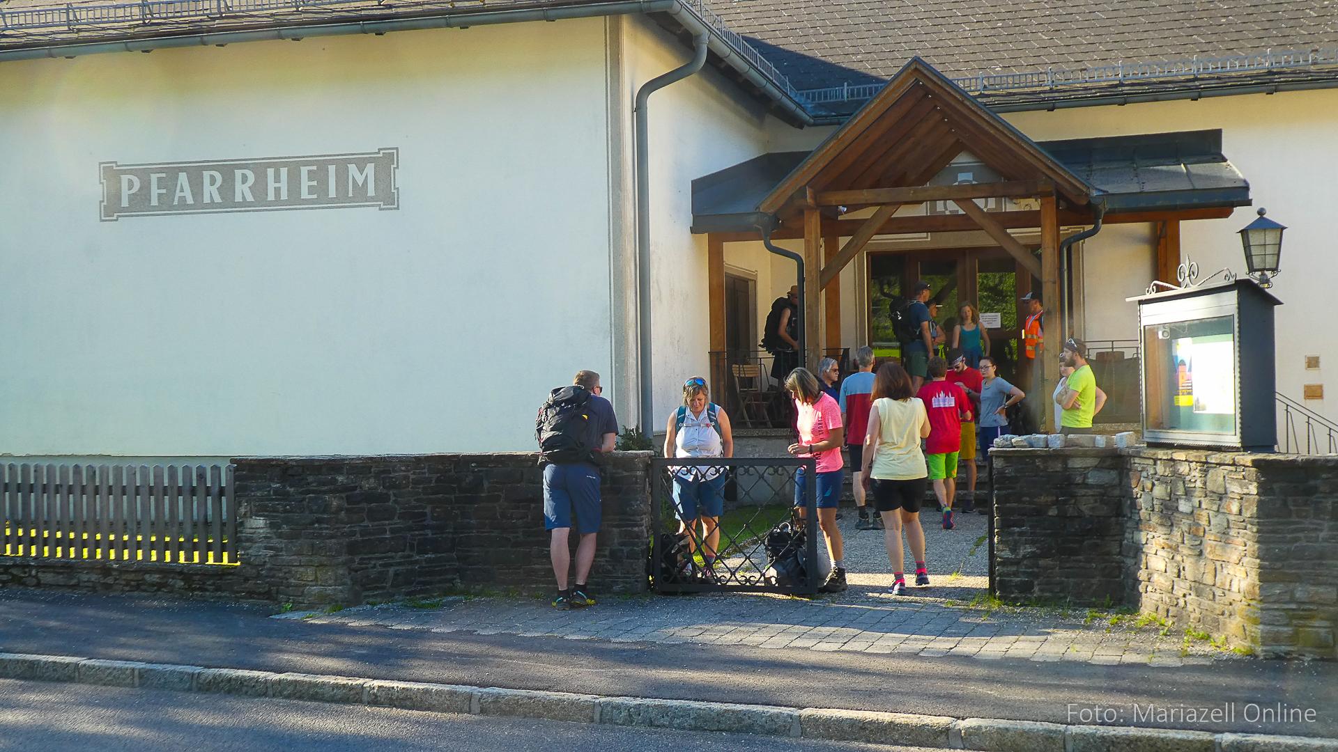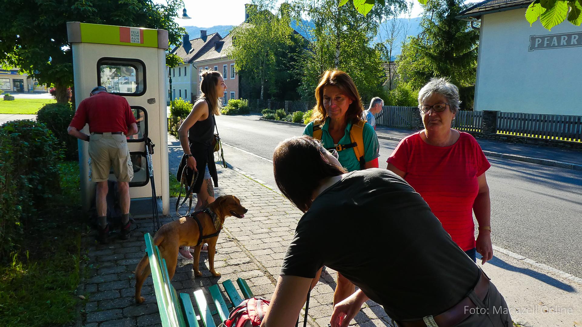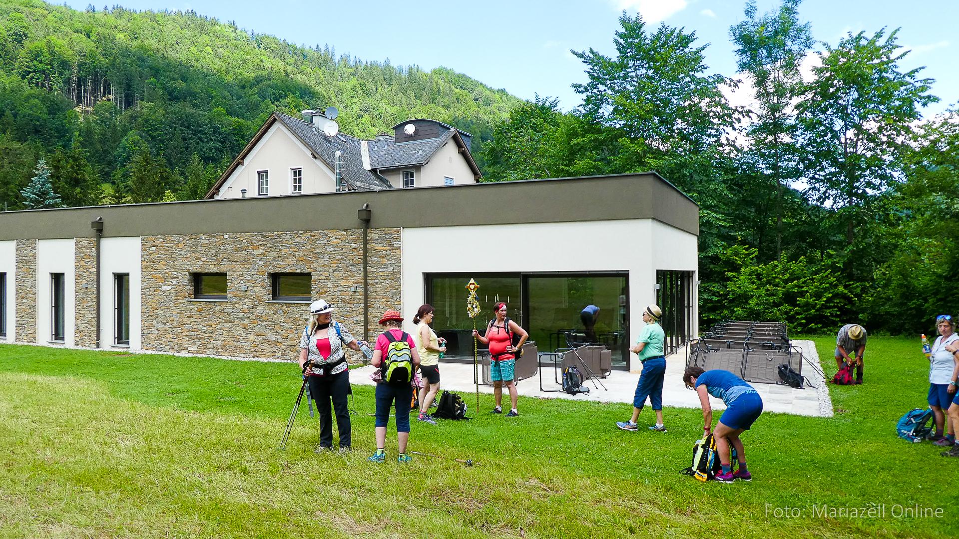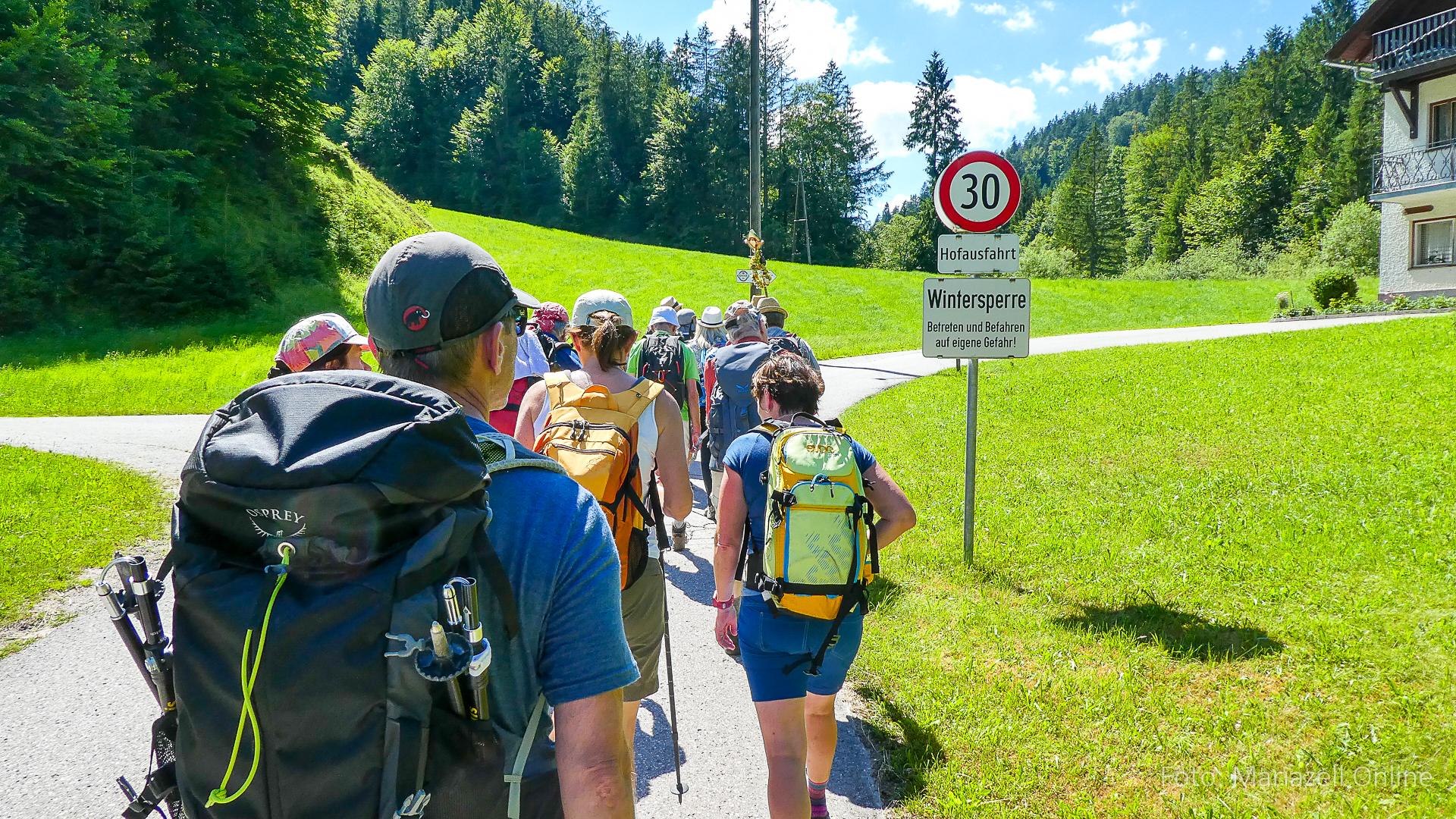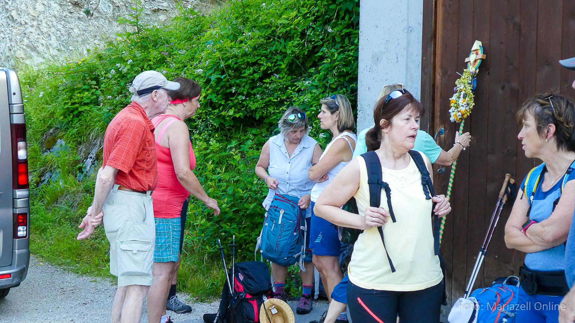 Lunz am See, Pfarrhaus, 7:45 Uhr: Die Gruppe macht sich abmarschbereit, neue Wallfahrer stoßen zur Gruppe, andere setzen einen Tag aus und fahren Im Begleitauto mit, um sich für den dritten Tag zu schonen. Nachdem auch noch die letzten Utensilien aus dem (bereits verschlossenen) Pfarrheim herausgebracht worden waren konnte es logehen. In einer geordneten Zweierreihe ging es – Rosenkranz betend – dem Tal entlang hinauf zum Gasthaus „Zur Paula“, wo auch heuer weitere Wallfahrer genächtigt hatten und bereits auf uns warteten.