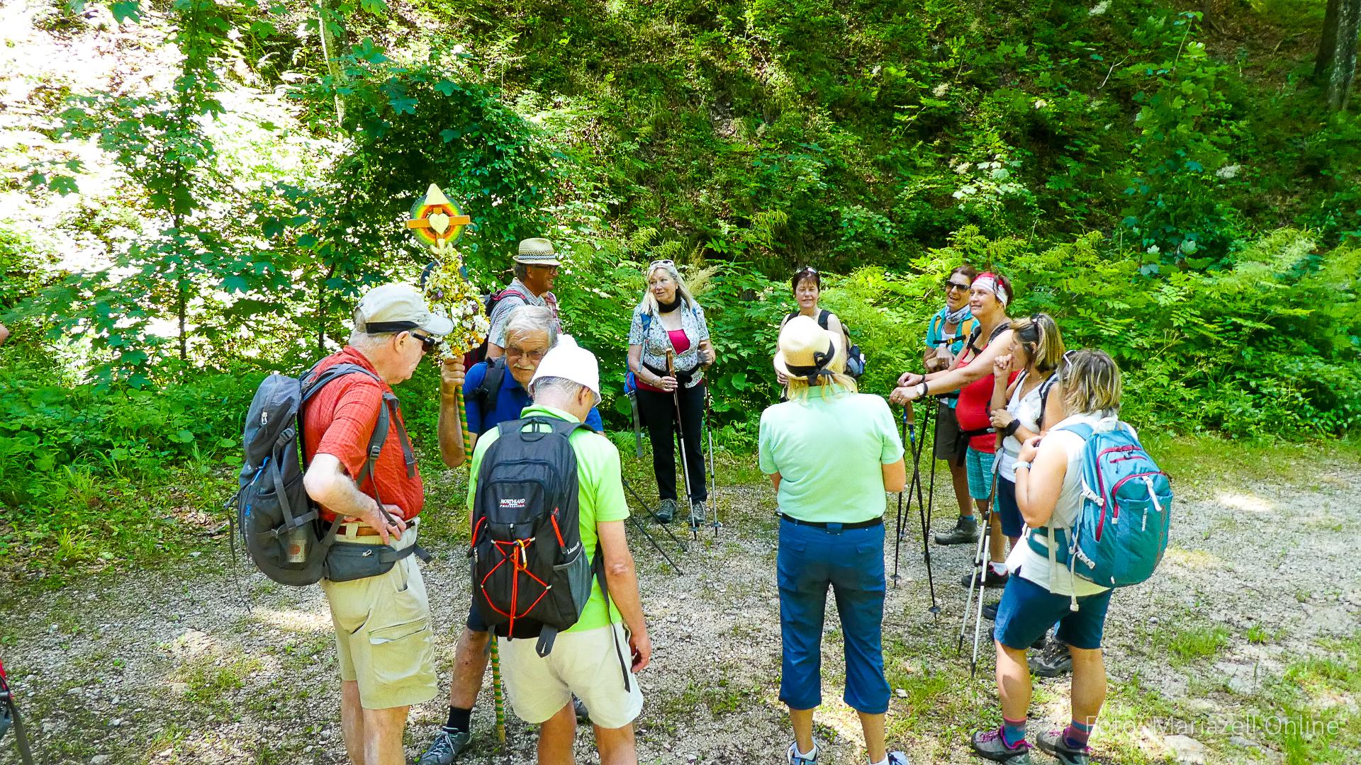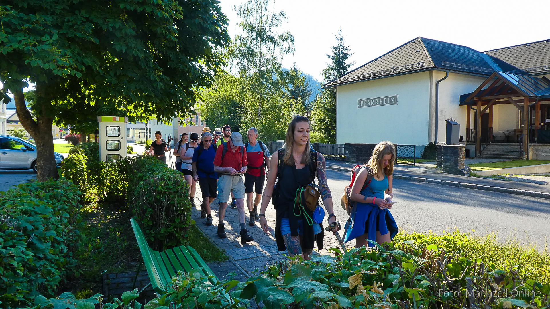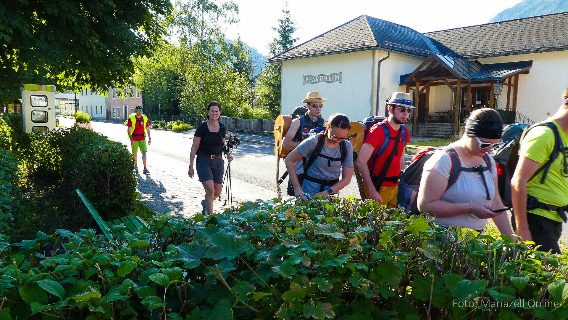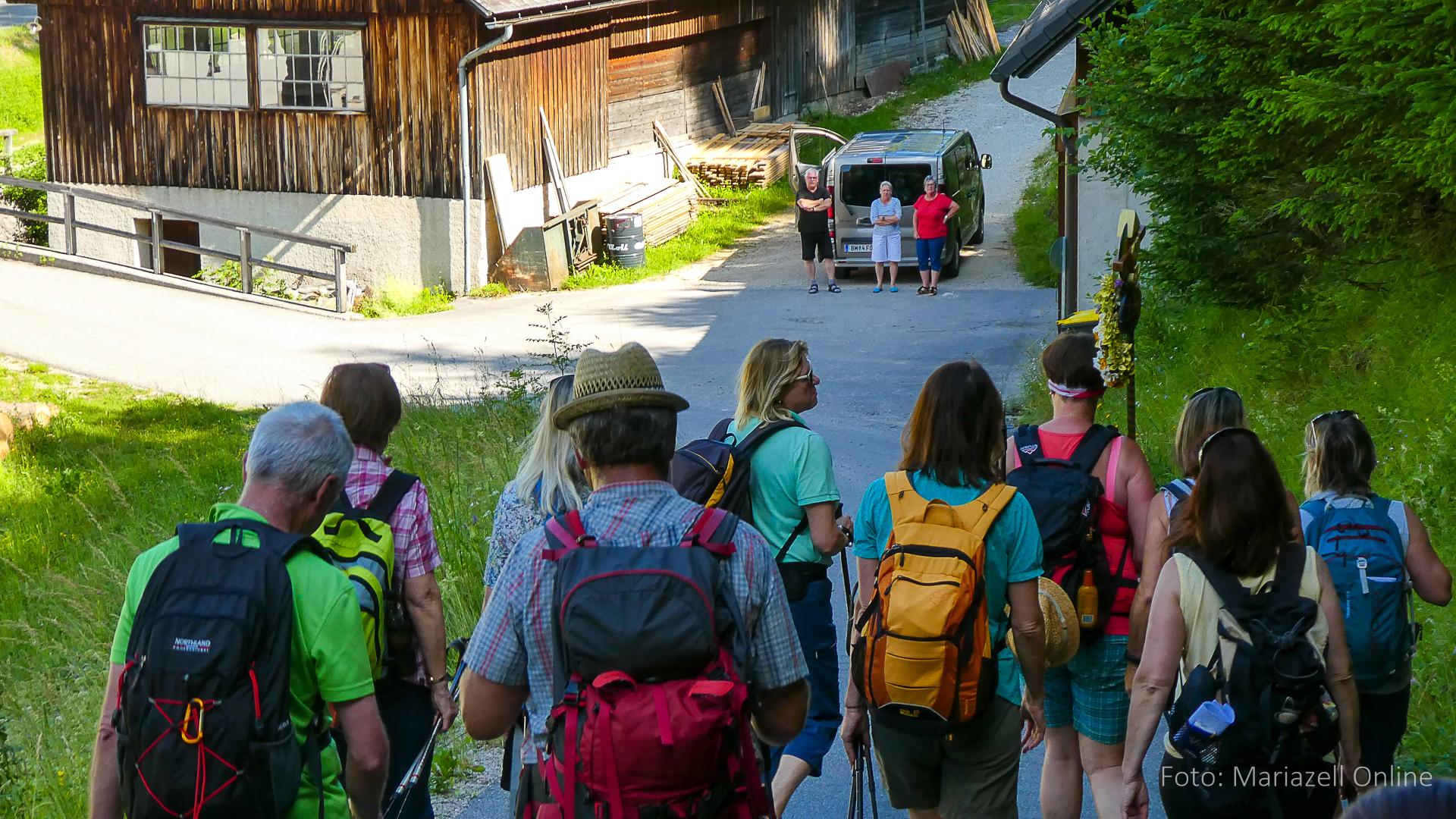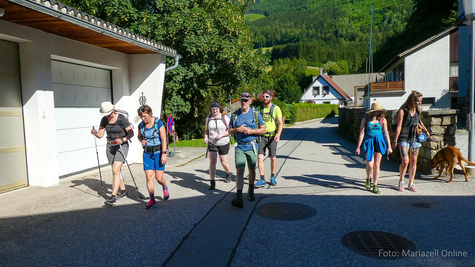 Lunz am See, Pfarrhaus, 7:45 Uhr: Die Gruppe macht sich abmarschbereit, neue Wallfahrer stoßen zur Gruppe, andere setzen einen Tag aus und fahren Im Begleitauto mit, um sich für den dritten Tag zu schonen. Nachdem auch noch die letzten Utensilien aus dem (bereits verschlossenen) Pfarrheim herausgebracht worden waren konnte es logehen. In einer geordneten Zweierreihe ging es – Rosenkranz betend – dem Tal entlang hinauf zum Gasthaus „Zur Paula“, wo auch heuer weitere Wallfahrer genächtigt hatten und bereits auf uns warteten.