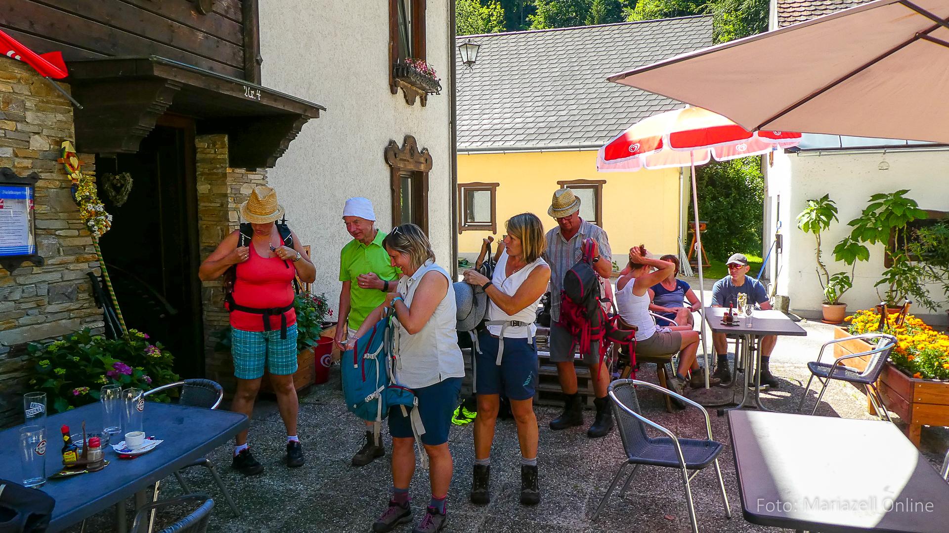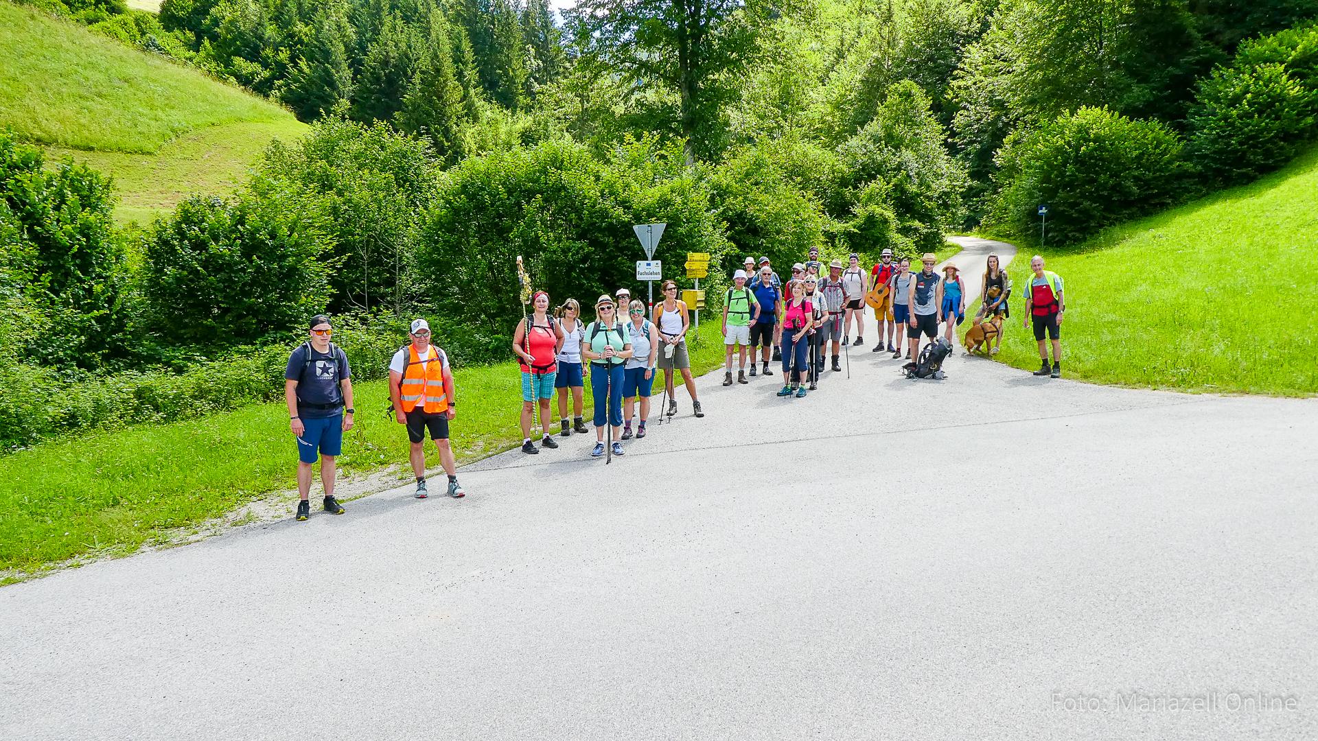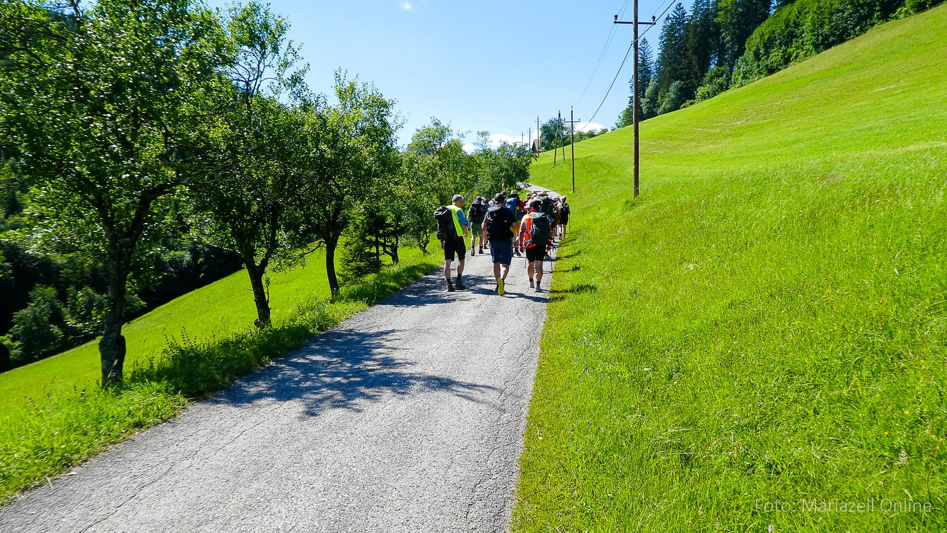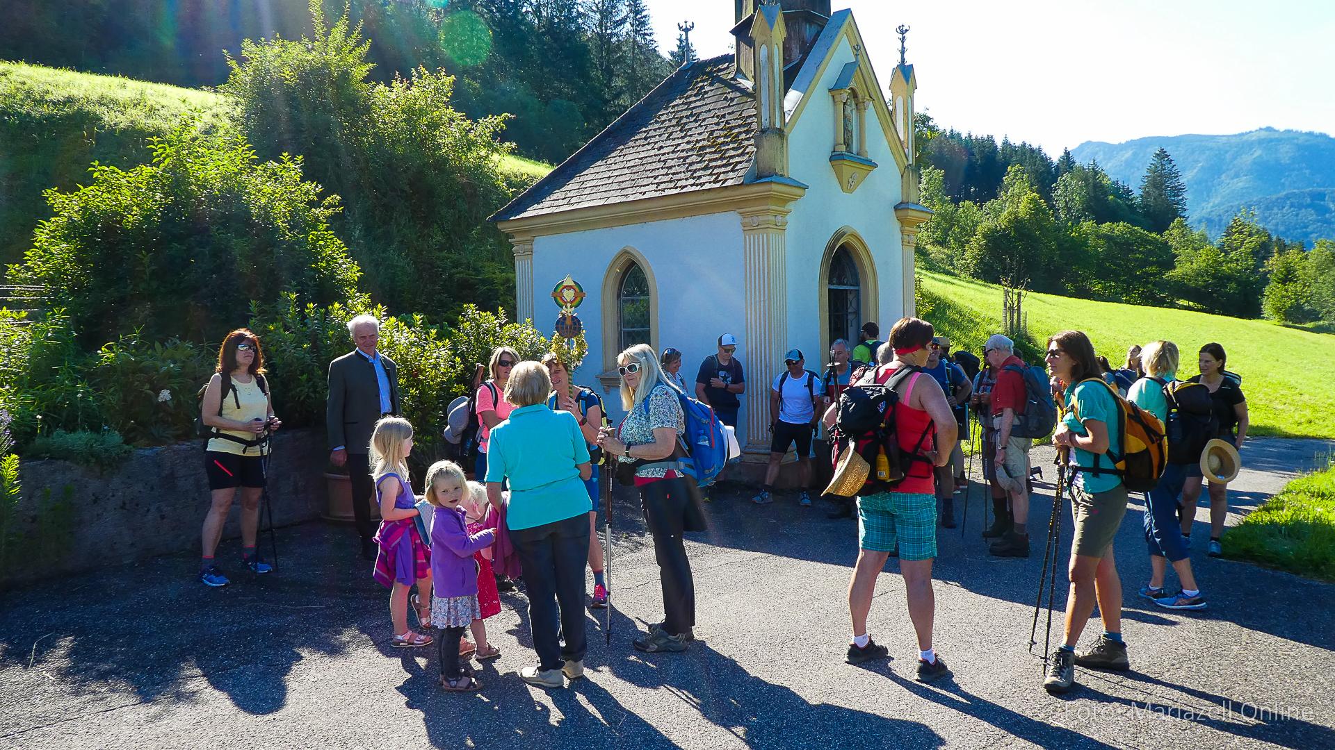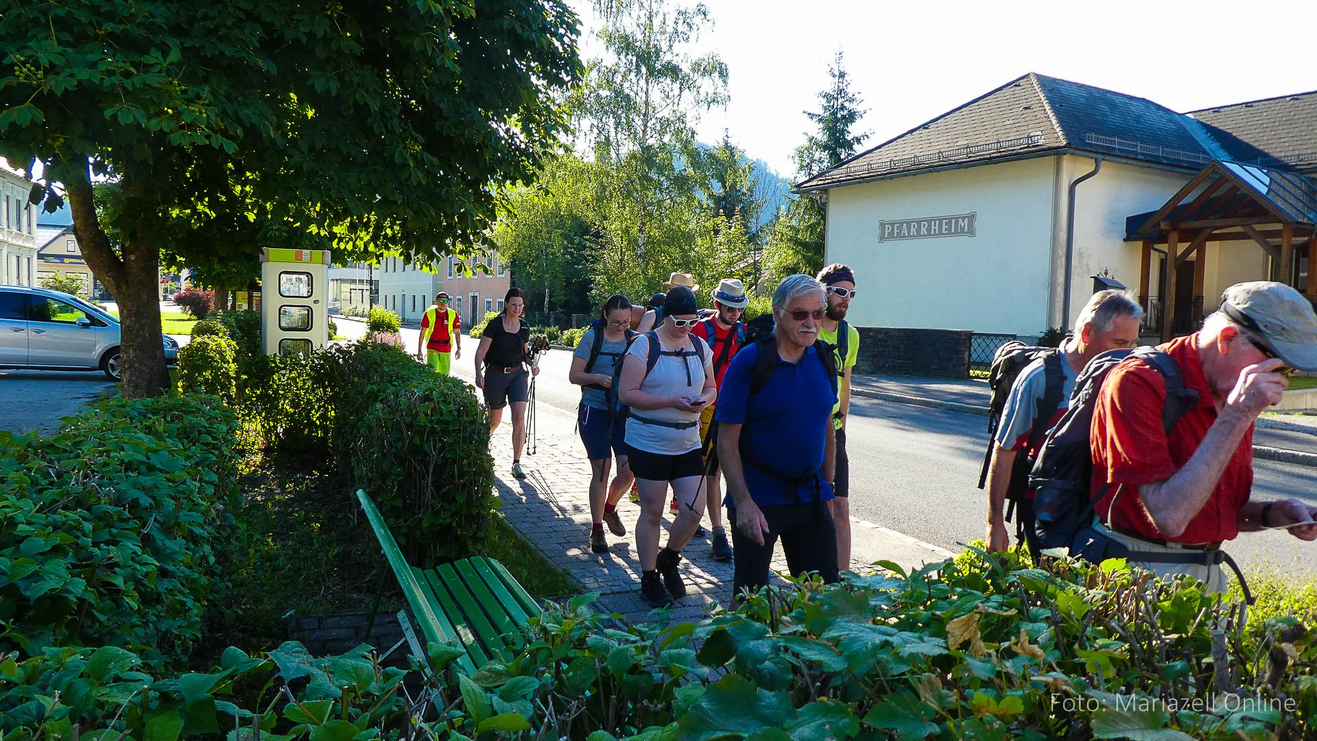 Lunz am See, Pfarrhaus, 7:45 Uhr: Die Gruppe macht sich abmarschbereit, neue Wallfahrer stoßen zur Gruppe, andere setzen einen Tag aus und fahren Im Begleitauto mit, um sich für den dritten Tag zu schonen. Nachdem auch noch die letzten Utensilien aus dem (bereits verschlossenen) Pfarrheim herausgebracht worden waren konnte es logehen. In einer geordneten Zweierreihe ging es – Rosenkranz betend – dem Tal entlang hinauf zum Gasthaus „Zur Paula“, wo auch heuer weitere Wallfahrer genächtigt hatten und bereits auf uns warteten.