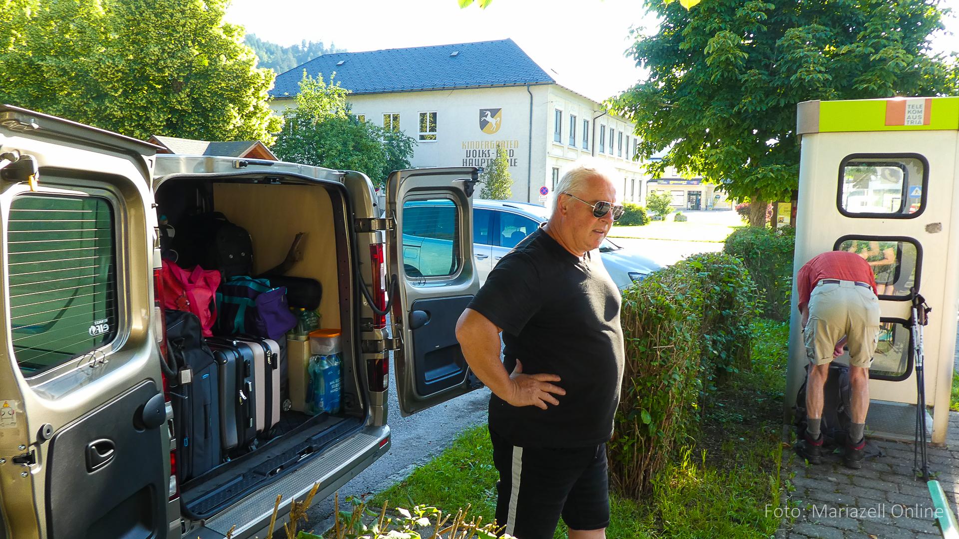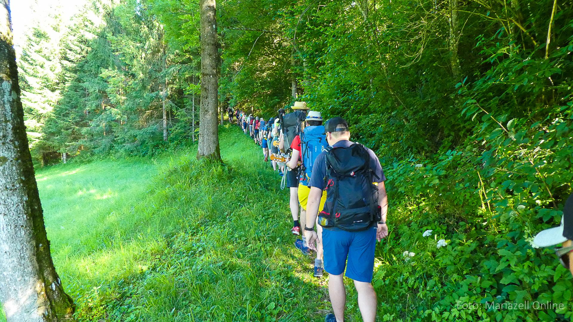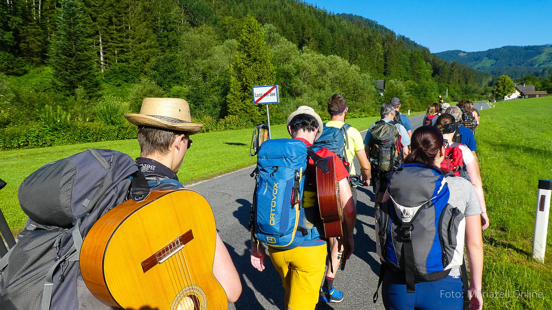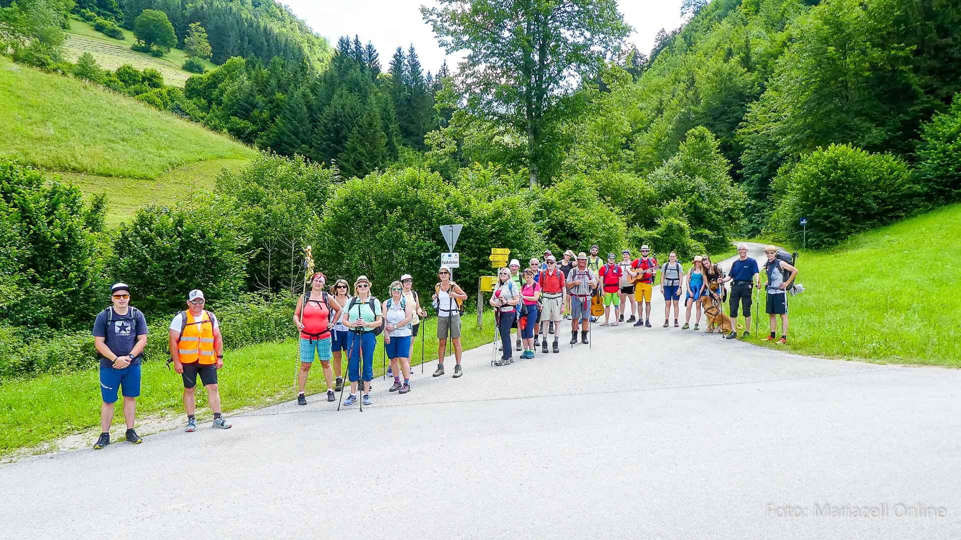 Lunz am See, Pfarrhaus, 7:45 Uhr: Die Gruppe macht sich abmarschbereit, neue Wallfahrer stoßen zur Gruppe, andere setzen einen Tag aus und fahren Im Begleitauto mit, um sich für den dritten Tag zu schonen. Nachdem auch noch die letzten Utensilien aus dem (bereits verschlossenen) Pfarrheim herausgebracht worden waren konnte es logehen. In einer geordneten Zweierreihe ging es – Rosenkranz betend – dem Tal entlang hinauf zum Gasthaus „Zur Paula“, wo auch heuer weitere Wallfahrer genächtigt hatten und bereits auf uns warteten.