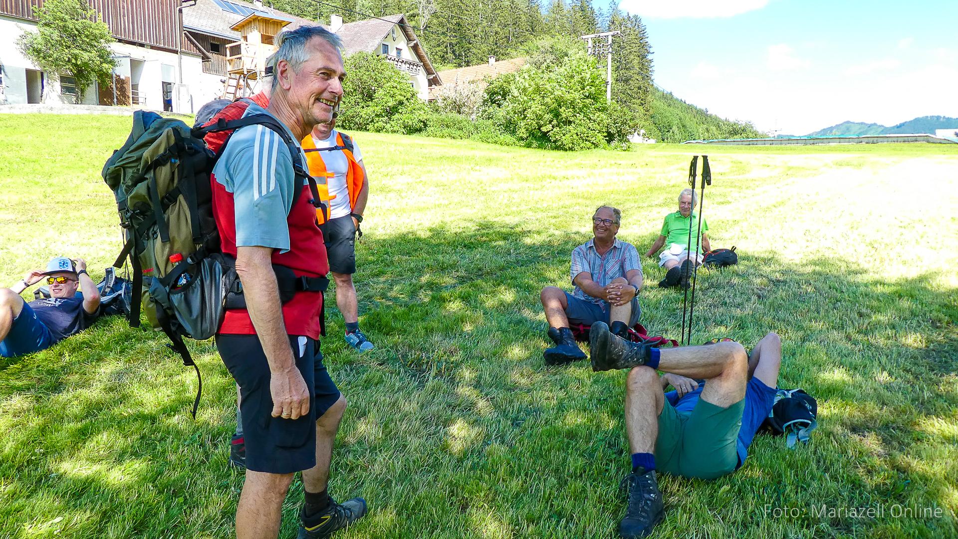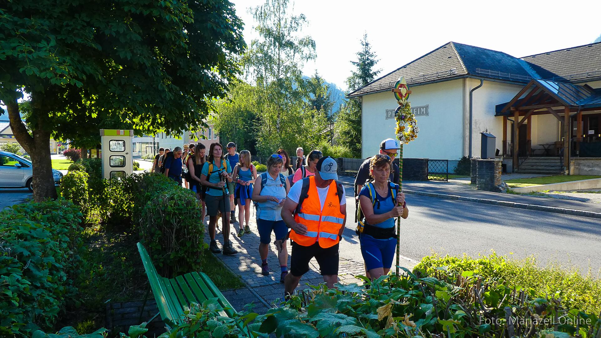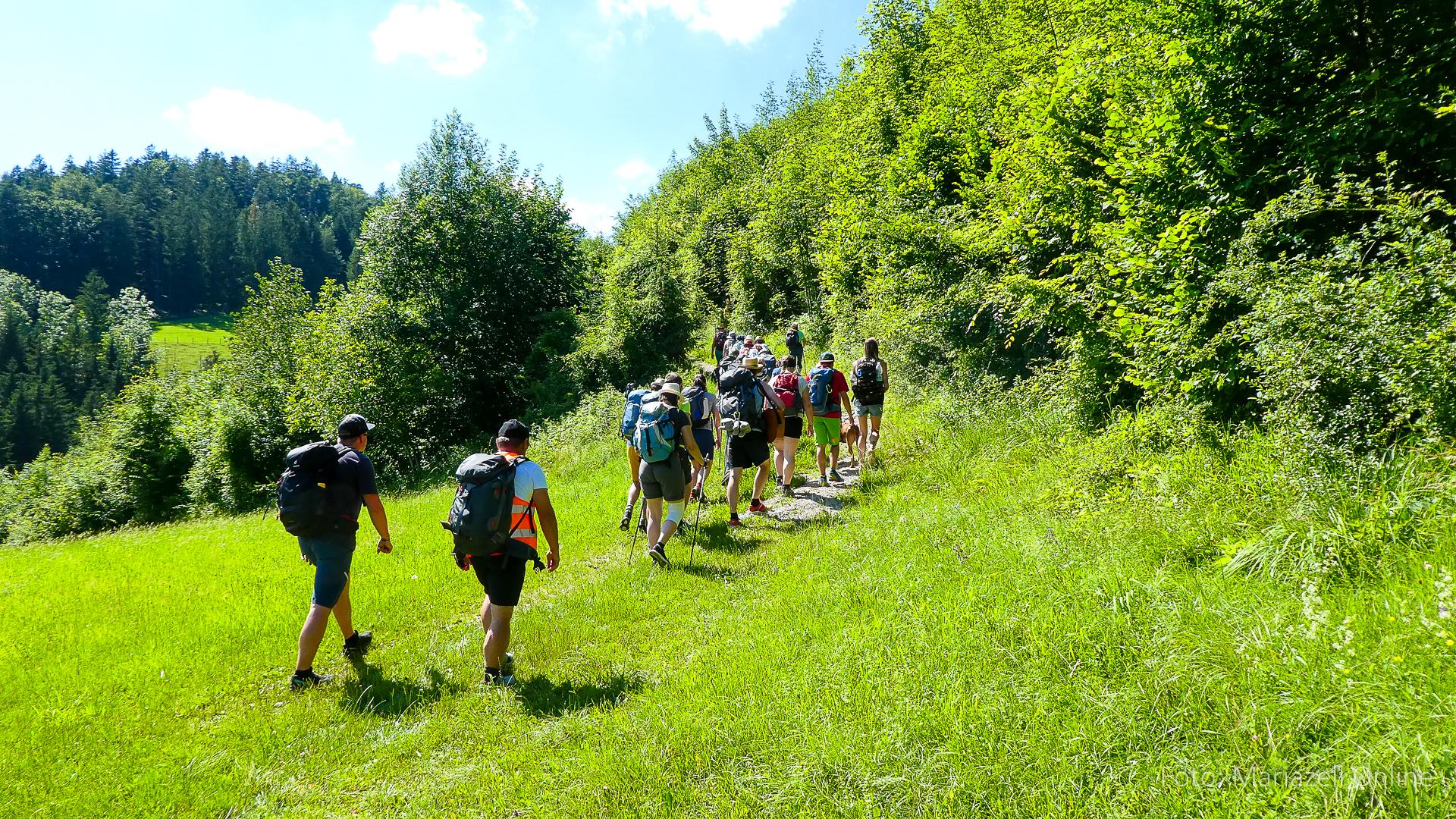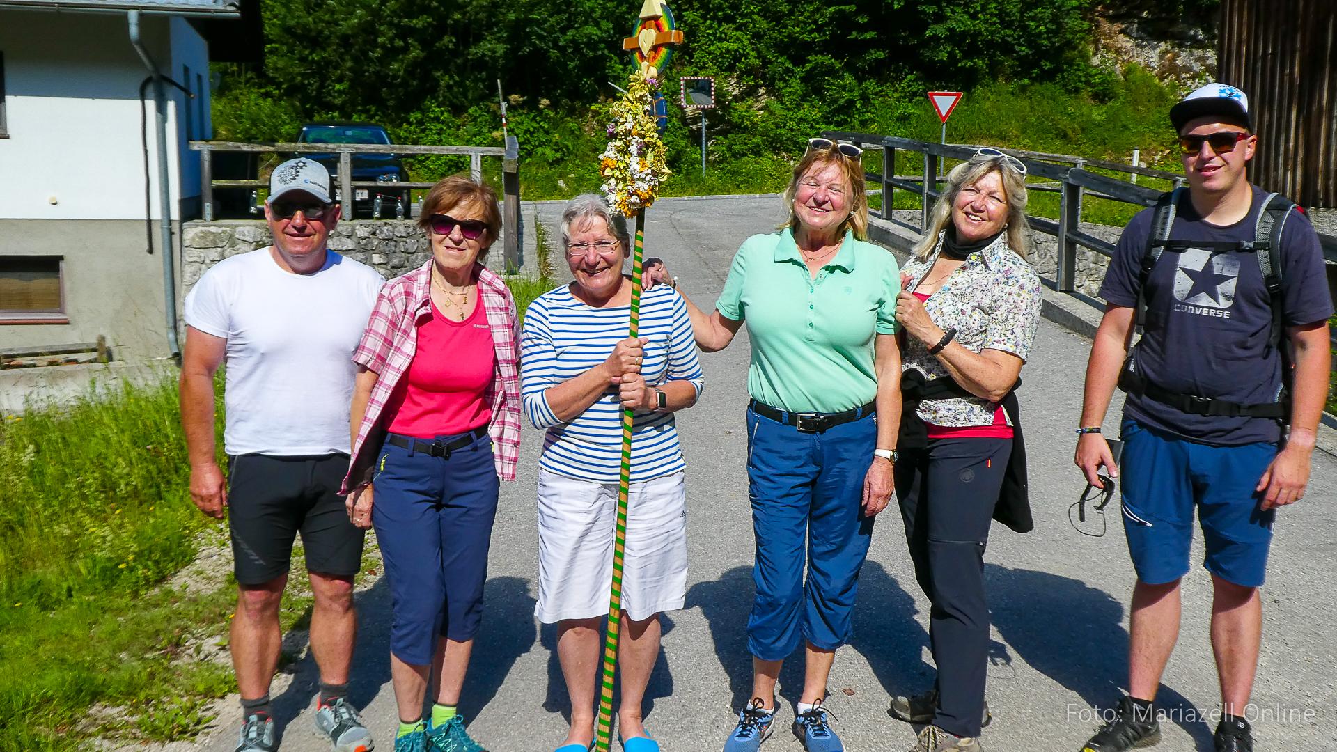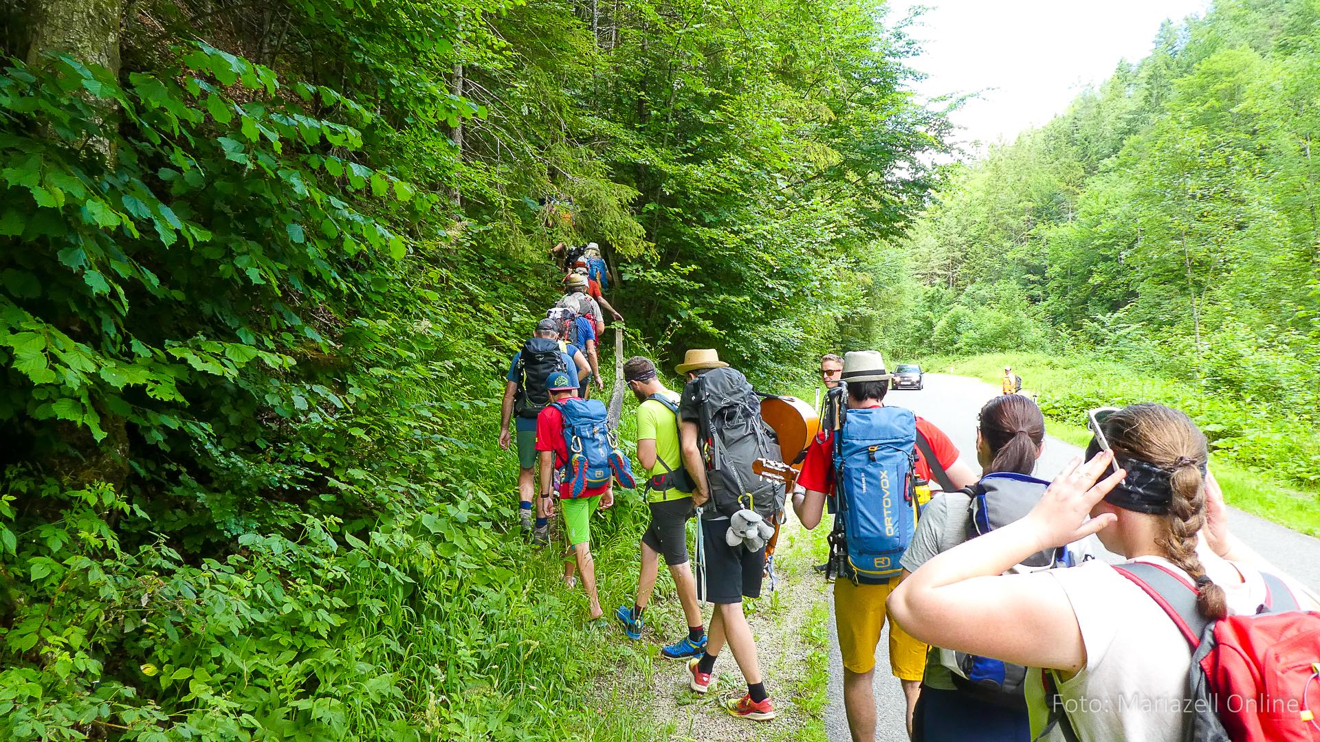 Lunz am See, Pfarrhaus, 7:45 Uhr: Die Gruppe macht sich abmarschbereit, neue Wallfahrer stoßen zur Gruppe, andere setzen einen Tag aus und fahren Im Begleitauto mit, um sich für den dritten Tag zu schonen. Nachdem auch noch die letzten Utensilien aus dem (bereits verschlossenen) Pfarrheim herausgebracht worden waren konnte es logehen. In einer geordneten Zweierreihe ging es – Rosenkranz betend – dem Tal entlang hinauf zum Gasthaus „Zur Paula“, wo auch heuer weitere Wallfahrer genächtigt hatten und bereits auf uns warteten.