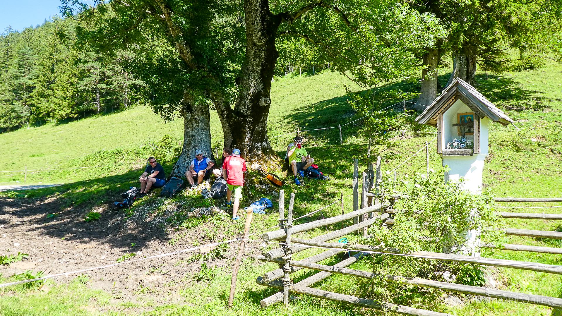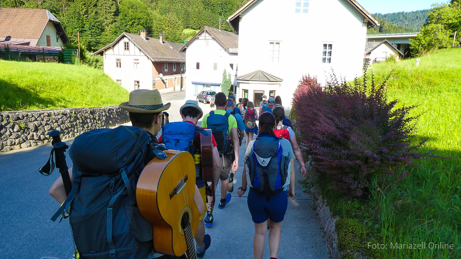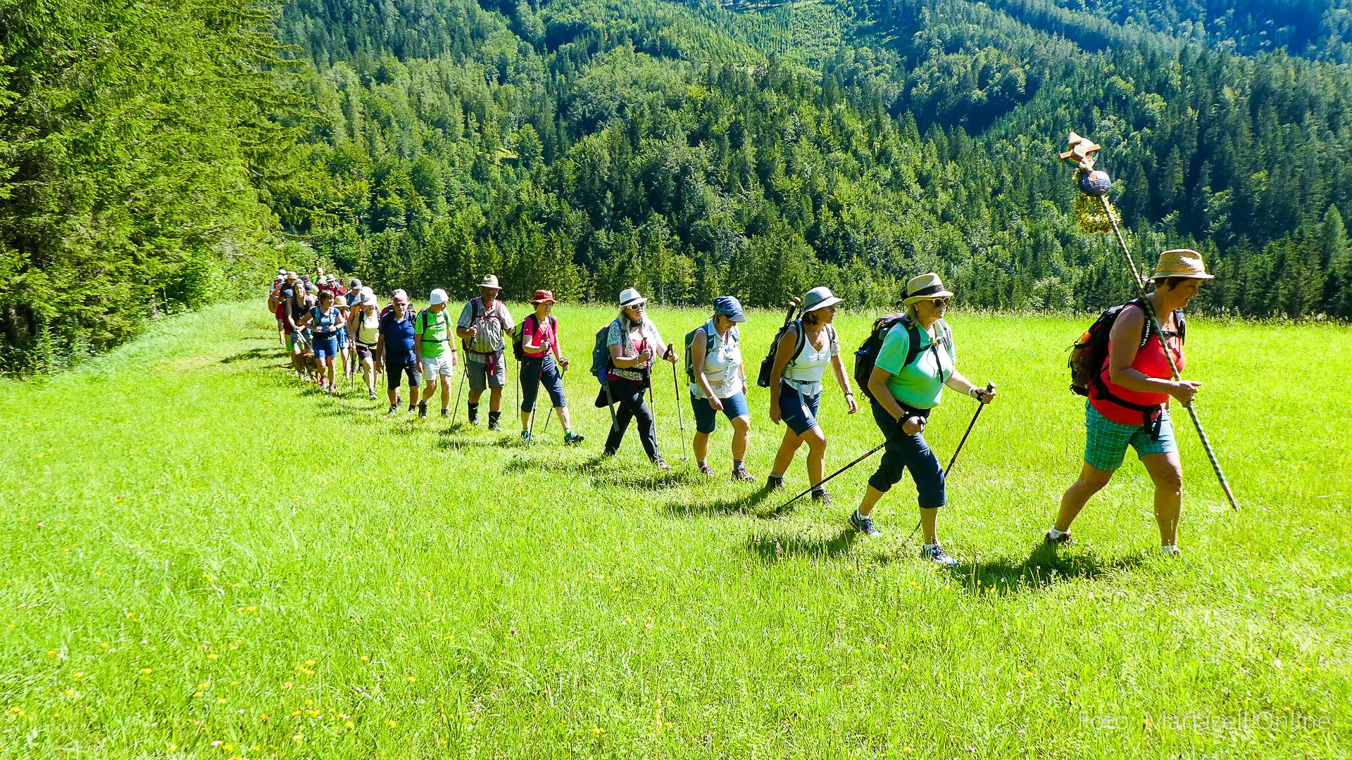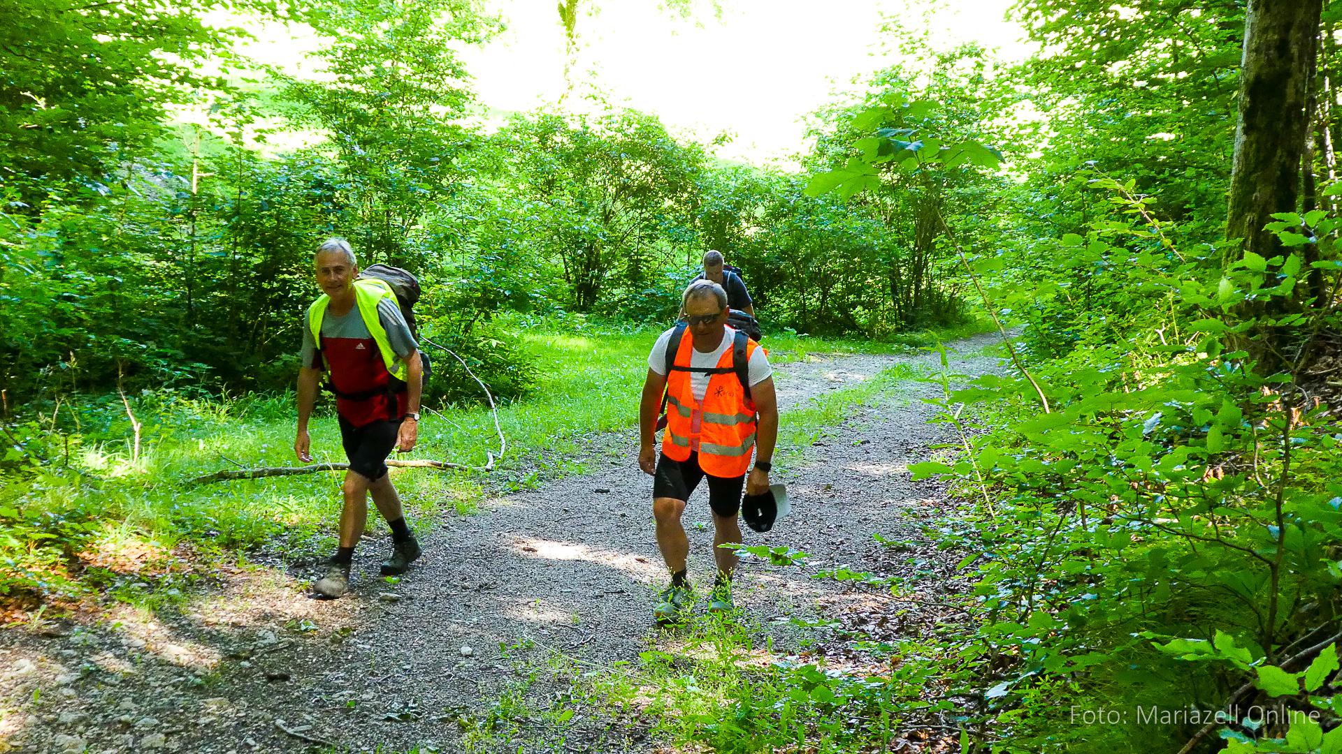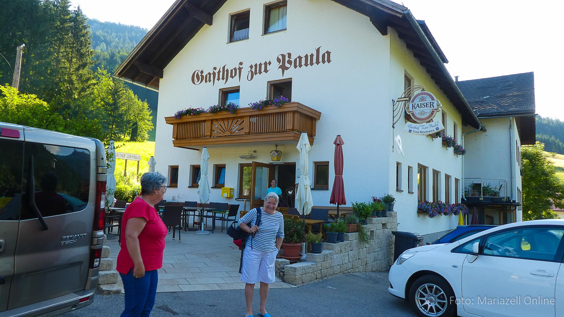 Lunz am See, Pfarrhaus, 7:45 Uhr: Die Gruppe macht sich abmarschbereit, neue Wallfahrer stoßen zur Gruppe, andere setzen einen Tag aus und fahren Im Begleitauto mit, um sich für den dritten Tag zu schonen. Nachdem auch noch die letzten Utensilien aus dem (bereits verschlossenen) Pfarrheim herausgebracht worden waren konnte es logehen. In einer geordneten Zweierreihe ging es – Rosenkranz betend – dem Tal entlang hinauf zum Gasthaus „Zur Paula“, wo auch heuer weitere Wallfahrer genächtigt hatten und bereits auf uns warteten.