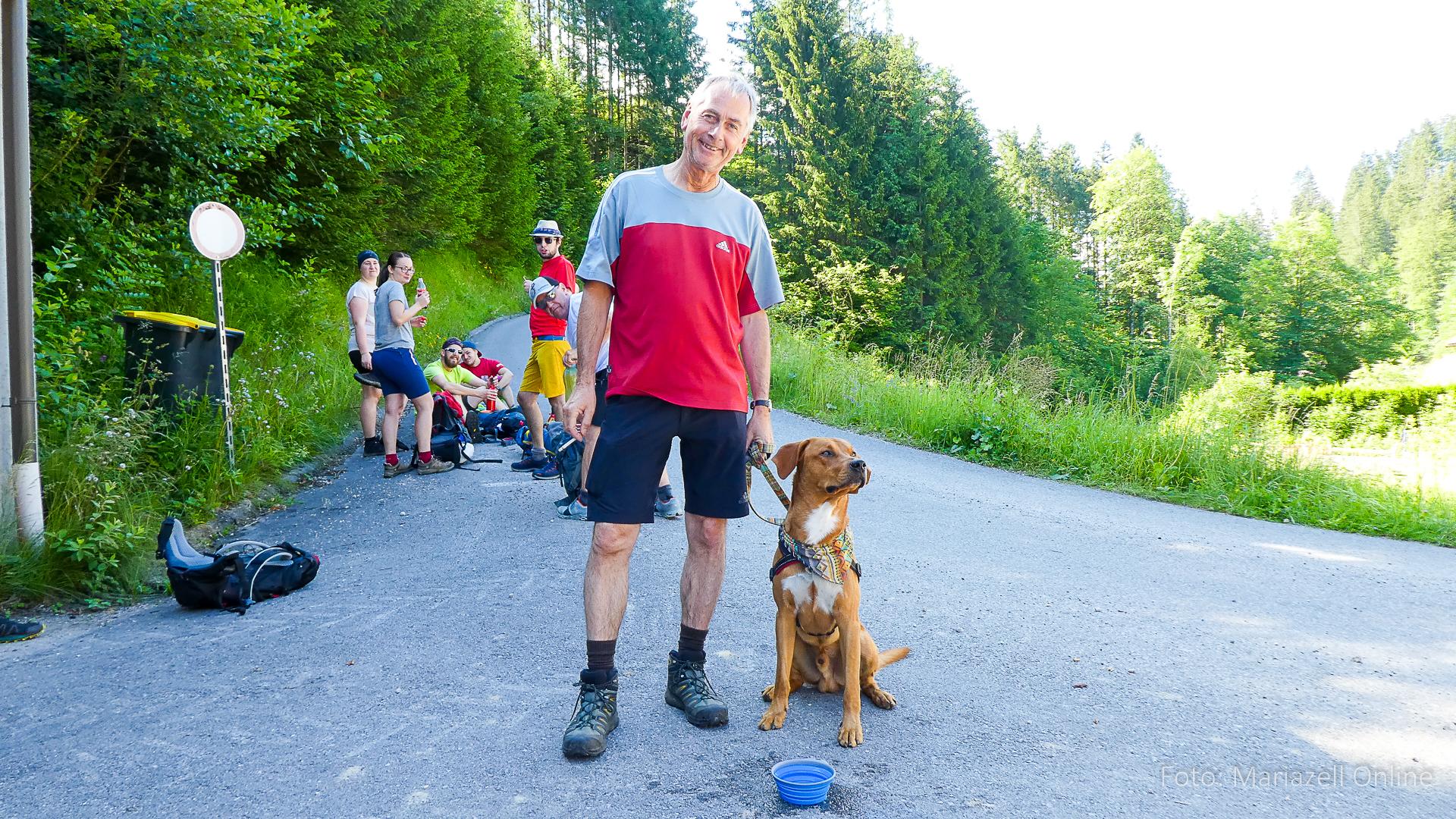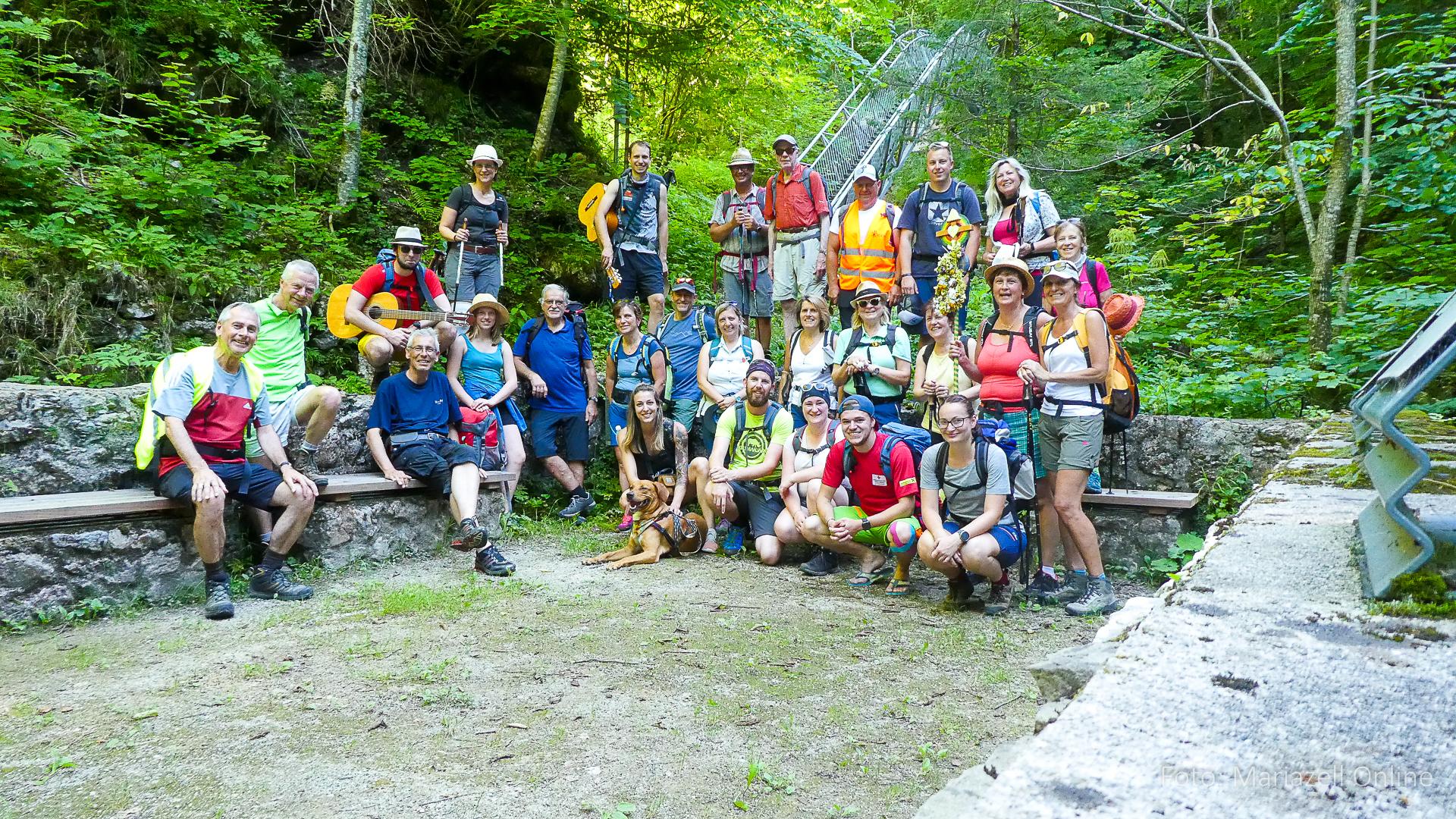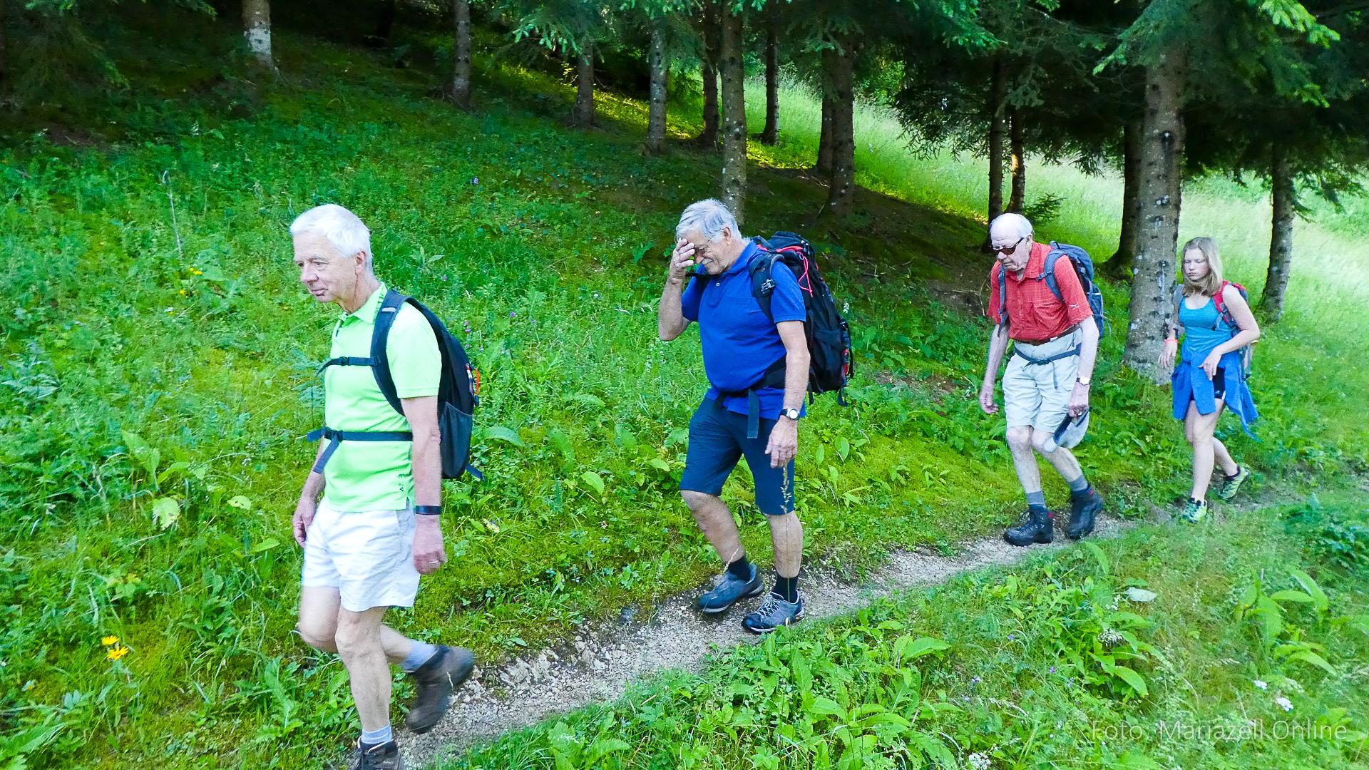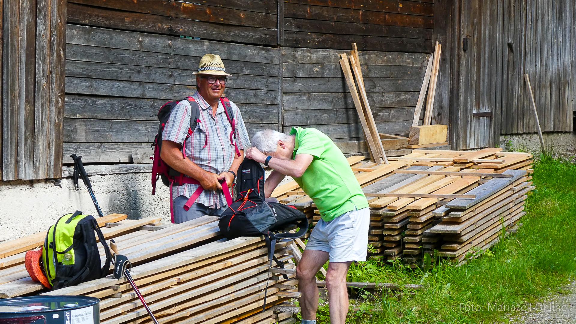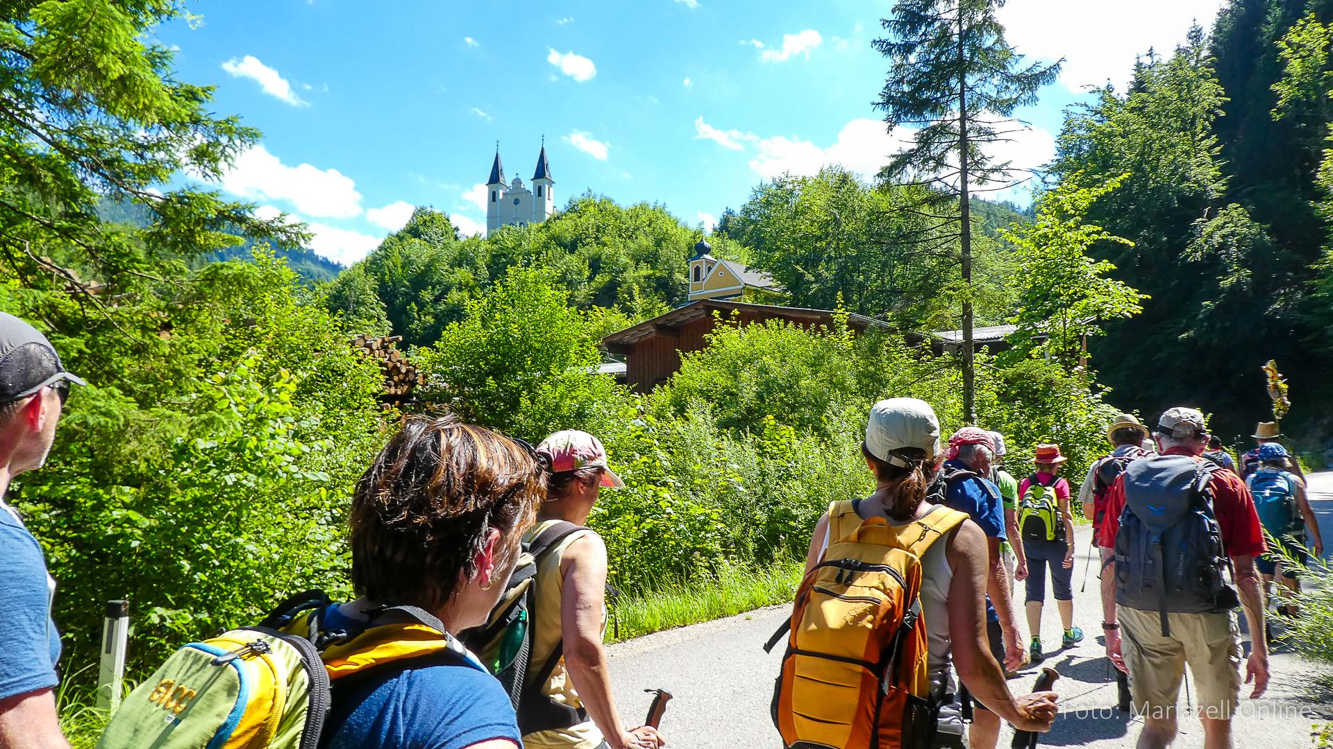 Lunz am See, Pfarrhaus, 7:45 Uhr: Die Gruppe macht sich abmarschbereit, neue Wallfahrer stoßen zur Gruppe, andere setzen einen Tag aus und fahren Im Begleitauto mit, um sich für den dritten Tag zu schonen. Nachdem auch noch die letzten Utensilien aus dem (bereits verschlossenen) Pfarrheim herausgebracht worden waren konnte es logehen. In einer geordneten Zweierreihe ging es – Rosenkranz betend – dem Tal entlang hinauf zum Gasthaus „Zur Paula“, wo auch heuer weitere Wallfahrer genächtigt hatten und bereits auf uns warteten.
