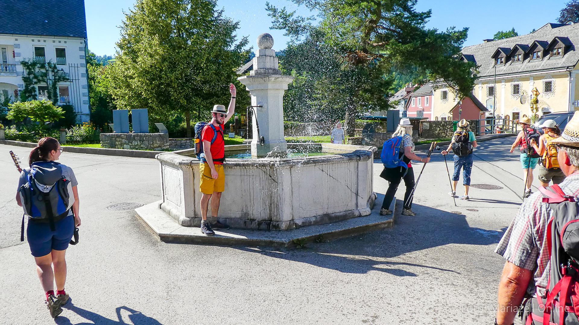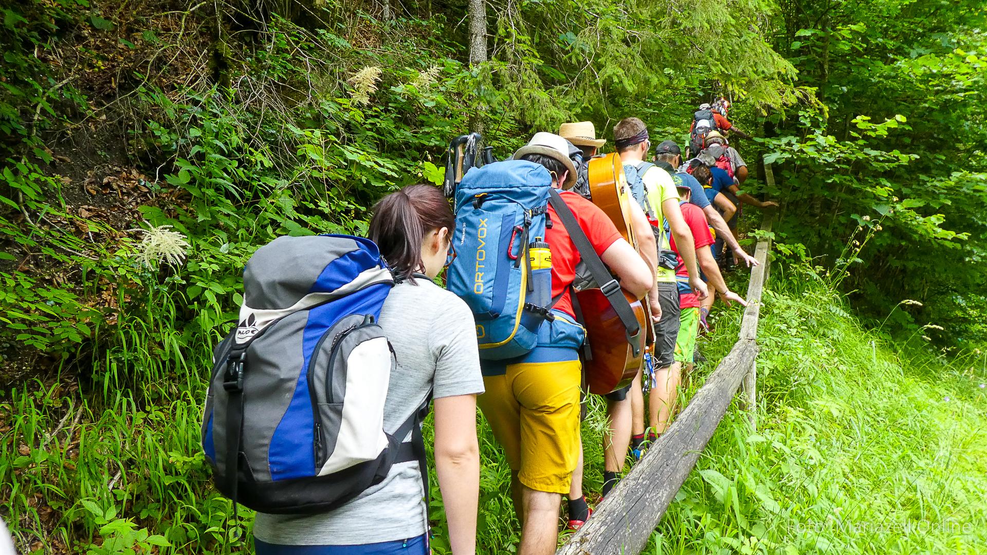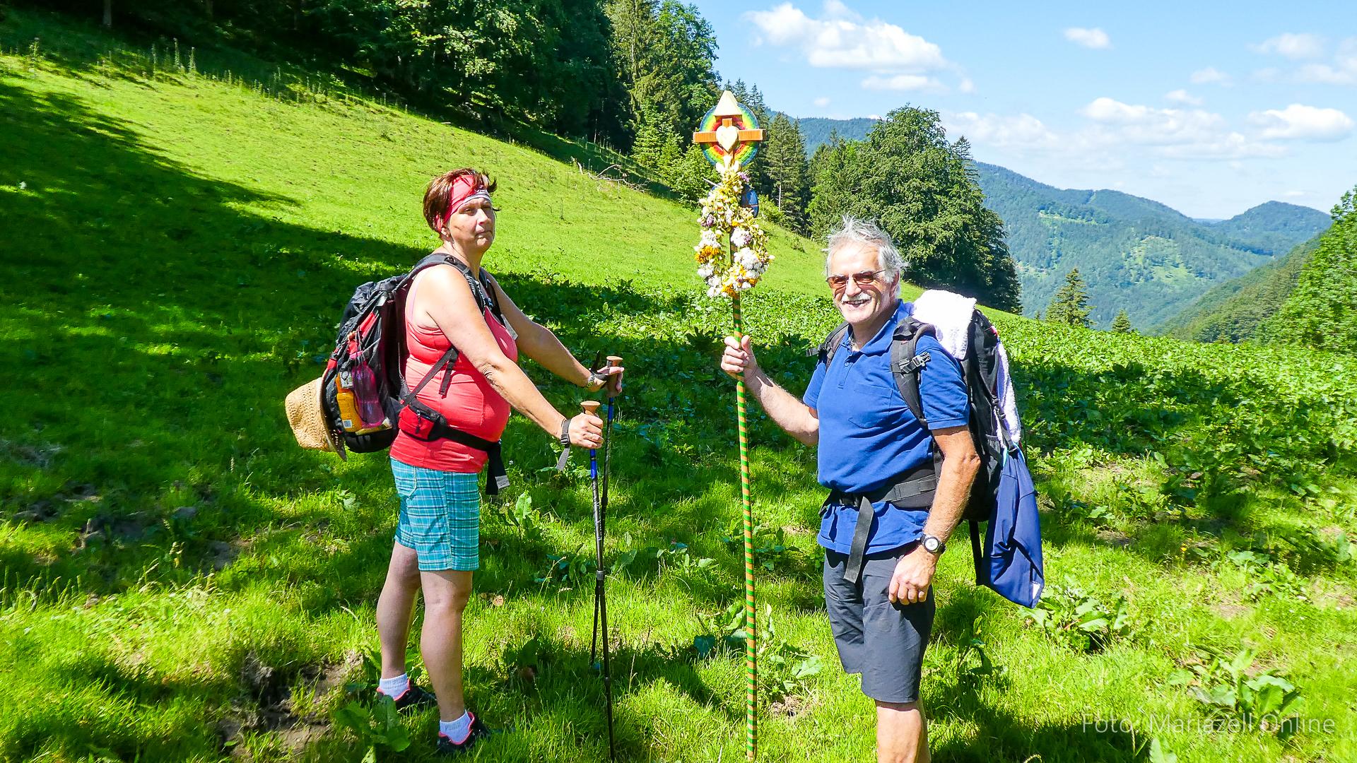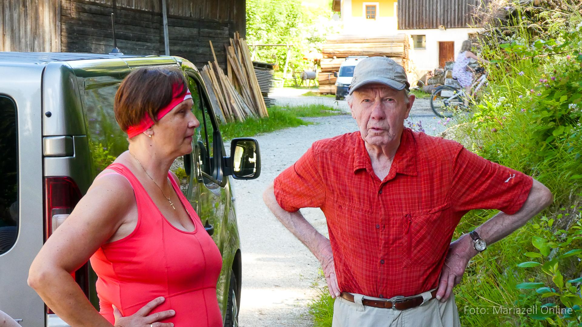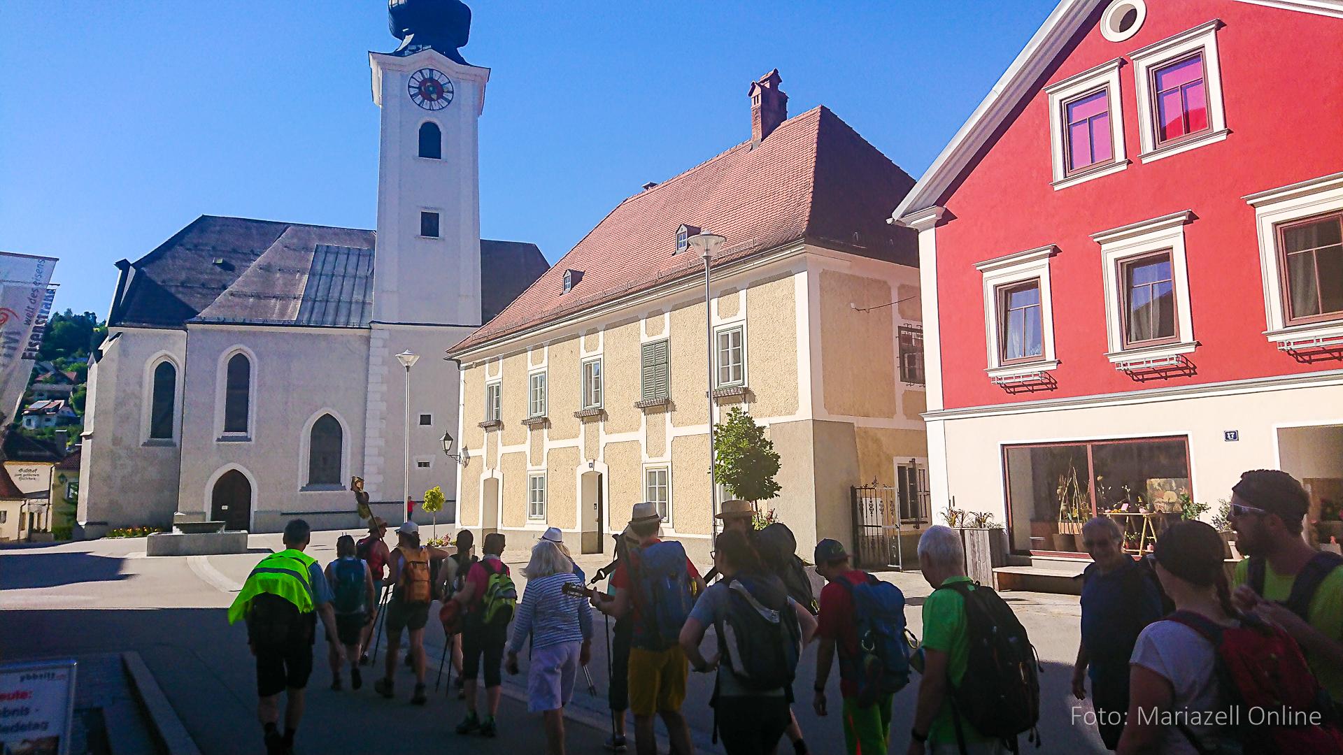 Lunz am See, Pfarrhaus, 7:45 Uhr: Die Gruppe macht sich abmarschbereit, neue Wallfahrer stoßen zur Gruppe, andere setzen einen Tag aus und fahren Im Begleitauto mit, um sich für den dritten Tag zu schonen. Nachdem auch noch die letzten Utensilien aus dem (bereits verschlossenen) Pfarrheim herausgebracht worden waren konnte es logehen. In einer geordneten Zweierreihe ging es – Rosenkranz betend – dem Tal entlang hinauf zum Gasthaus „Zur Paula“, wo auch heuer weitere Wallfahrer genächtigt hatten und bereits auf uns warteten.