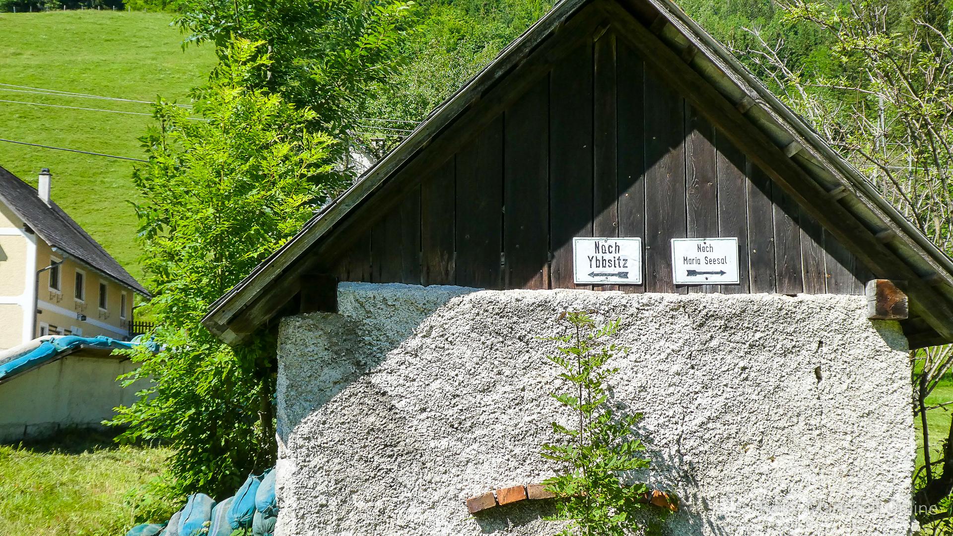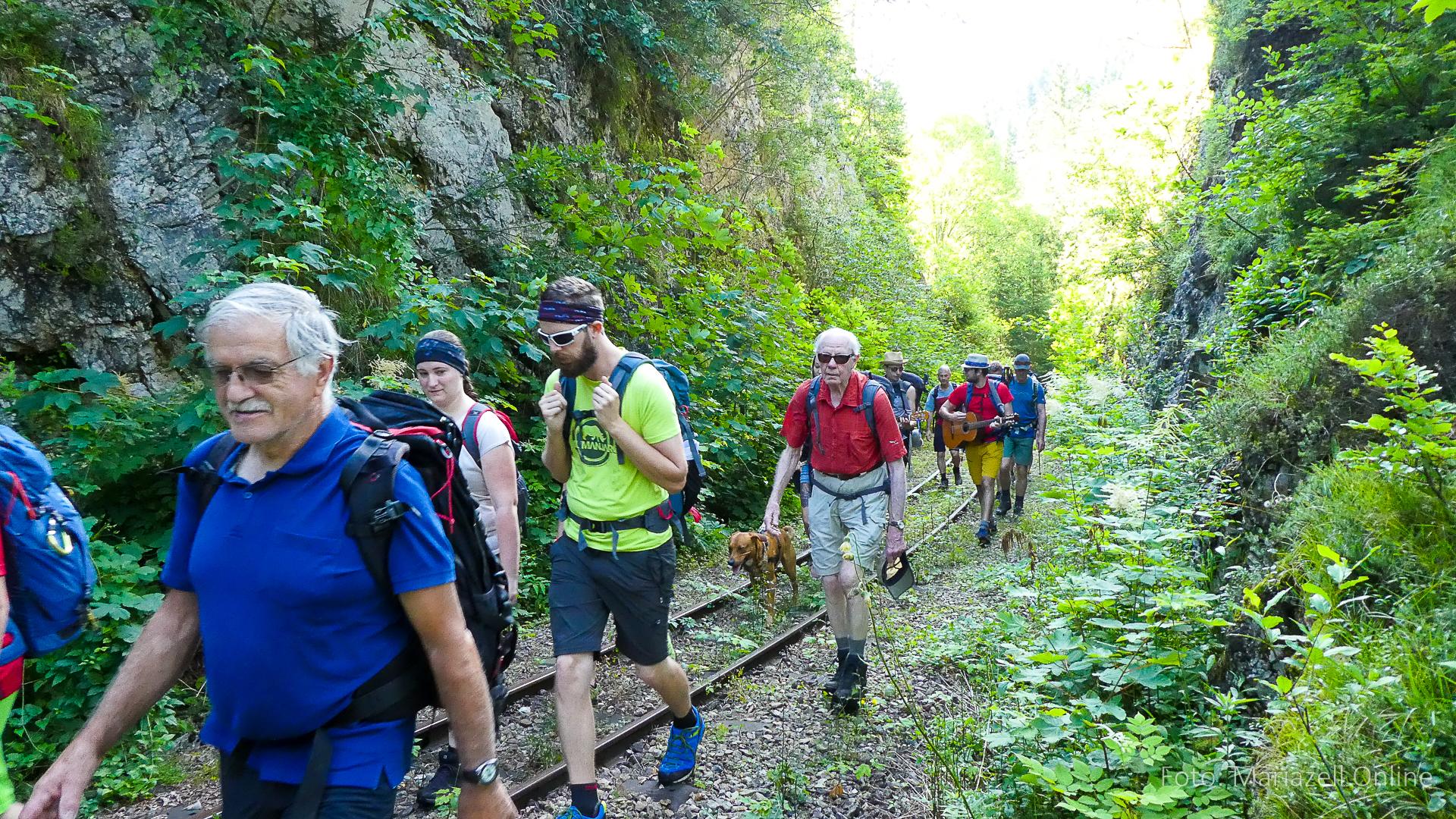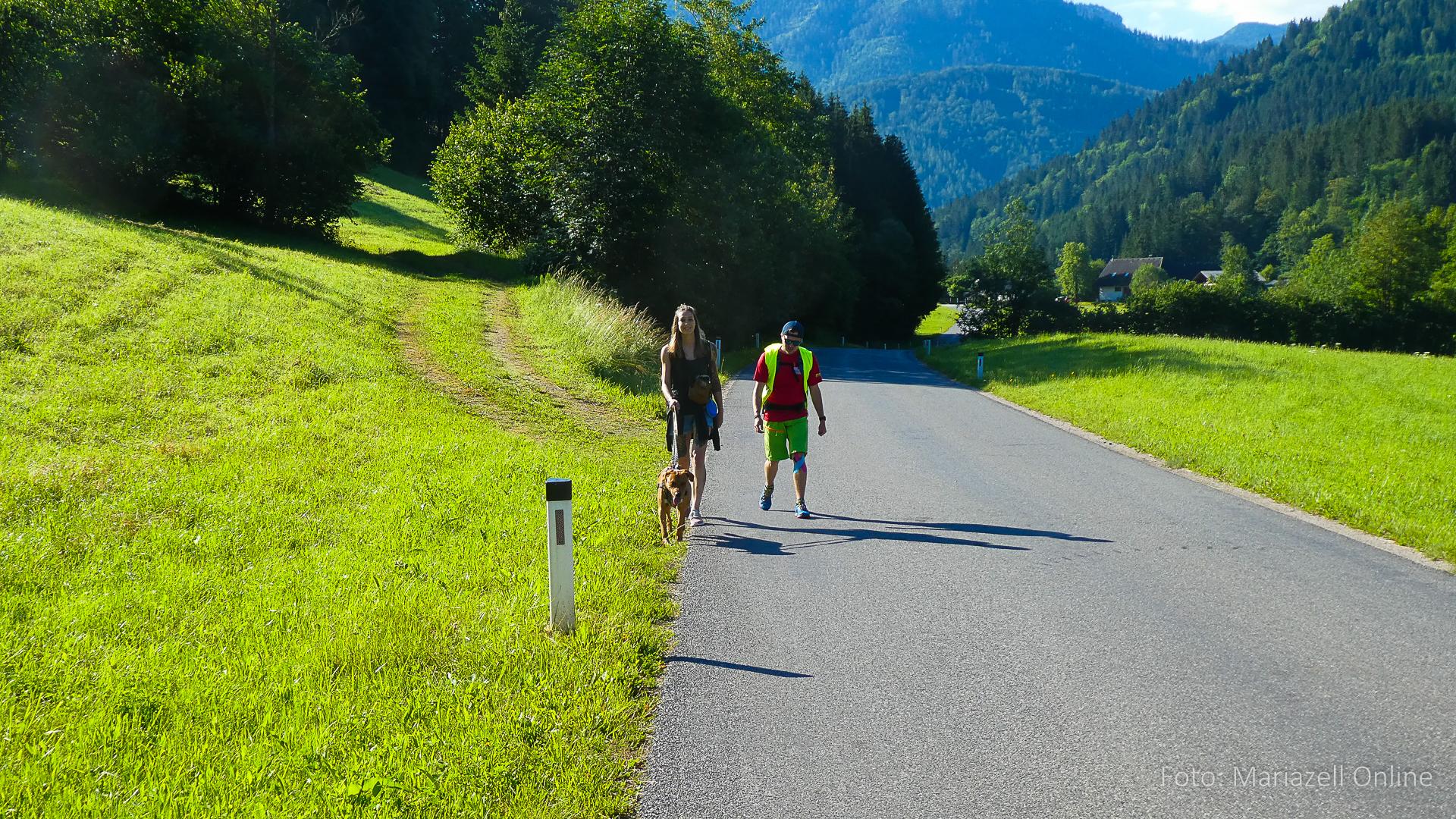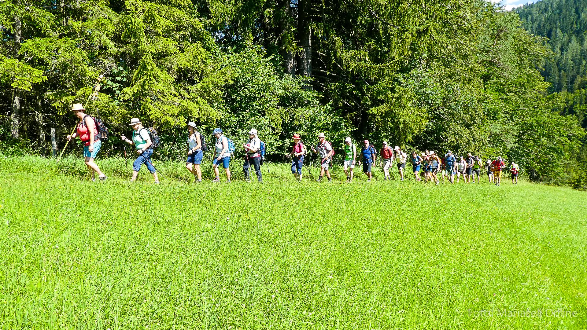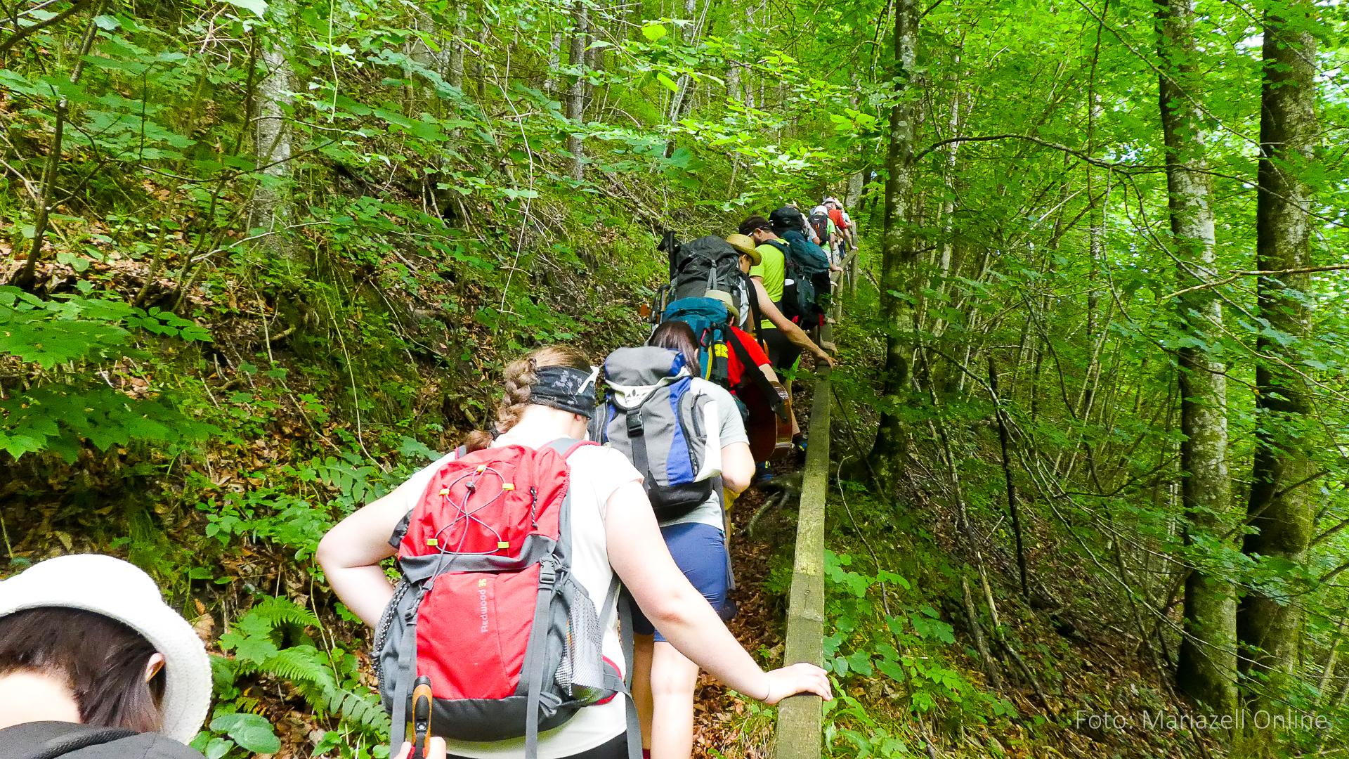 Lunz am See, Pfarrhaus, 7:45 Uhr: Die Gruppe macht sich abmarschbereit, neue Wallfahrer stoßen zur Gruppe, andere setzen einen Tag aus und fahren Im Begleitauto mit, um sich für den dritten Tag zu schonen. Nachdem auch noch die letzten Utensilien aus dem (bereits verschlossenen) Pfarrheim herausgebracht worden waren konnte es logehen. In einer geordneten Zweierreihe ging es – Rosenkranz betend – dem Tal entlang hinauf zum Gasthaus „Zur Paula“, wo auch heuer weitere Wallfahrer genächtigt hatten und bereits auf uns warteten.