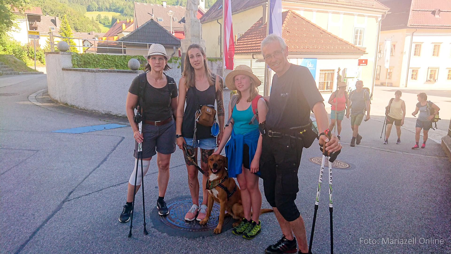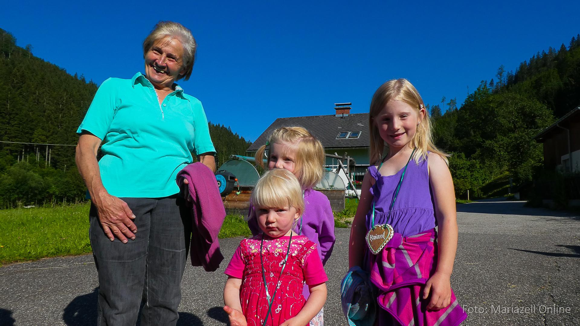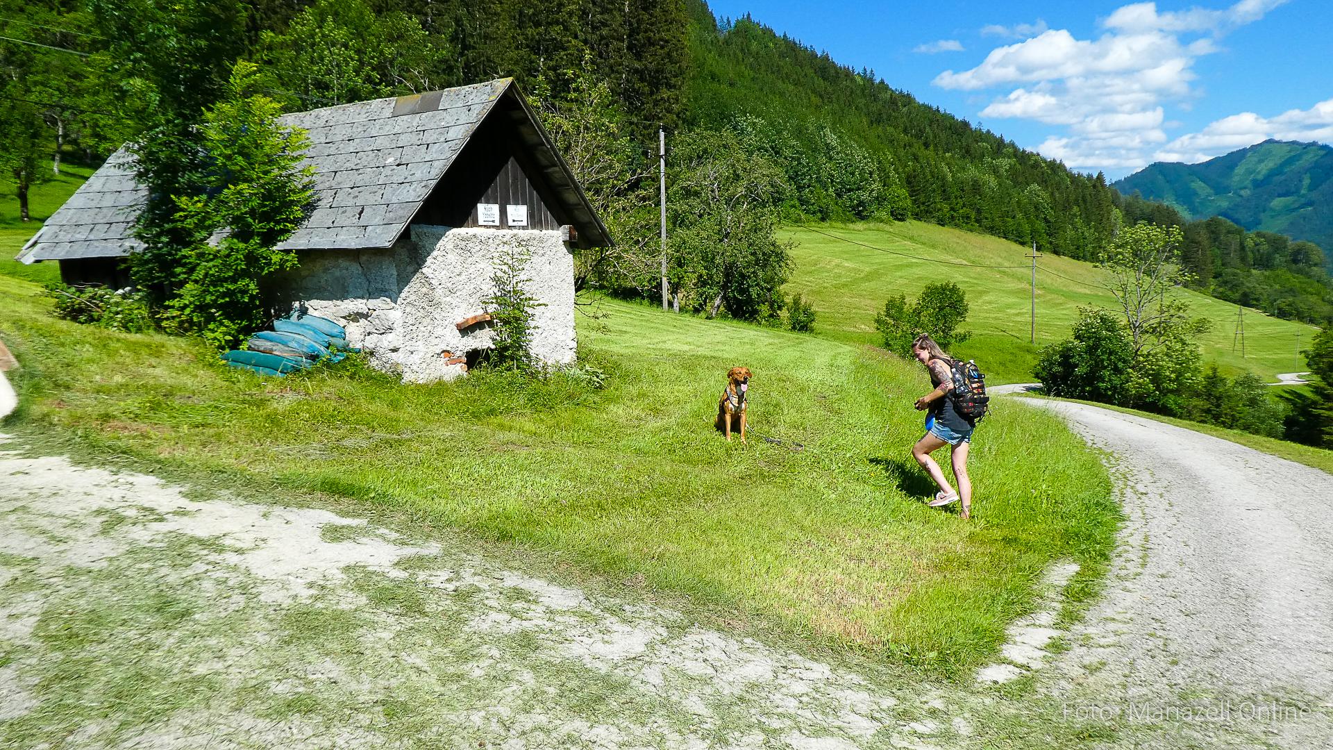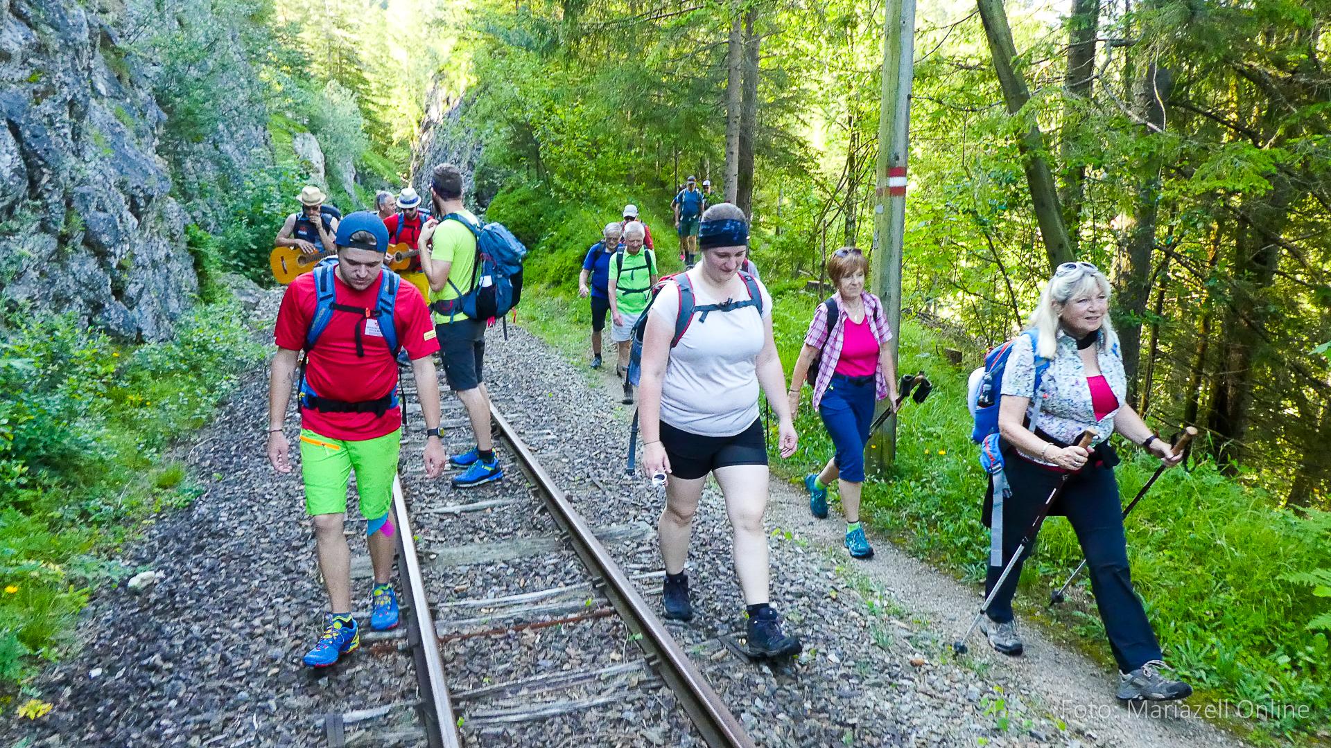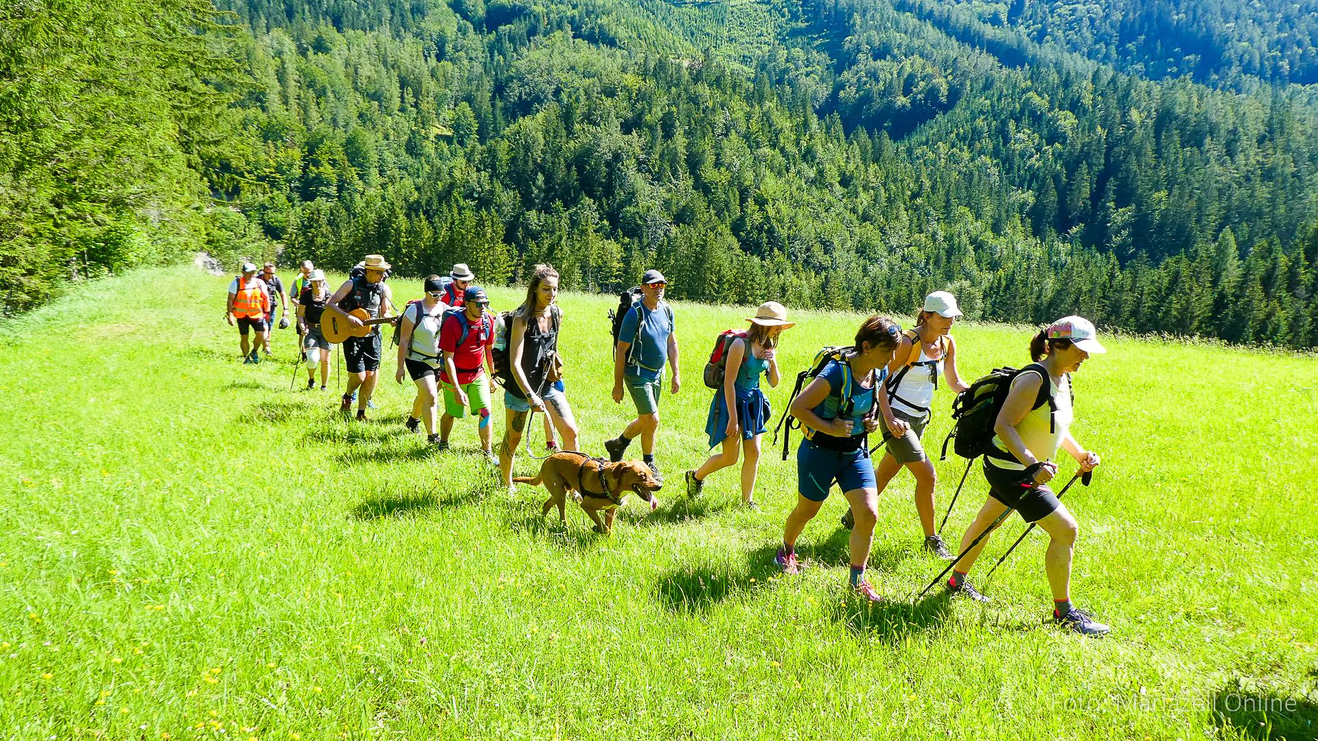 Lunz am See, Pfarrhaus, 7:45 Uhr: Die Gruppe macht sich abmarschbereit, neue Wallfahrer stoßen zur Gruppe, andere setzen einen Tag aus und fahren Im Begleitauto mit, um sich für den dritten Tag zu schonen. Nachdem auch noch die letzten Utensilien aus dem (bereits verschlossenen) Pfarrheim herausgebracht worden waren konnte es logehen. In einer geordneten Zweierreihe ging es – Rosenkranz betend – dem Tal entlang hinauf zum Gasthaus „Zur Paula“, wo auch heuer weitere Wallfahrer genächtigt hatten und bereits auf uns warteten.
