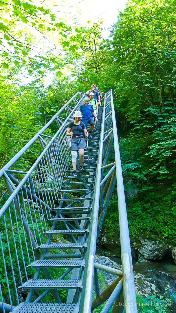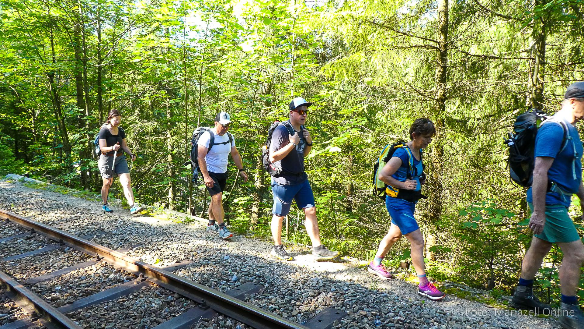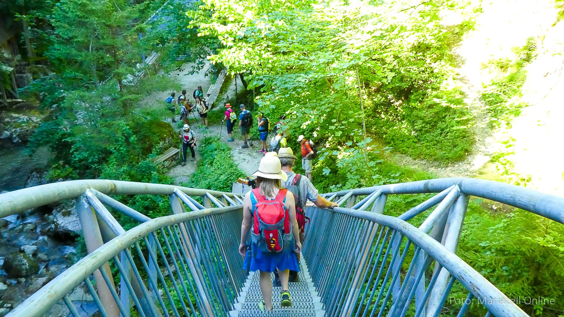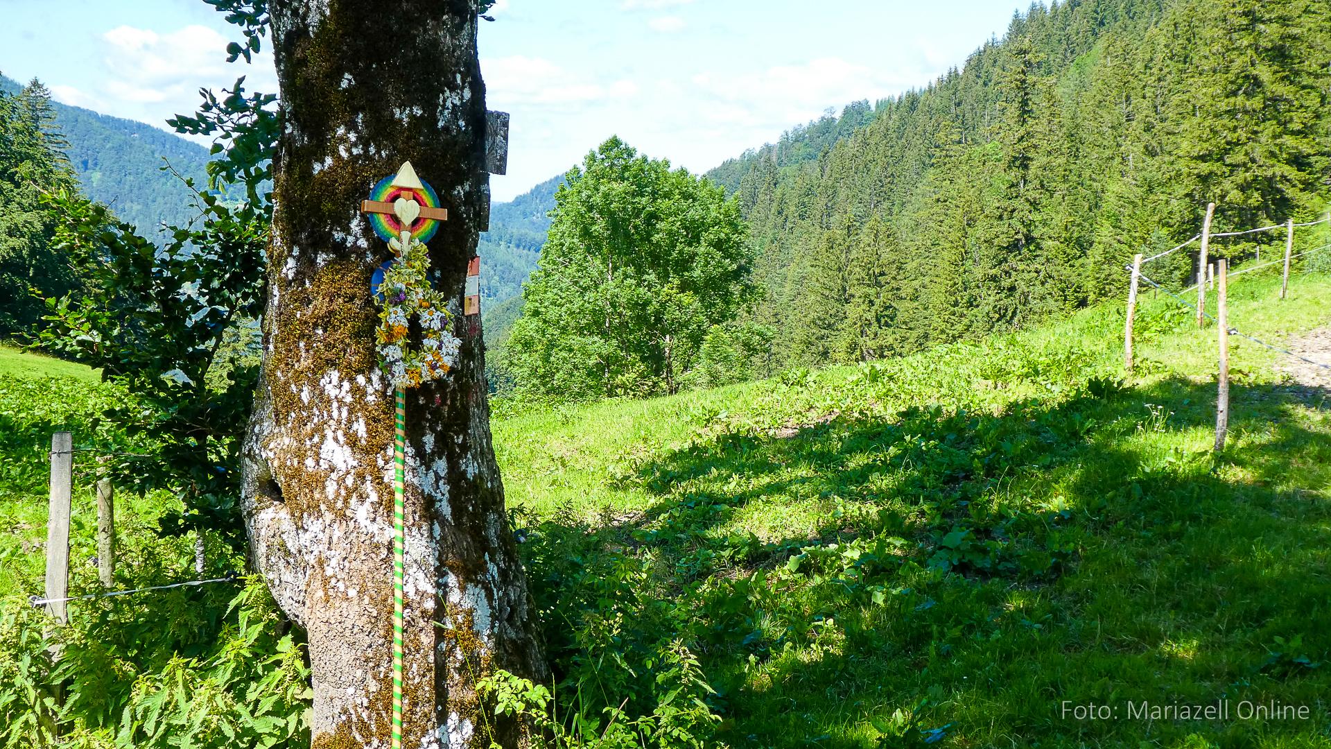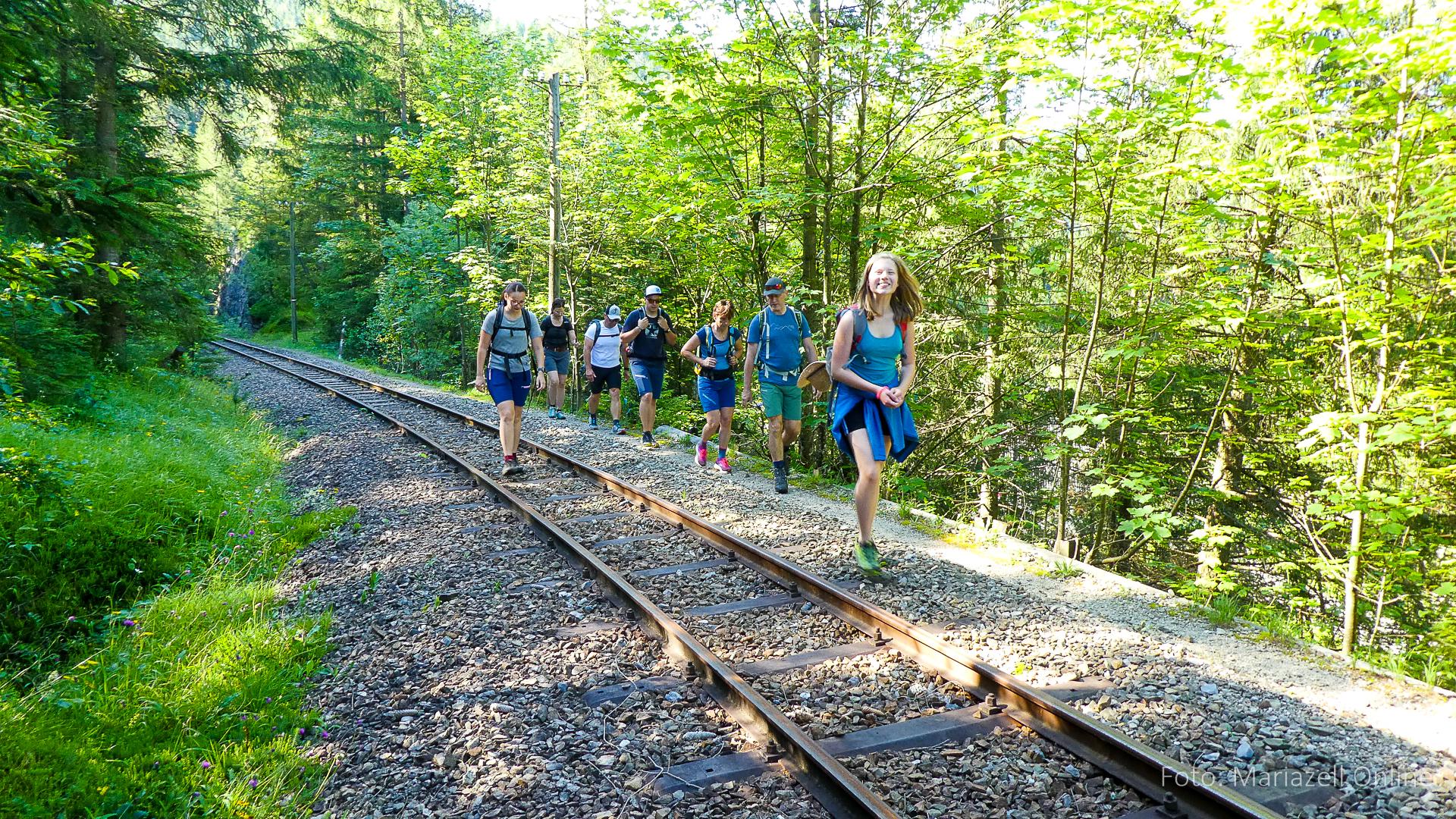 Lunz am See, Pfarrhaus, 7:45 Uhr: Die Gruppe macht sich abmarschbereit, neue Wallfahrer stoßen zur Gruppe, andere setzen einen Tag aus und fahren Im Begleitauto mit, um sich für den dritten Tag zu schonen. Nachdem auch noch die letzten Utensilien aus dem (bereits verschlossenen) Pfarrheim herausgebracht worden waren konnte es logehen. In einer geordneten Zweierreihe ging es – Rosenkranz betend – dem Tal entlang hinauf zum Gasthaus „Zur Paula“, wo auch heuer weitere Wallfahrer genächtigt hatten und bereits auf uns warteten.