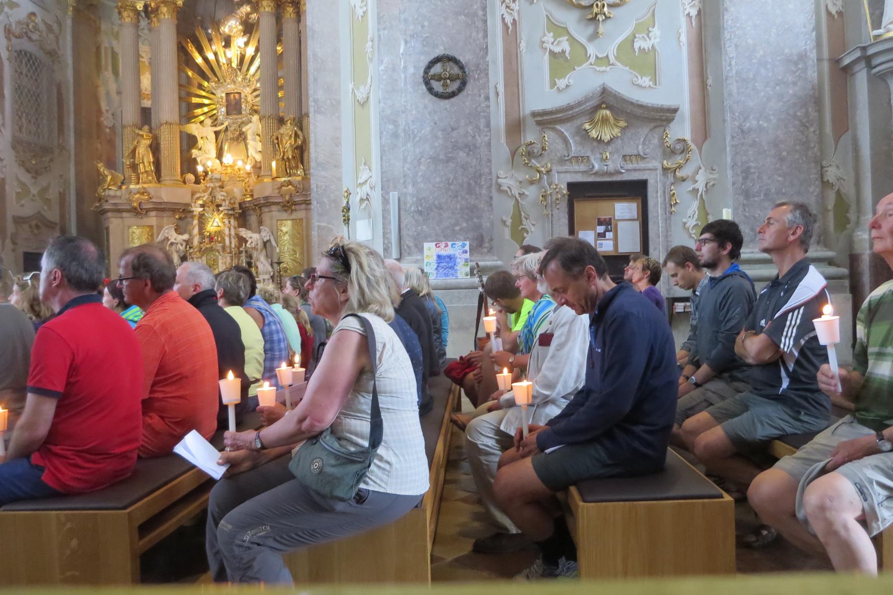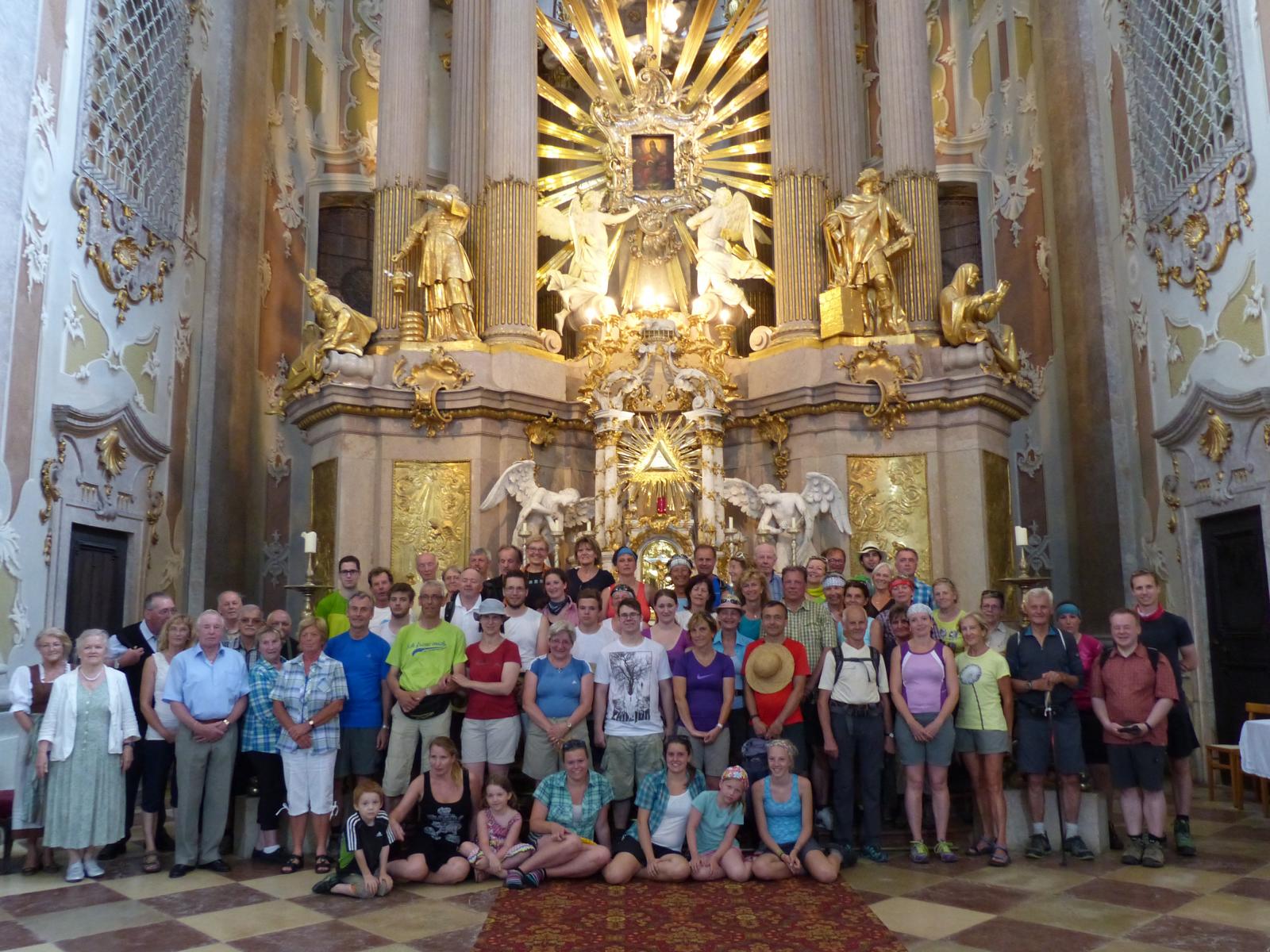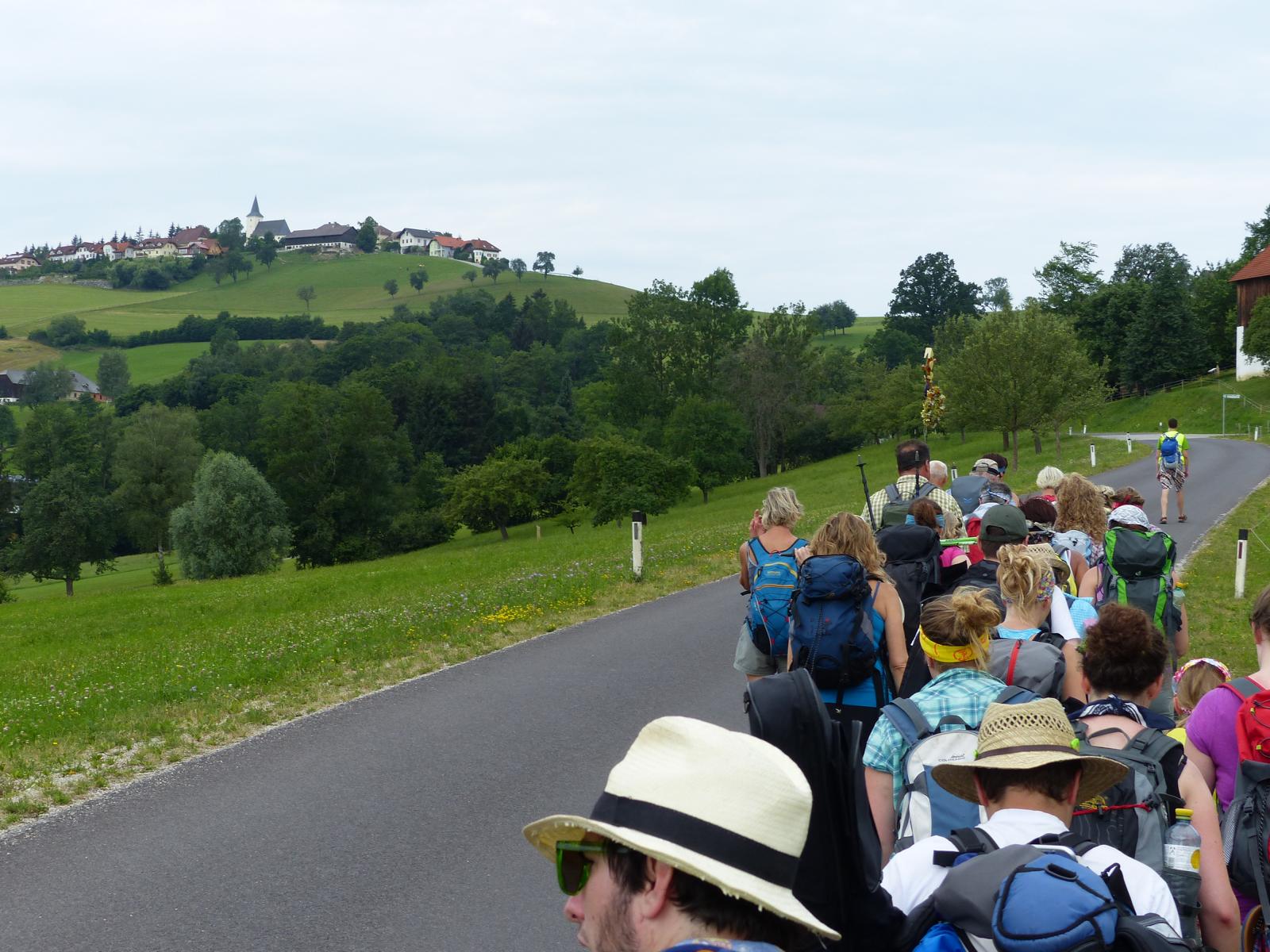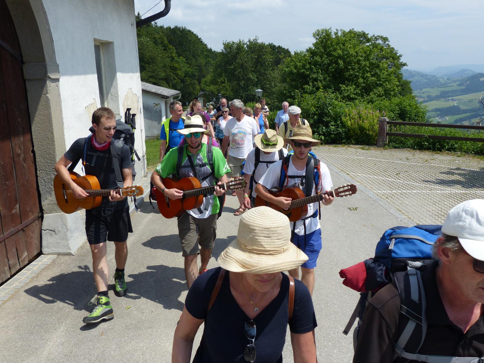 Die letzte Steigung des Tages führte uns dann endlich auf den Sonntagberg – dort nahmen wir dann wieder geordnete Aufstellung an und zogen mit einem von den Gitarristen begleiteten Hallelujah in die Basilika ein – nach drei Tagen Fußmarsch ein sehr ergreifender und berührender Moment.
