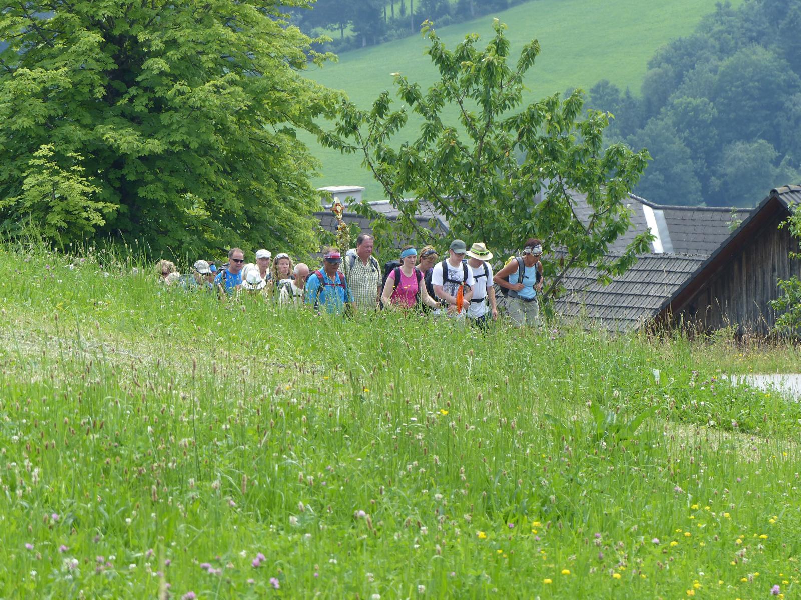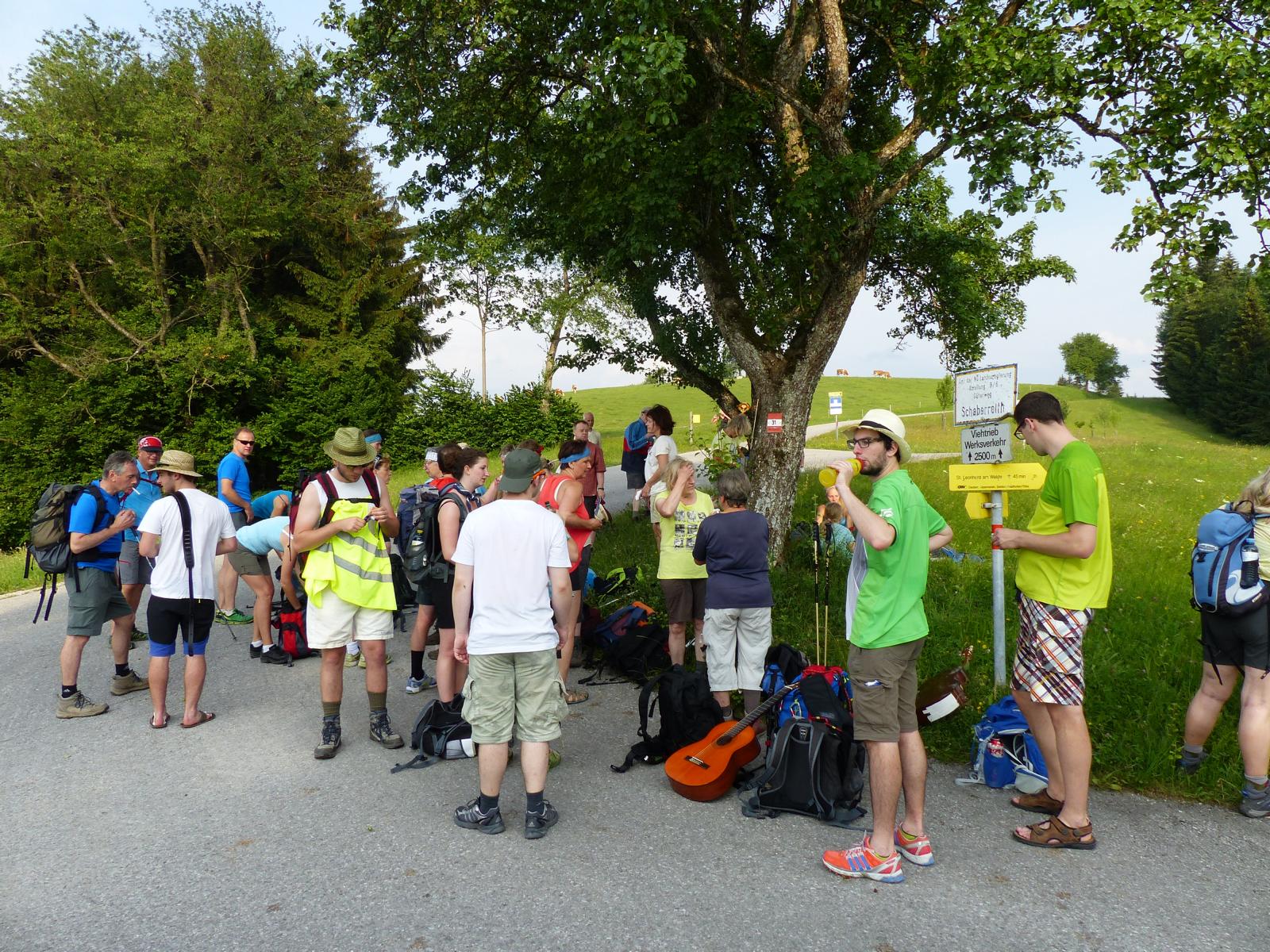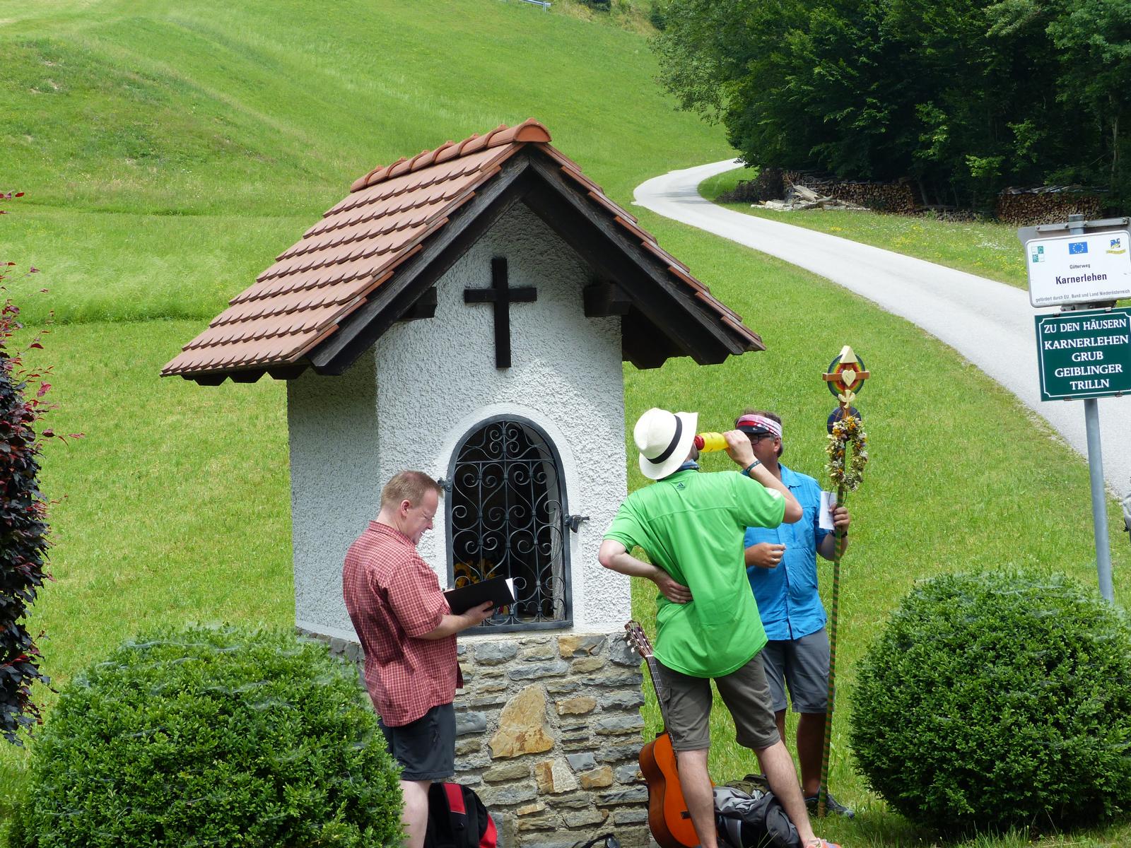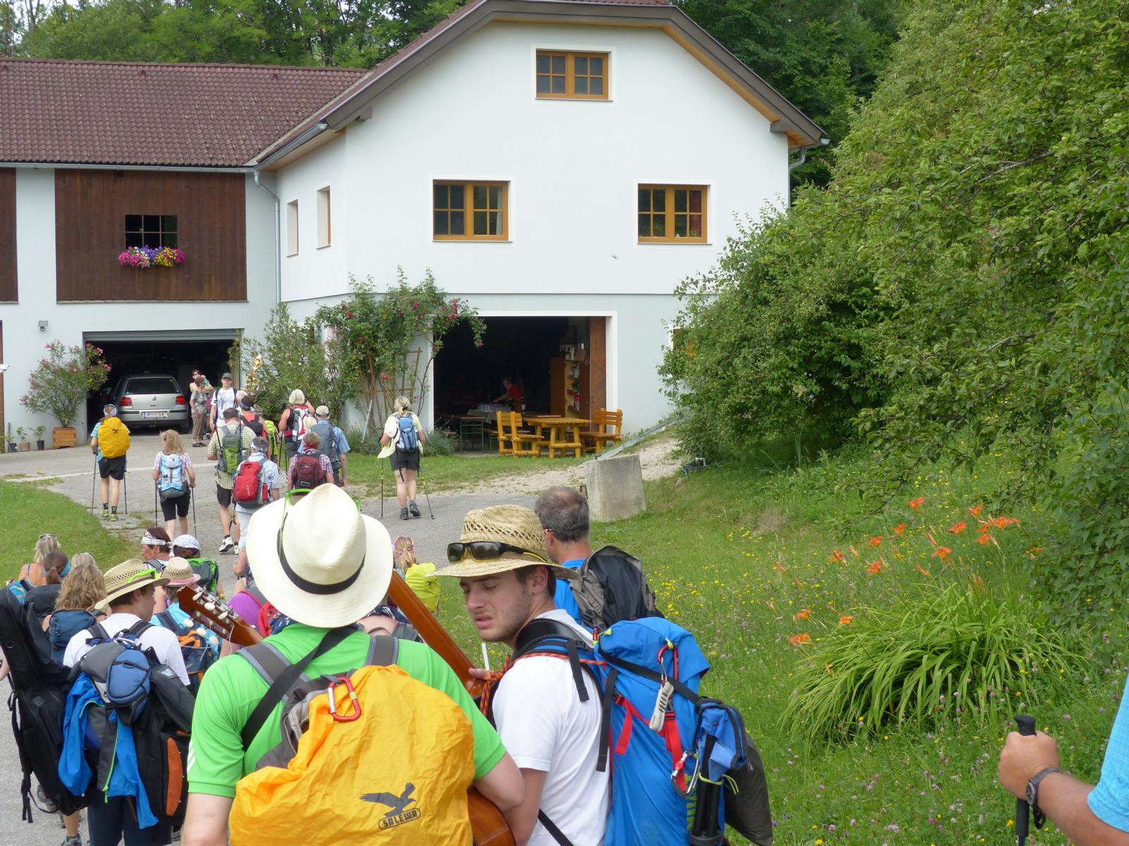 Ebenso ein Fixpunkt der alljährlichen Wanderung ist die Rast beim „Mostbauern“. Heuer wurde von P. Michael übrigens klargestellt, dass der „Mostbauer“ in Wirklichkeit „Baumgartner“ heißt. Vor dem Mostbauern wartet alljährlich immer schon der örtliche Bäcker mit Kipferl, Schaumrollen und anderem Backwerk auf die Wallfahrer, dazu wird Most von der Familie Baumgartner kredenzt – so auch heuer.