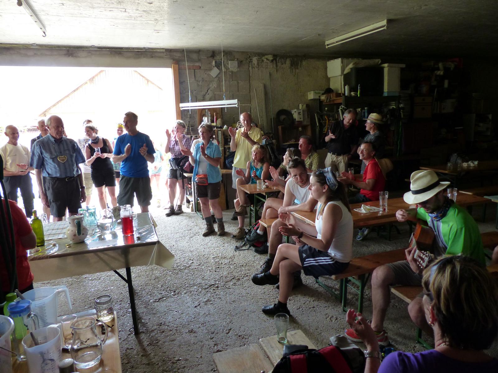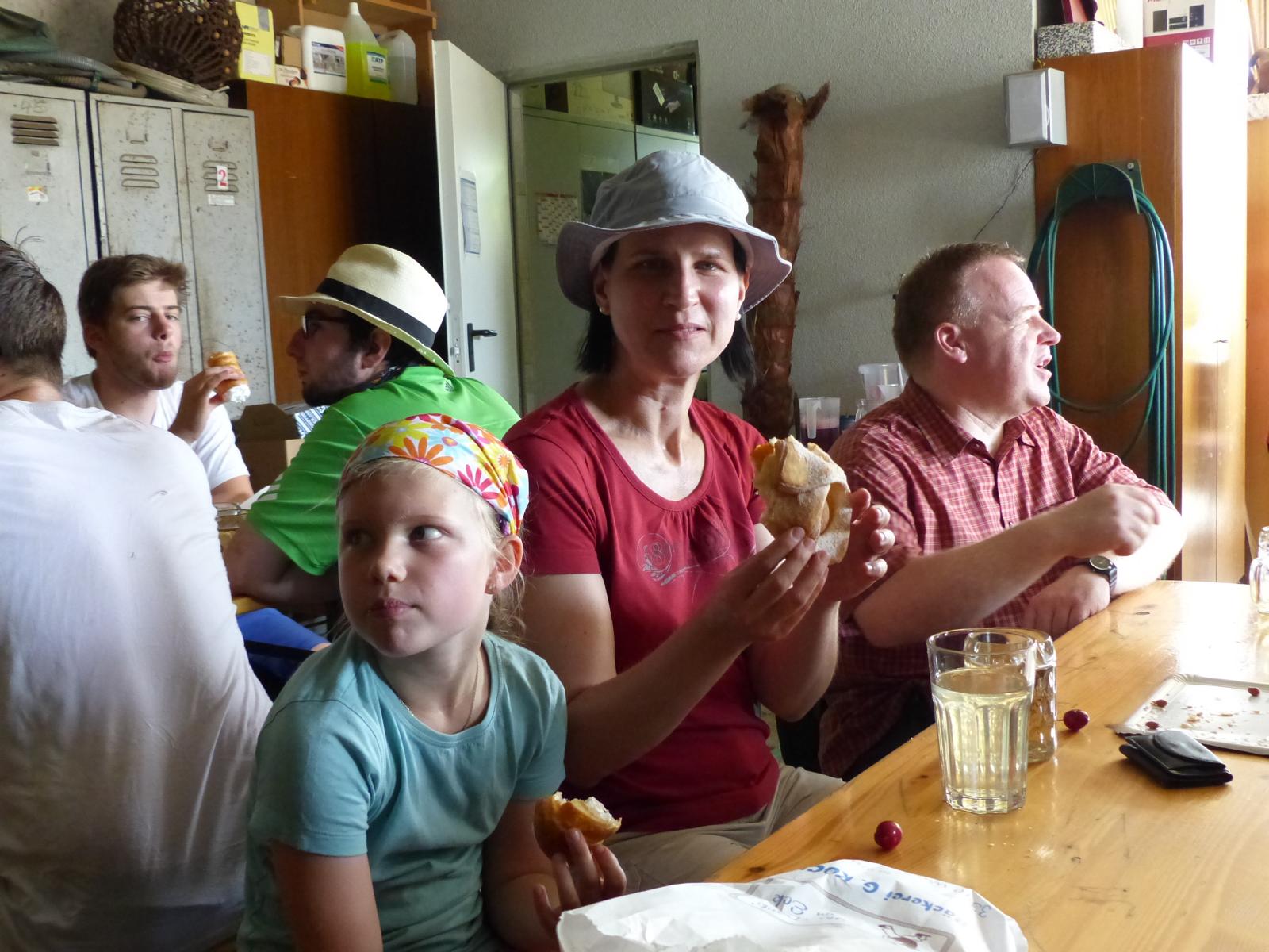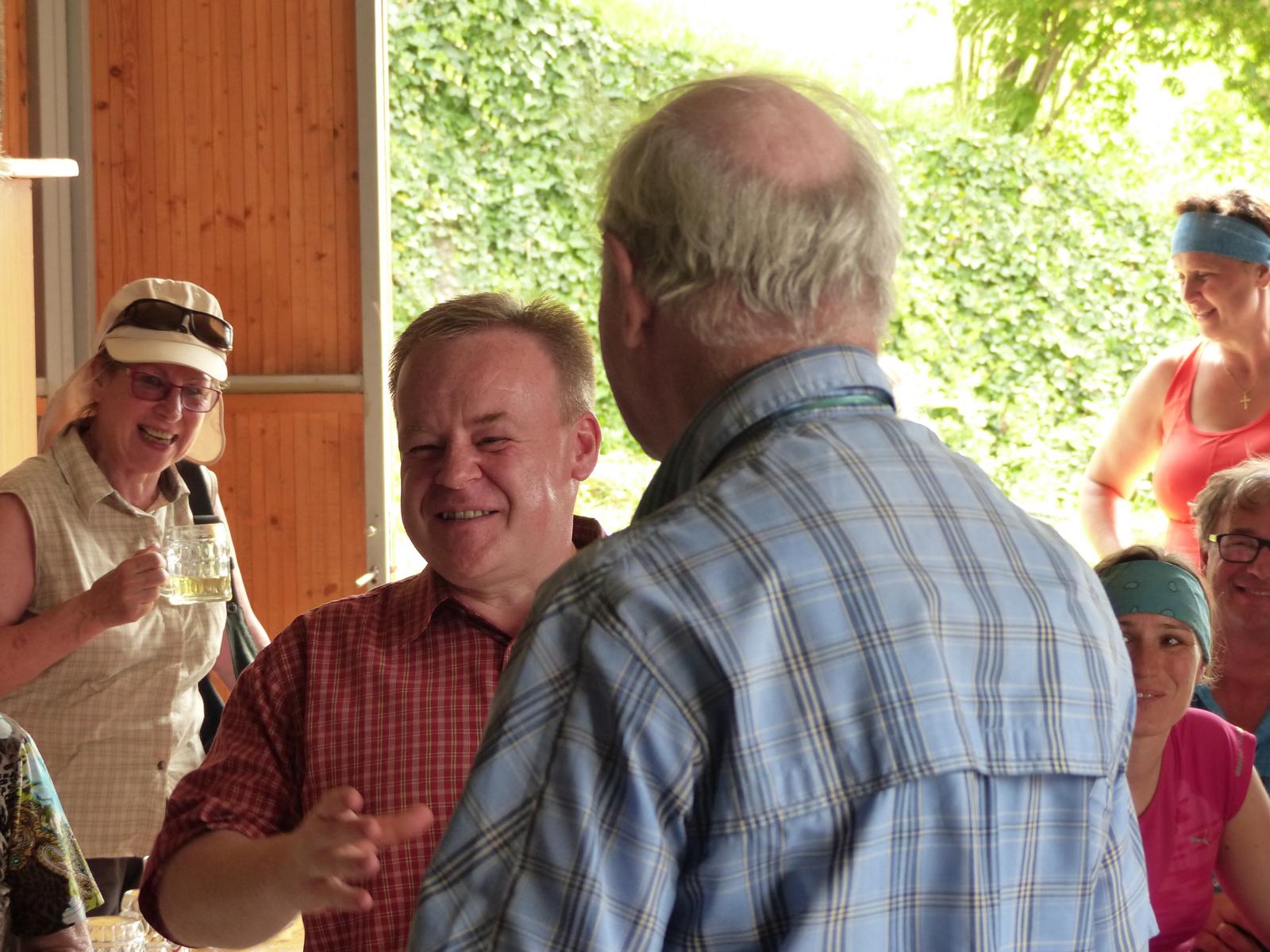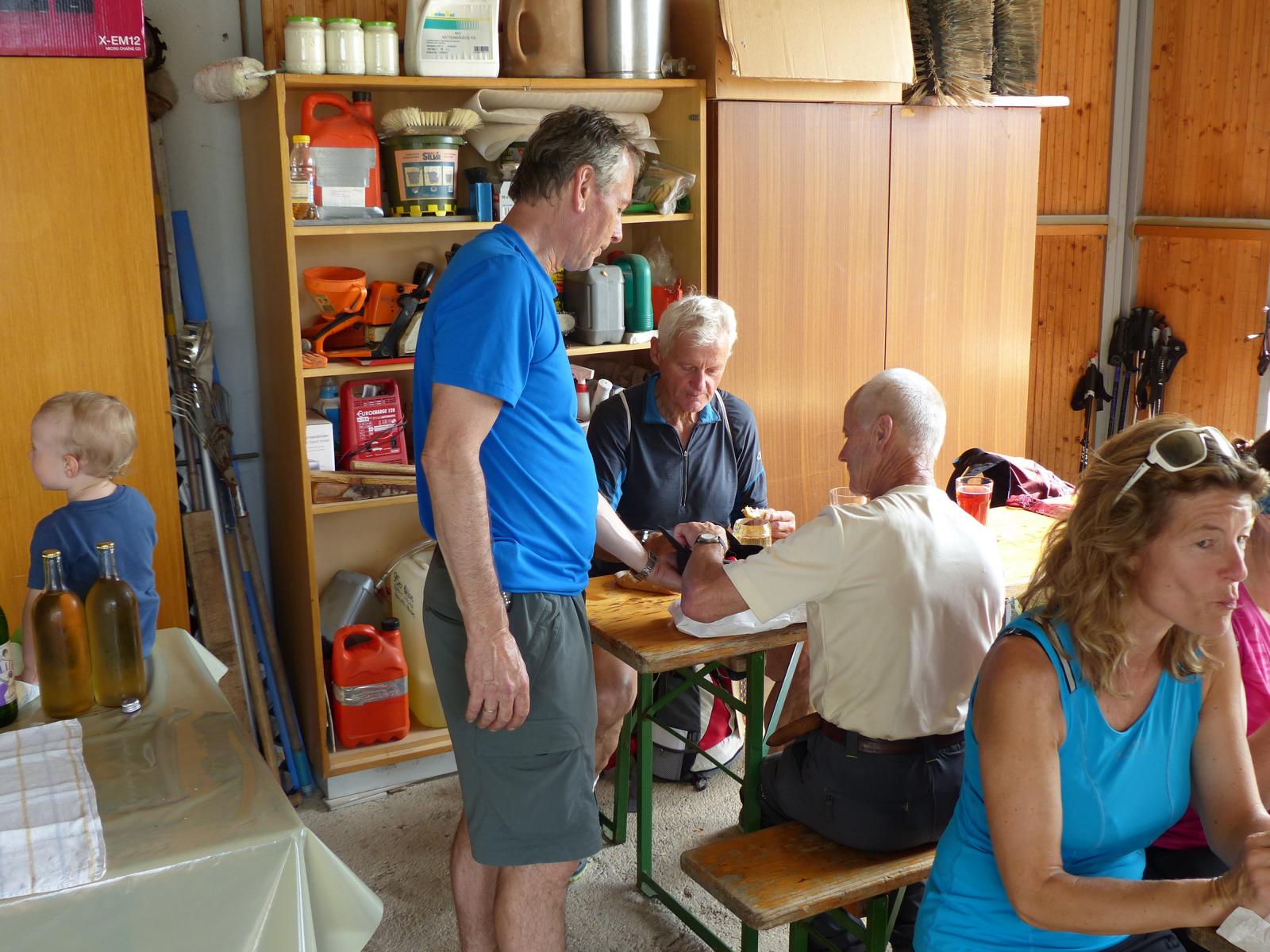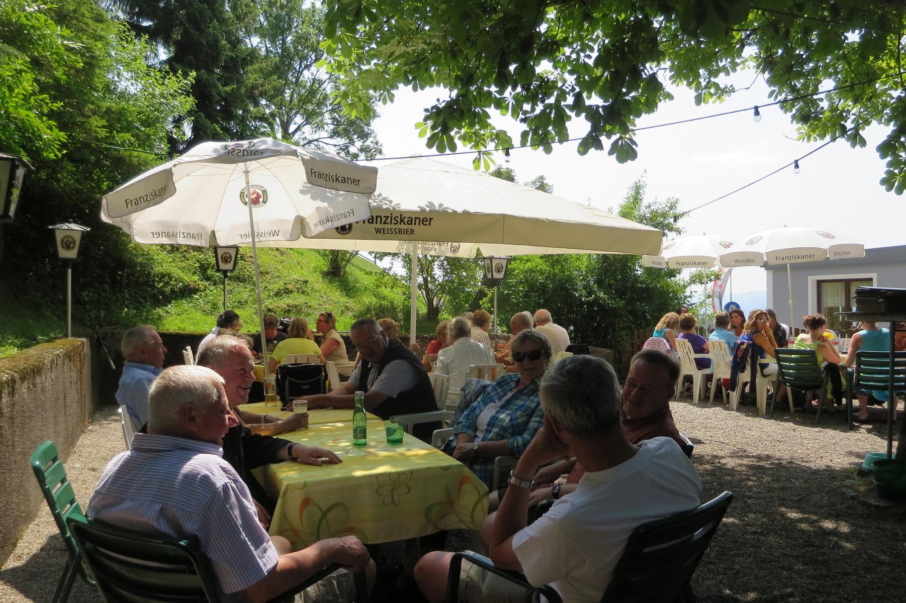 Ebenso ein Fixpunkt der alljährlichen Wanderung ist die Rast beim „Mostbauern“. Heuer wurde von P. Michael übrigens klargestellt, dass der „Mostbauer“ in Wirklichkeit „Baumgartner“ heißt. Vor dem Mostbauern wartet alljährlich immer schon der örtliche Bäcker mit Kipferl, Schaumrollen und anderem Backwerk auf die Wallfahrer, dazu wird Most von der Familie Baumgartner kredenzt – so auch heuer.