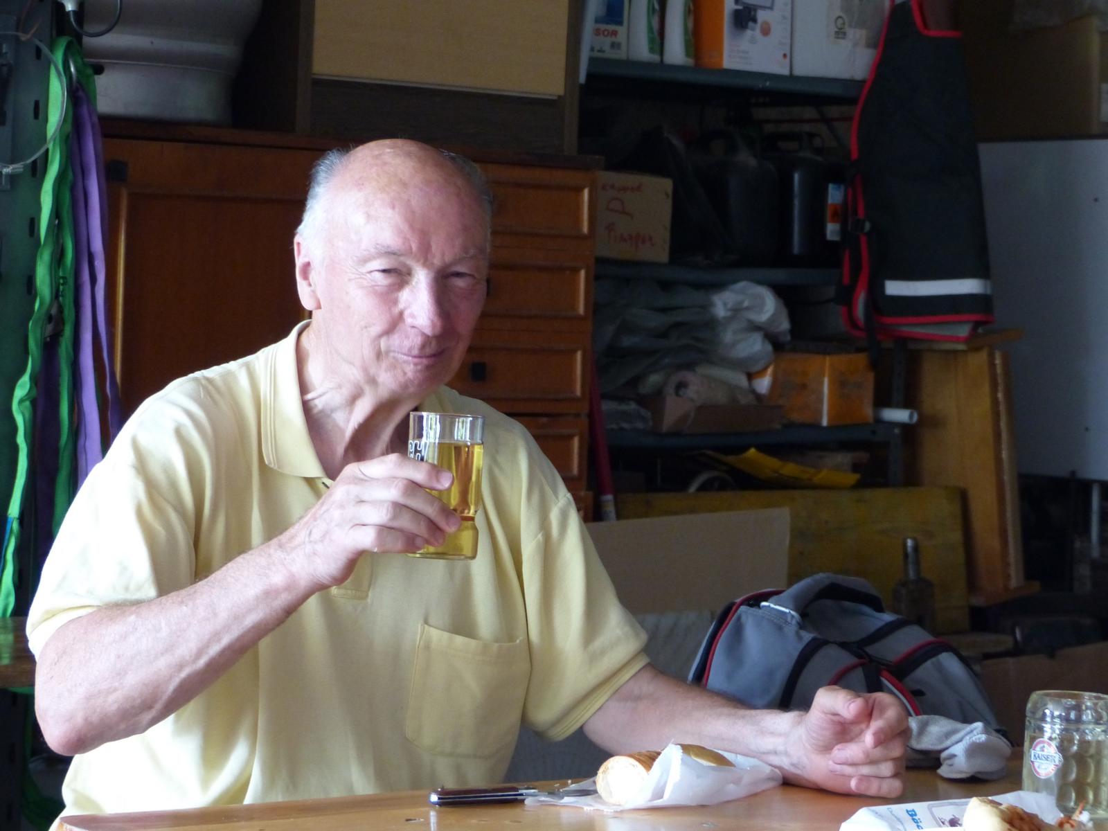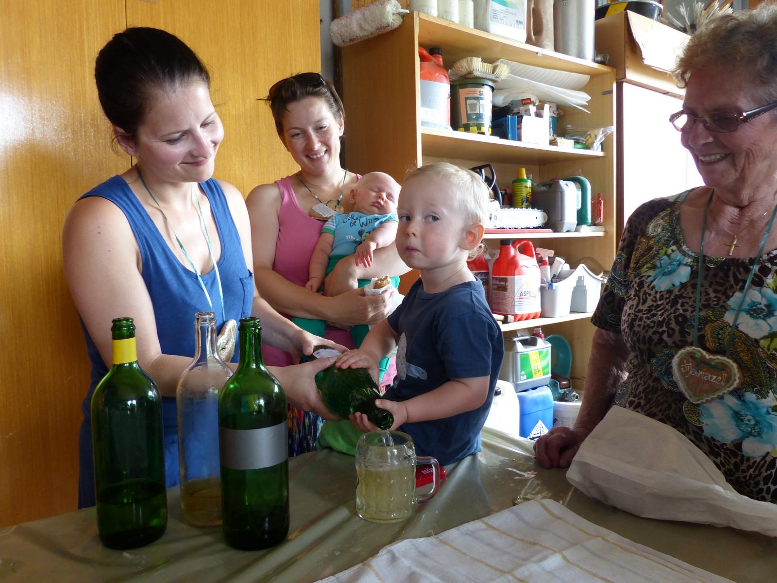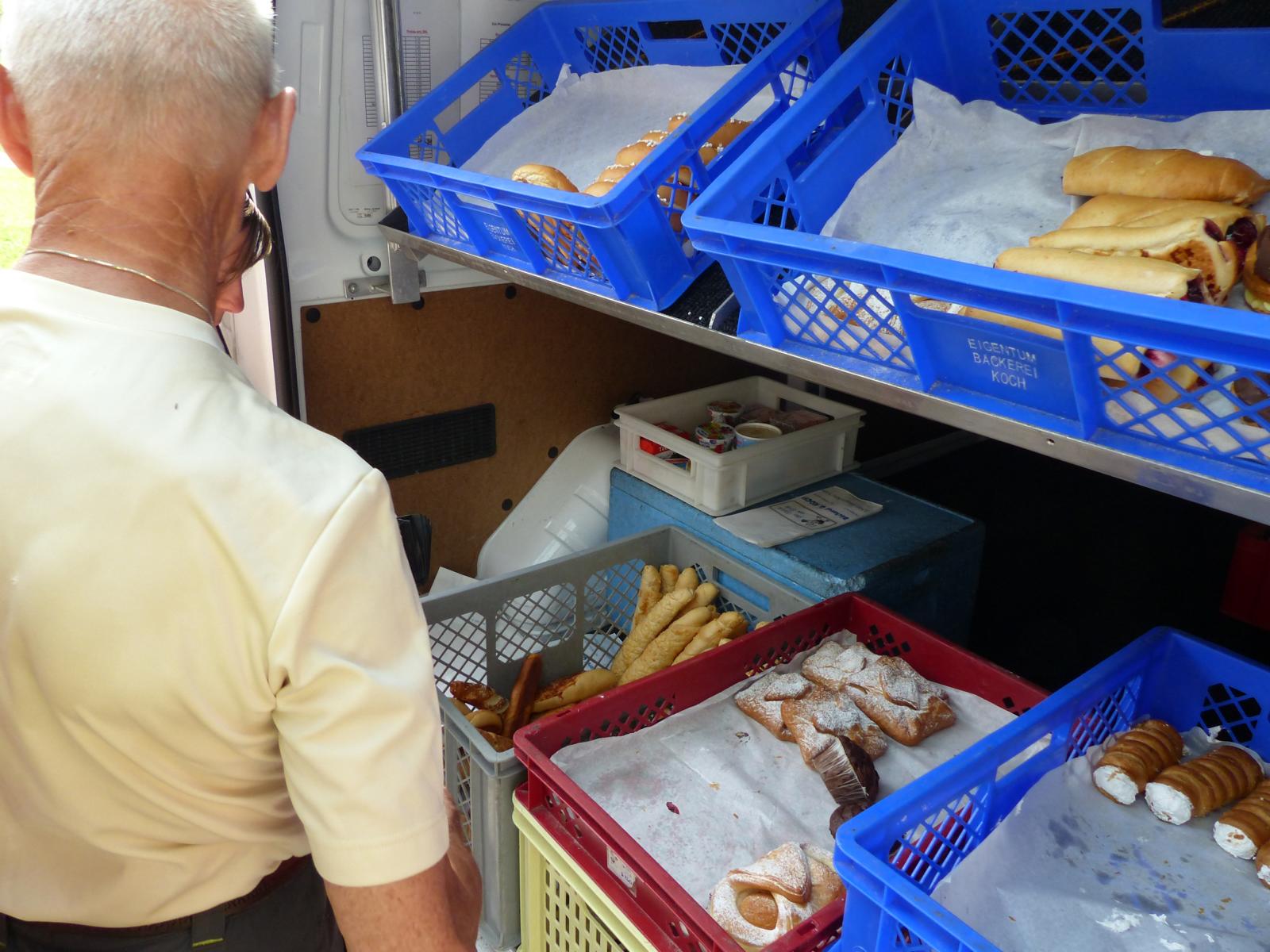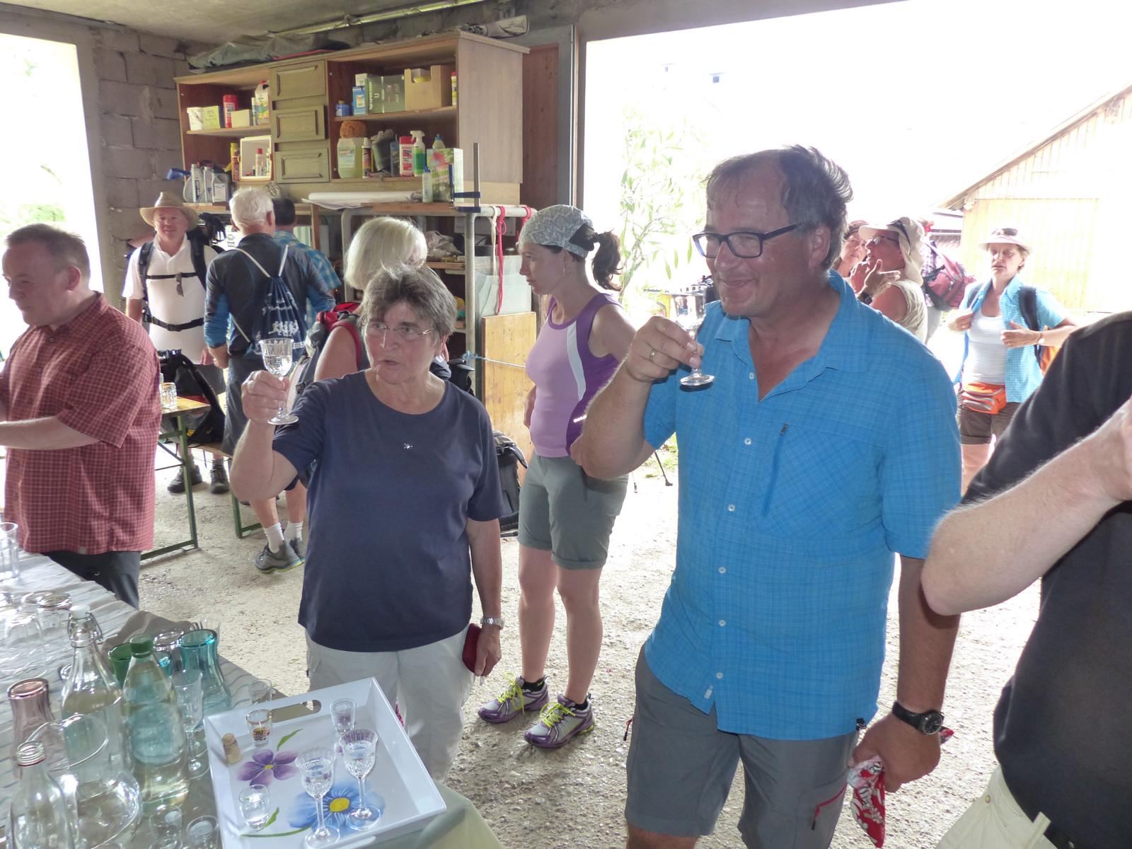 Ebenso ein Fixpunkt der alljährlichen Wanderung ist die Rast beim „Mostbauern“. Heuer wurde von P. Michael übrigens klargestellt, dass der „Mostbauer“ in Wirklichkeit „Baumgartner“ heißt. Vor dem Mostbauern wartet alljährlich immer schon der örtliche Bäcker mit Kipferl, Schaumrollen und anderem Backwerk auf die Wallfahrer, dazu wird Most von der Familie Baumgartner kredenzt – so auch heuer.