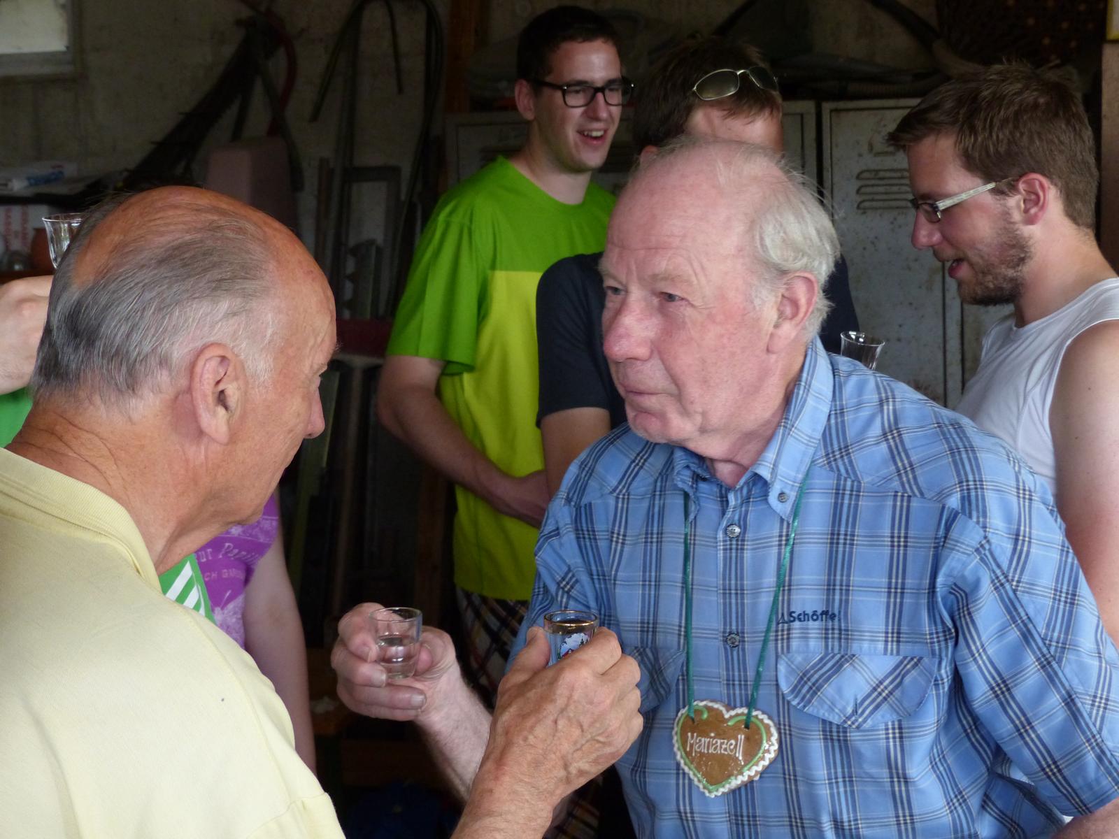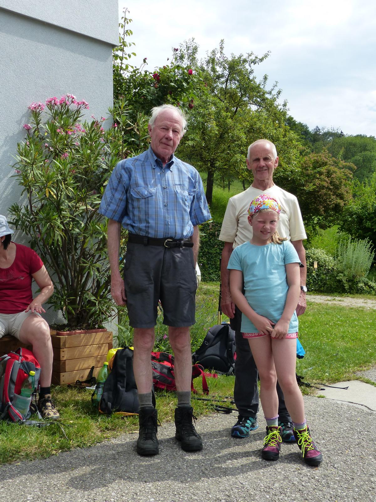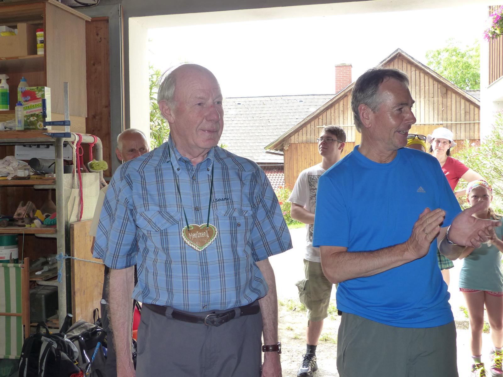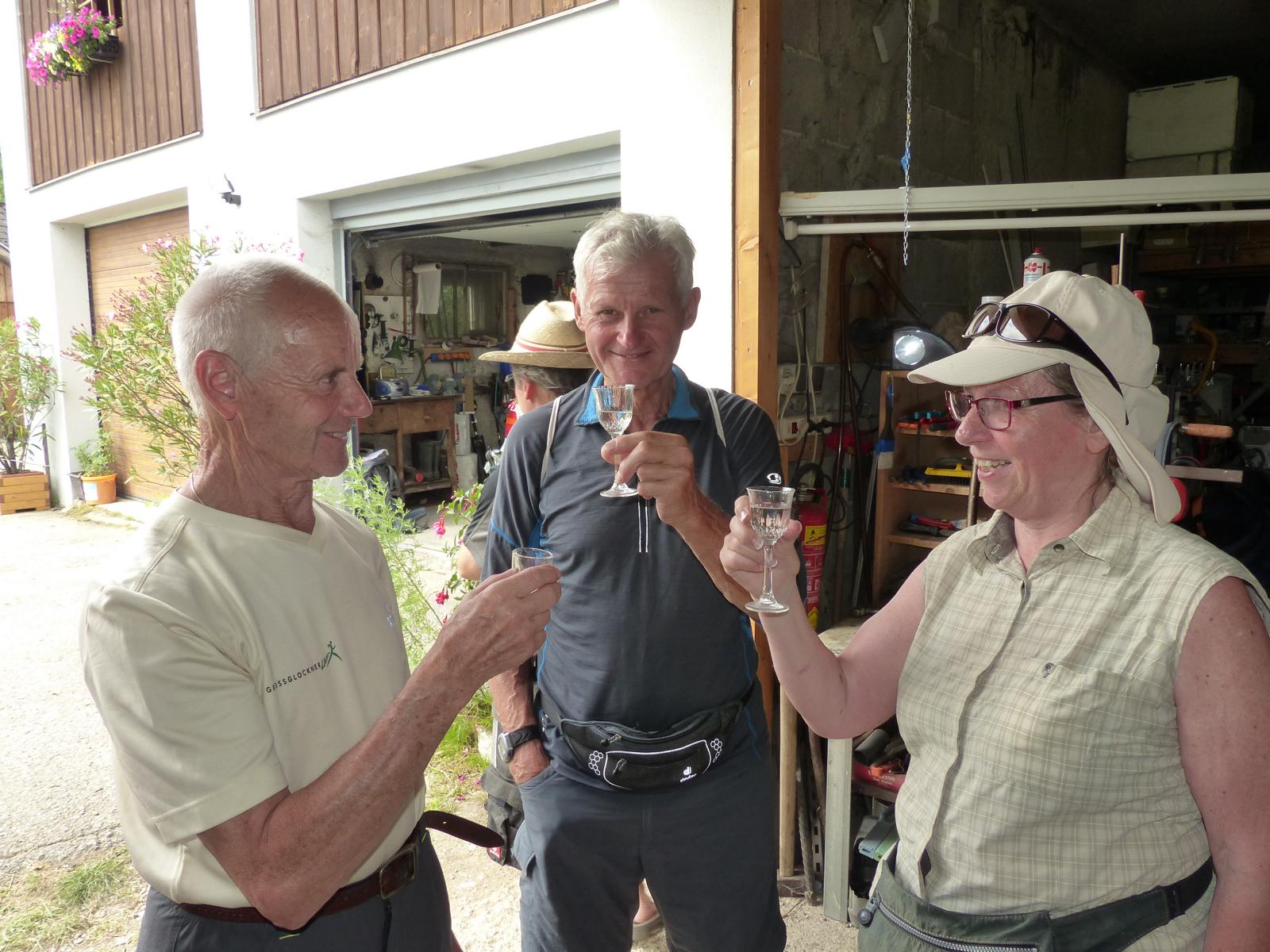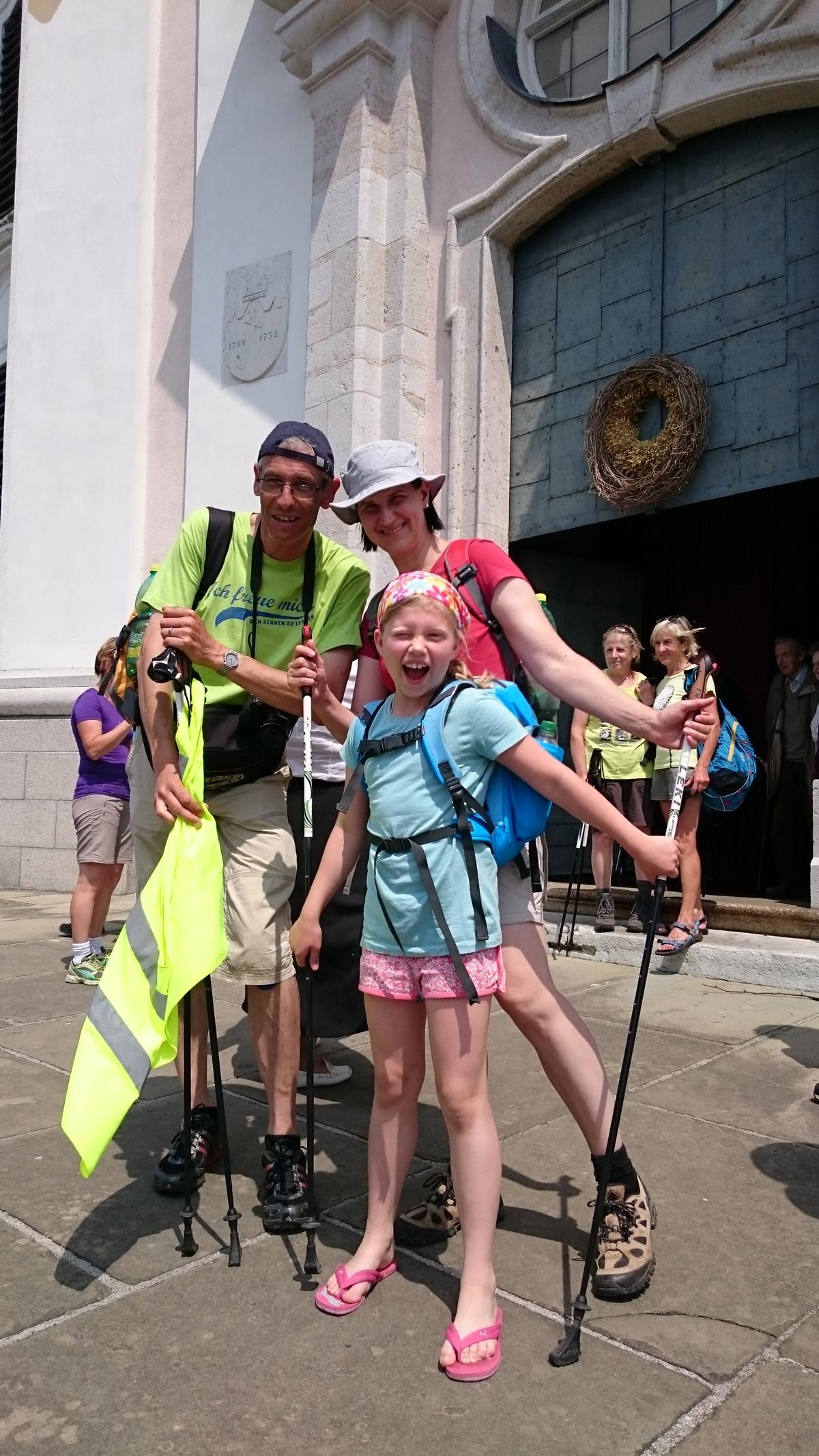 Dabei wurde auch Otmar Hollerer zum 80. Geburtstag gratuliert – der wiederum gab eine Runde Schnapserl aus und posierte gemeinsam mit dem mit 81 Jahren ältesten Wallfahrer Hans Abl und der mit 8 Jahren jüngsten Teilnehmerin Emma Saria-Girrer zum Fotoshooting. 73 Jahre Altersunterschied in der gleichen Wallfahrtsgruppe!